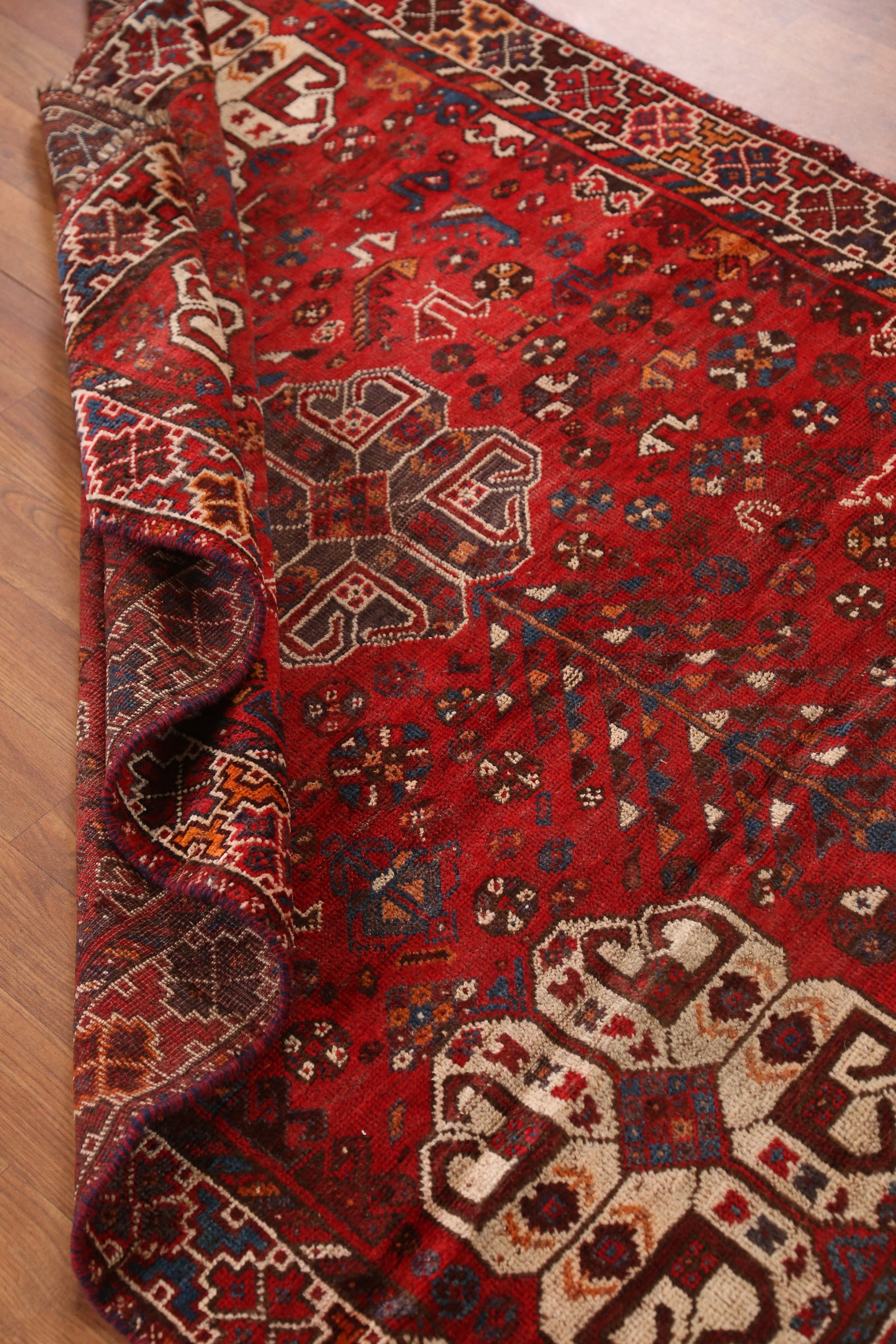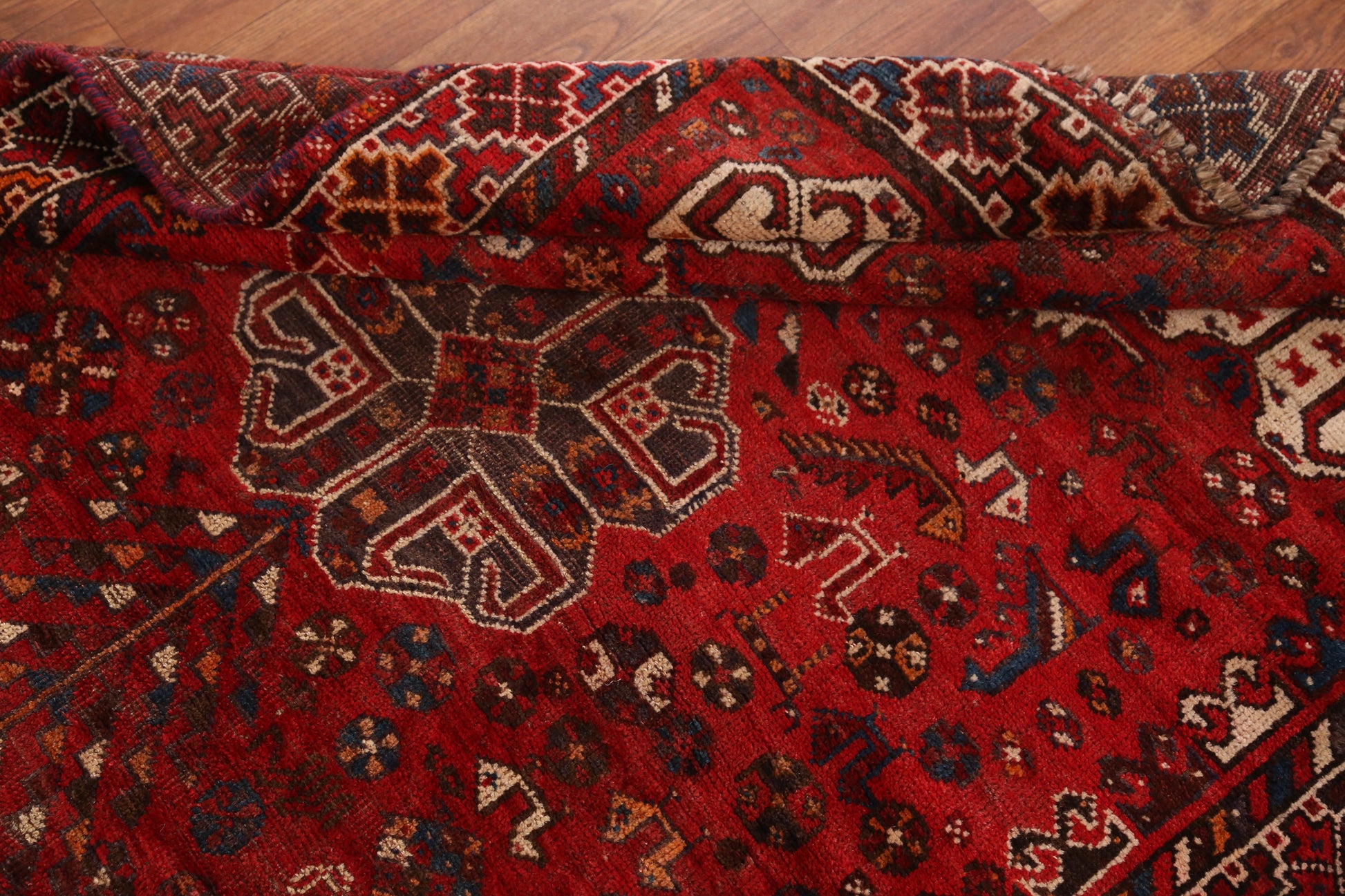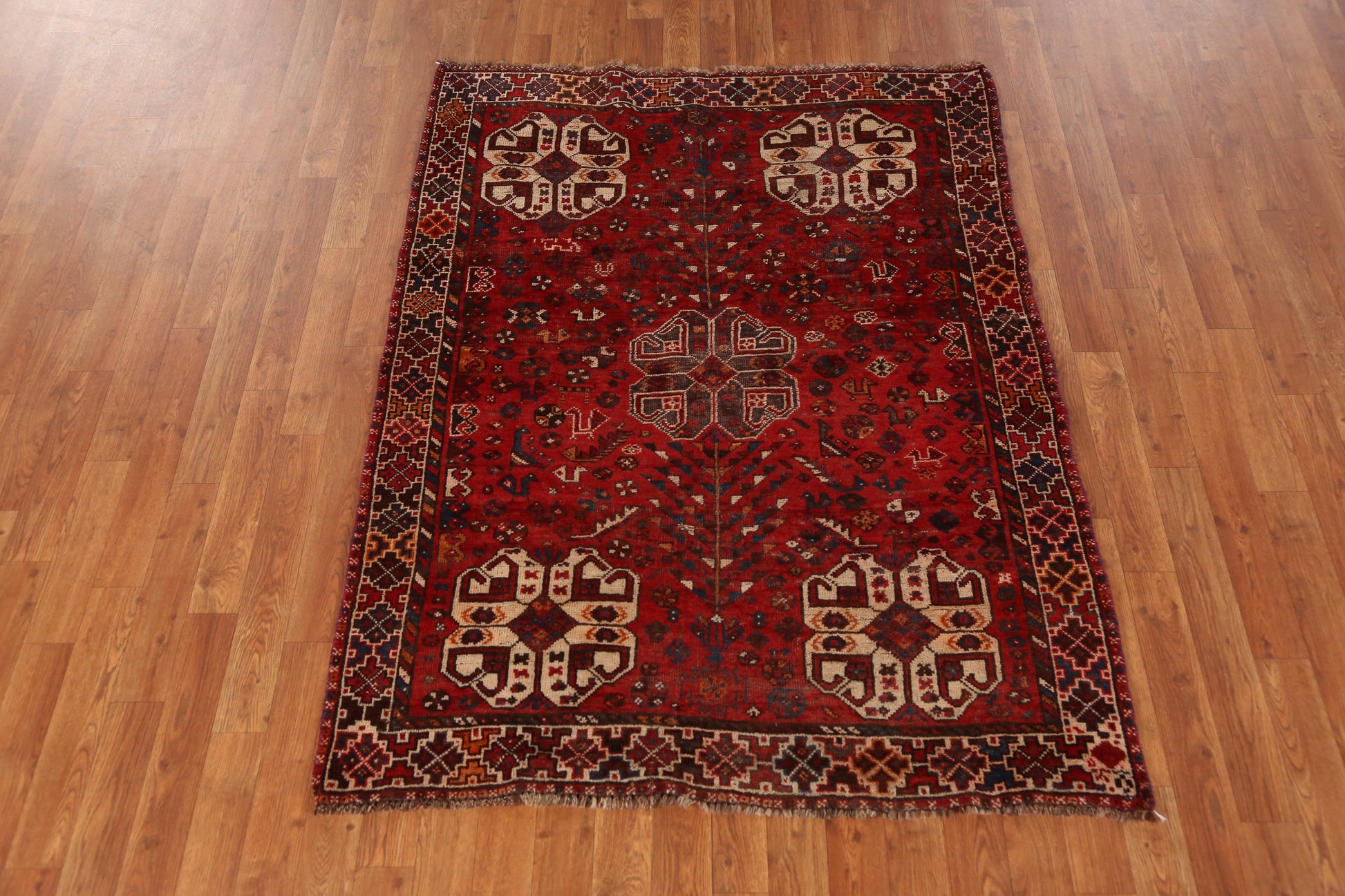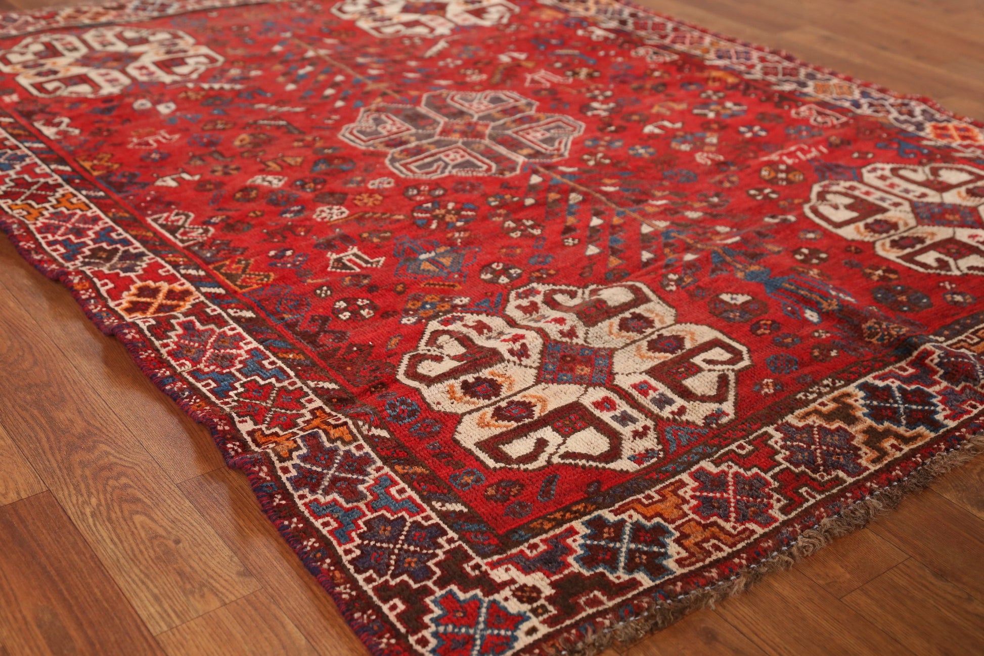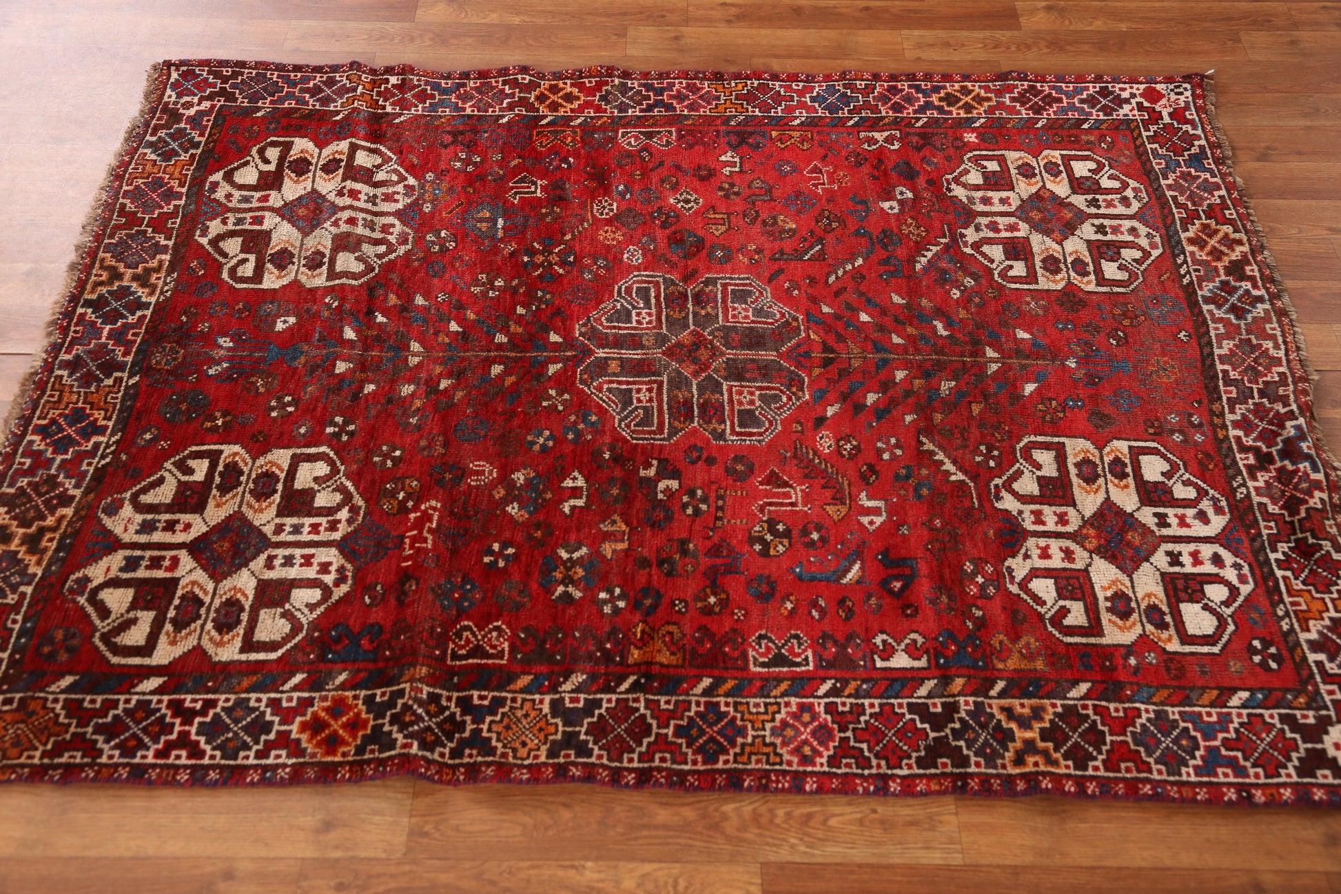 A Beautiful Genuine Persia ( Persia ) Shiraz rug is Hand Knotted by skillful weavers in Persia ( Persia ) with 100% Wool Material. This rug is in Very Good ( Low Pile ) condition. dimensions are 5' 4'' X 4' 0'' in foot and 163 X 122 in centimeter. the primary color is Red.