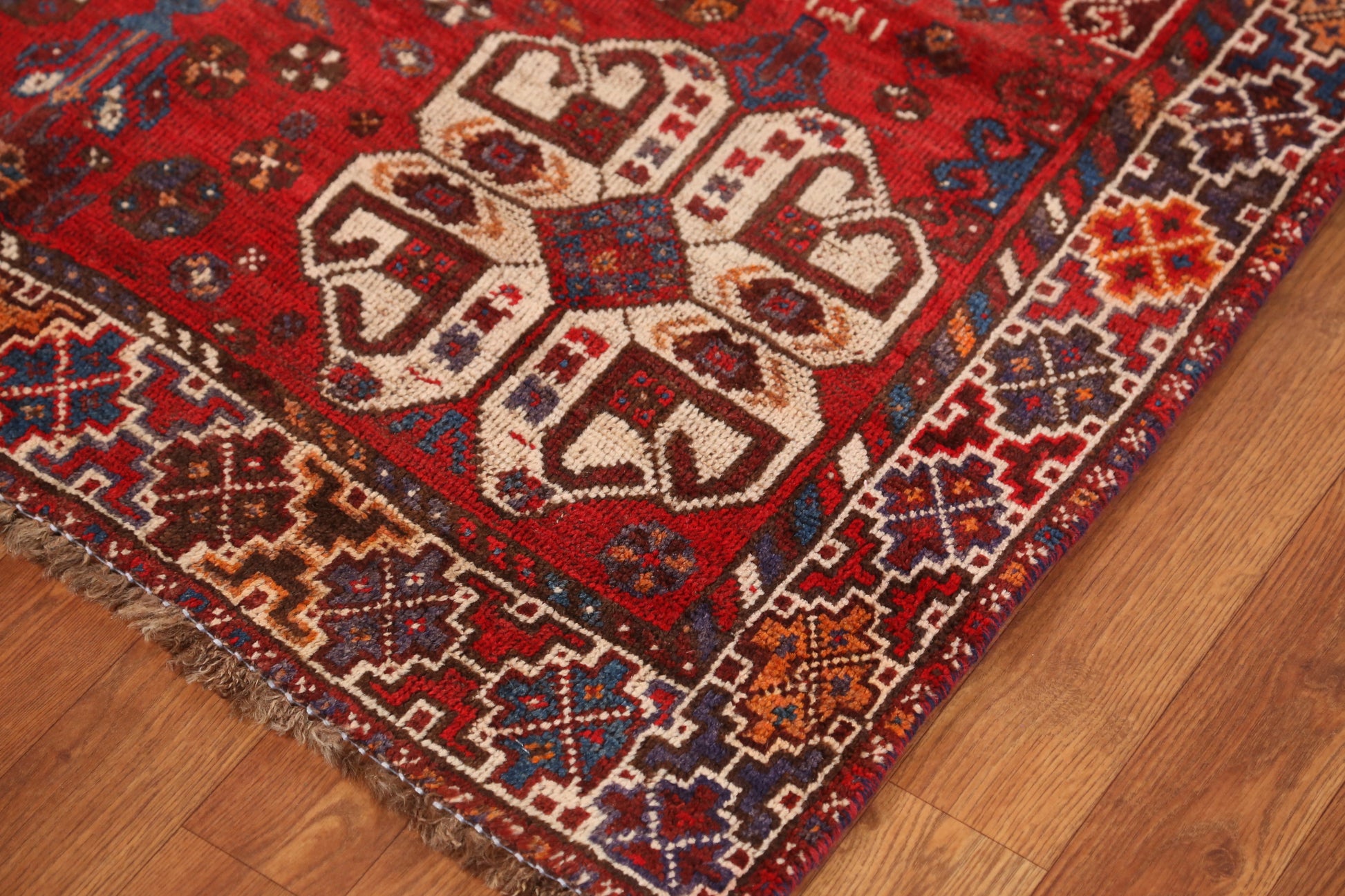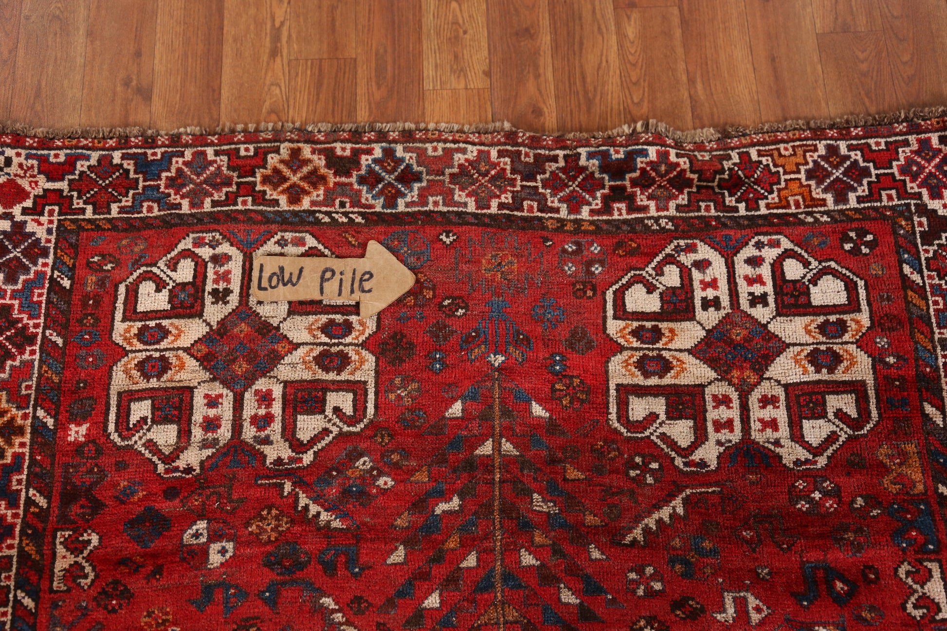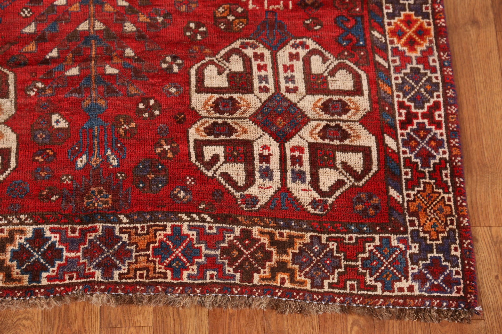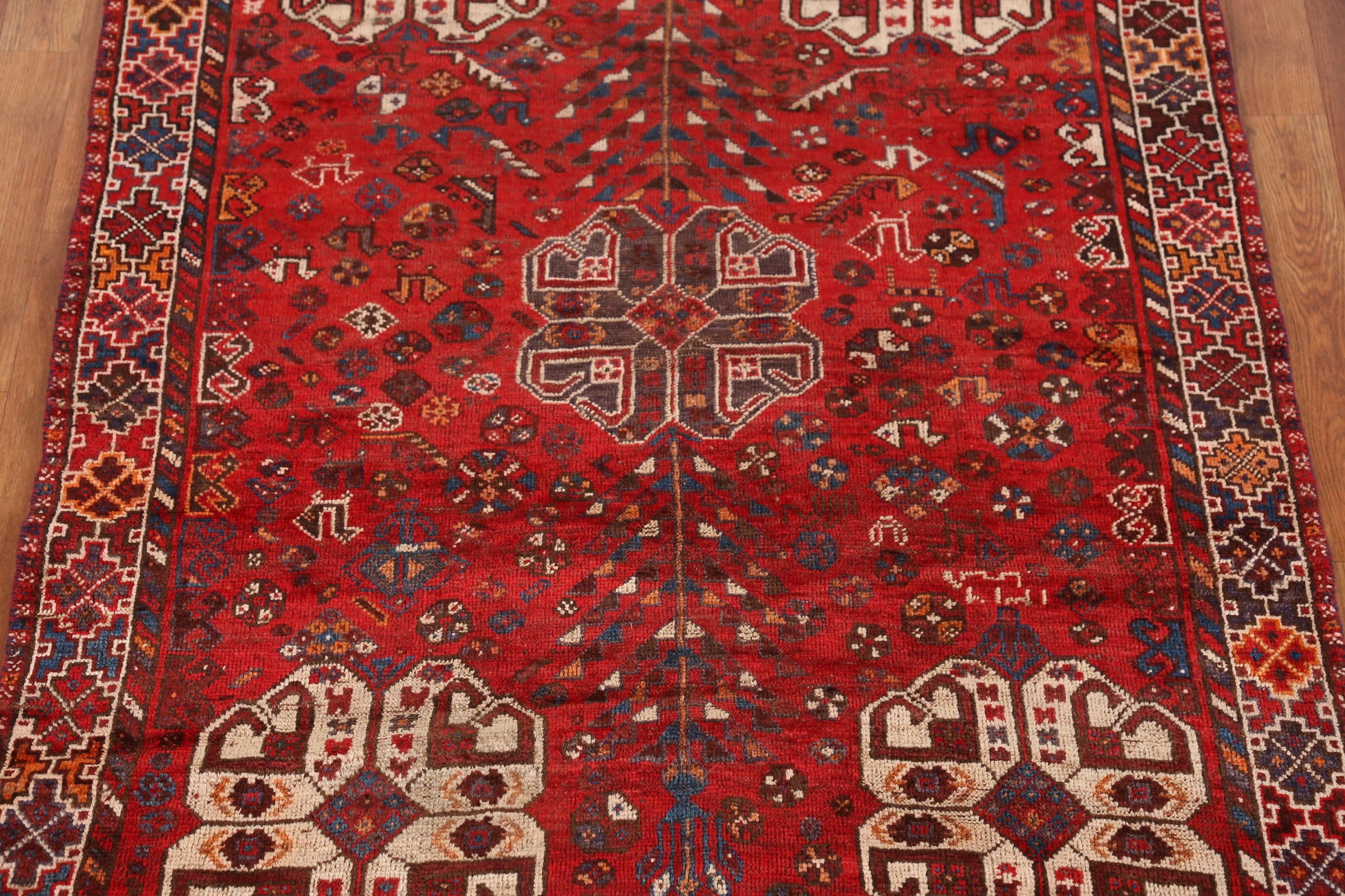 A Beautiful Genuine Persia ( Persia ) Shiraz rug is Hand Knotted by skillful weavers in Persia ( Persia ) with 100% Wool Material. This rug is in Very Good ( Low Pile ) condition. dimensions are 5' 4'' X 4' 0'' in foot and 163 X 122 in centimeter. the primary color is Red.