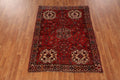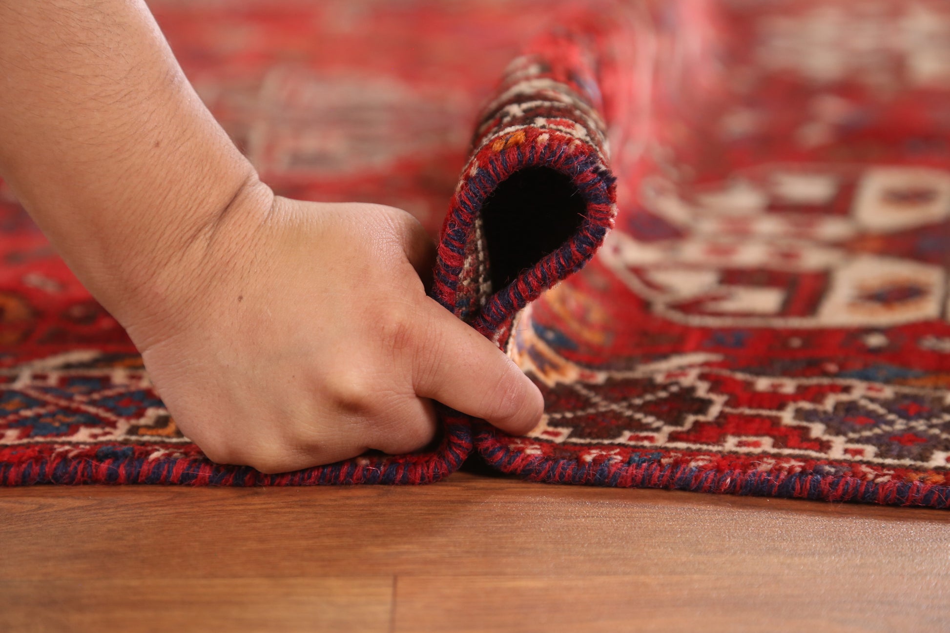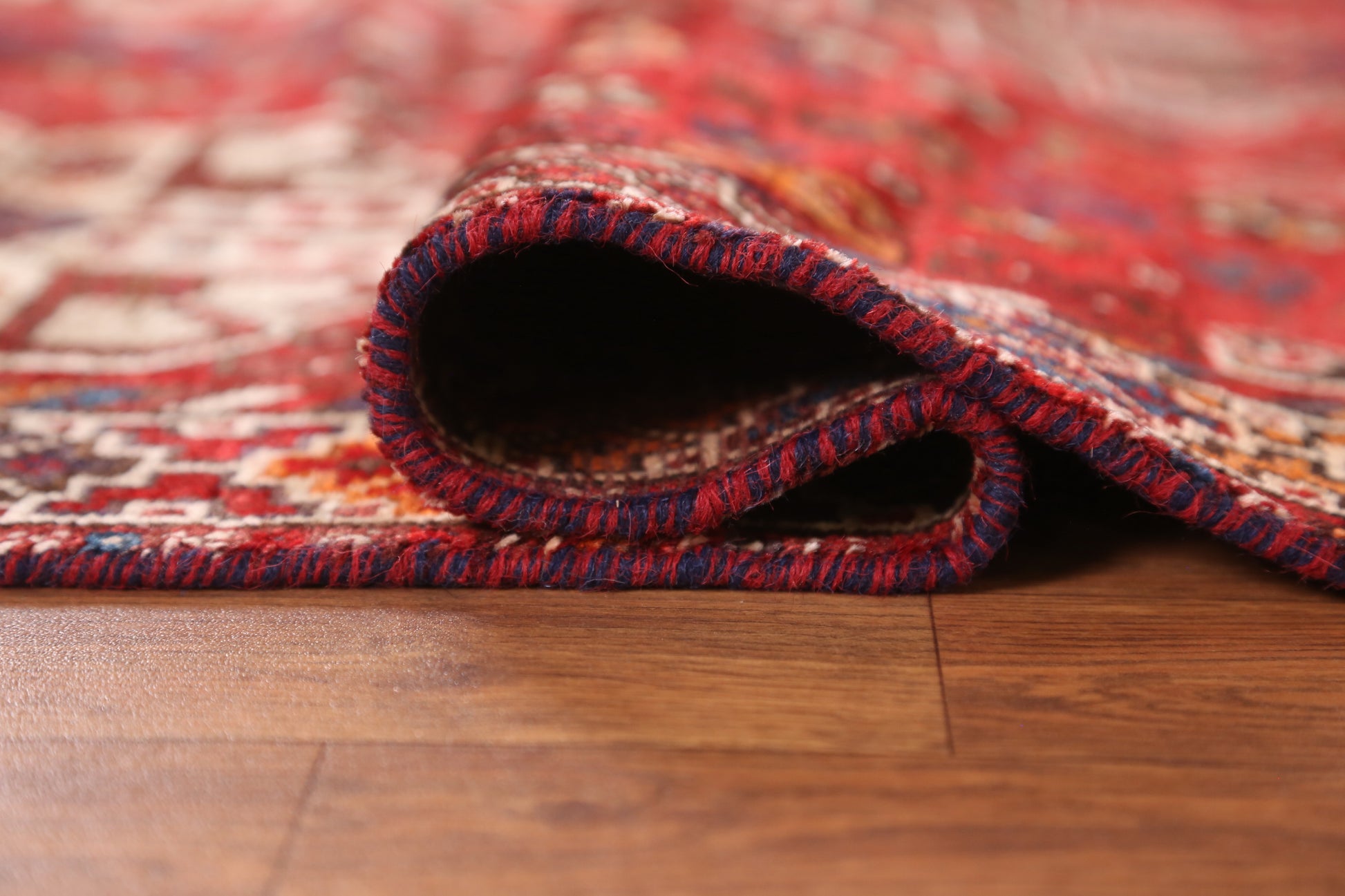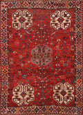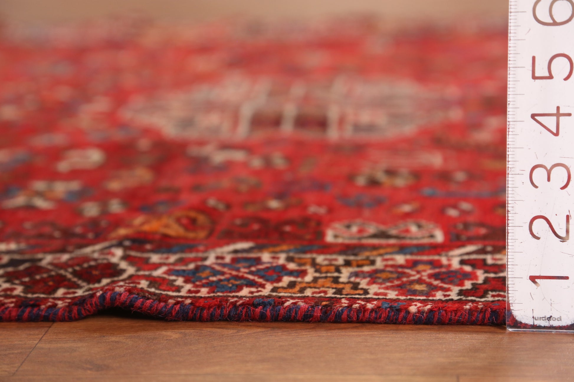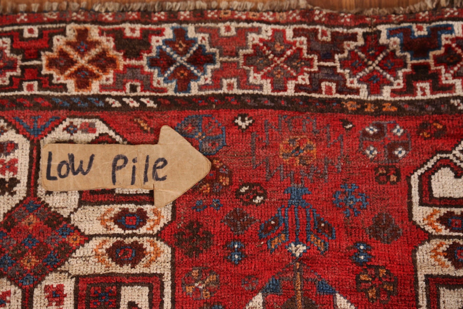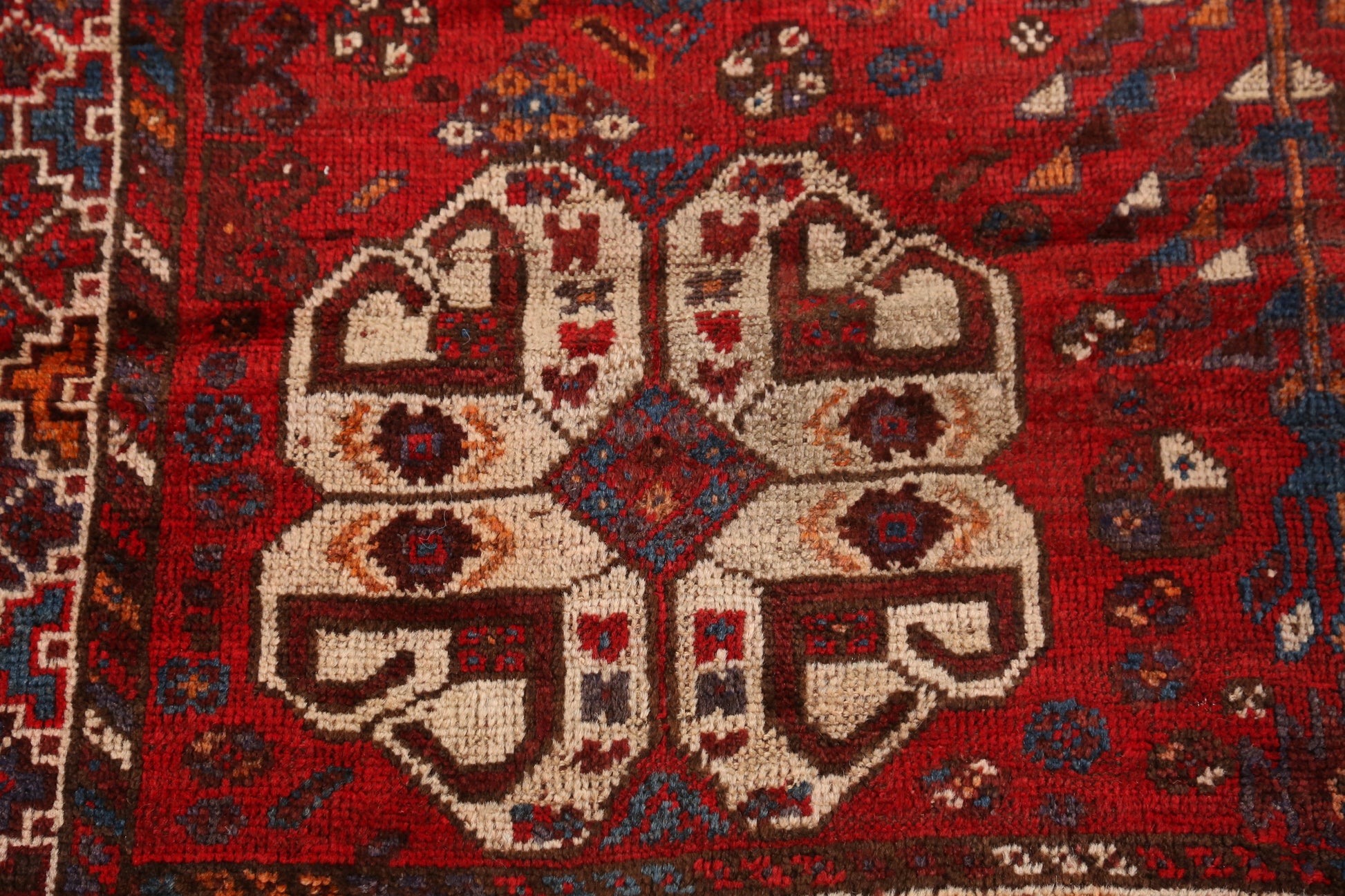 A Beautiful Genuine Persia ( Persia ) Shiraz rug is Hand Knotted by skillful weavers in Persia ( Persia ) with 100% Wool Material. This rug is in Very Good ( Low Pile ) condition. dimensions are 5' 4'' X 4' 0'' in foot and 163 X 122 in centimeter. the primary color is Red.