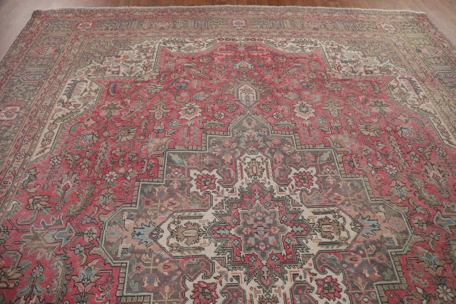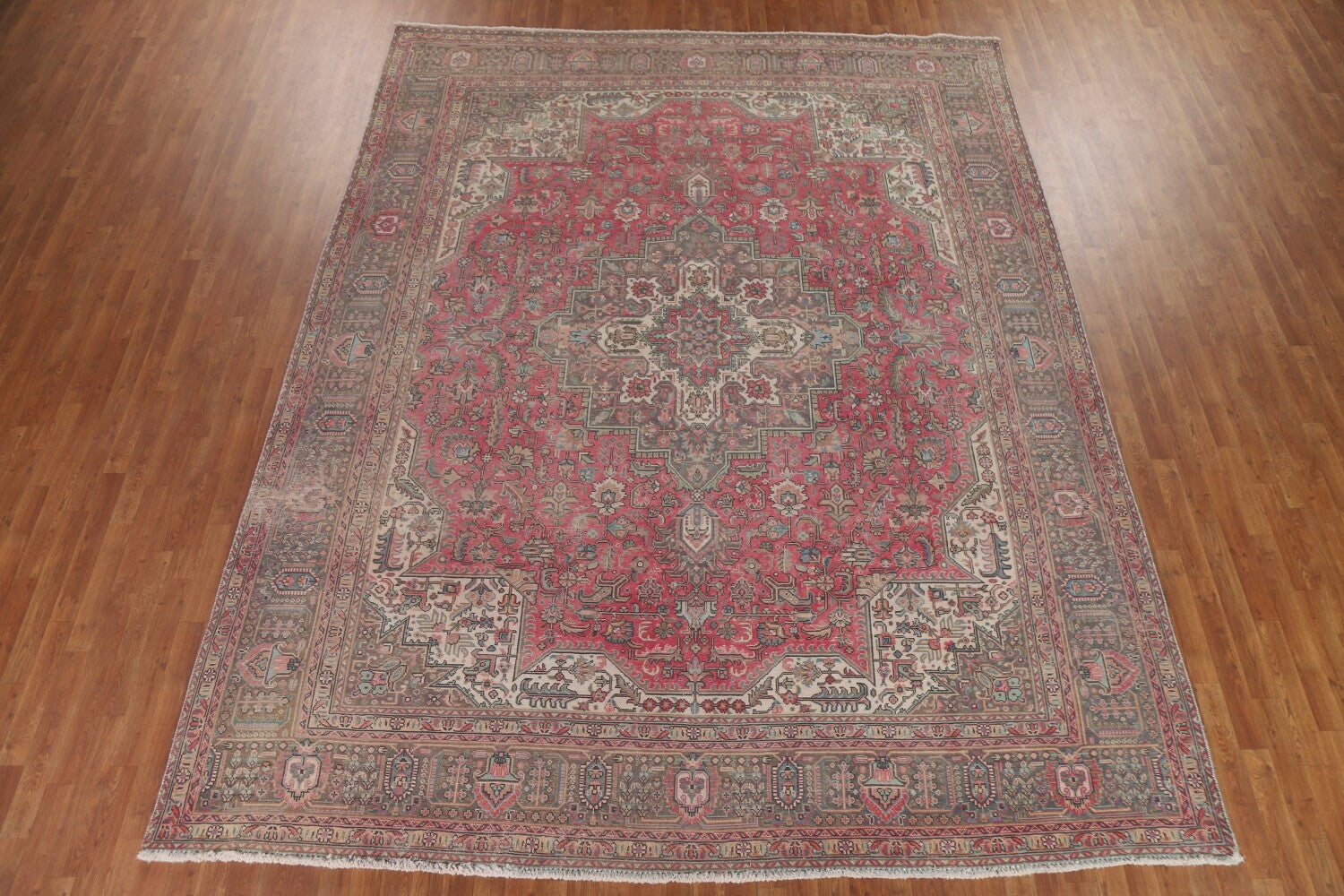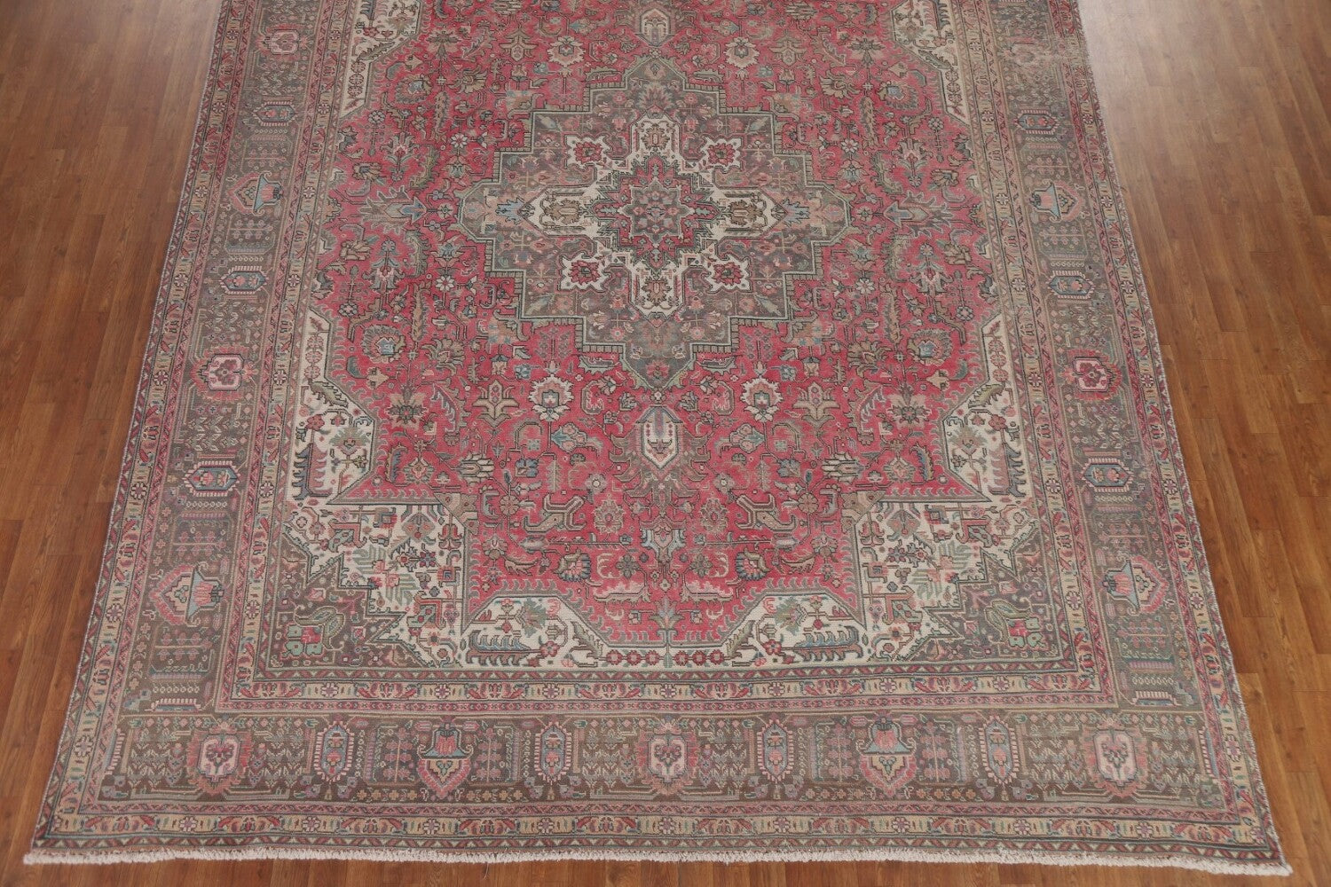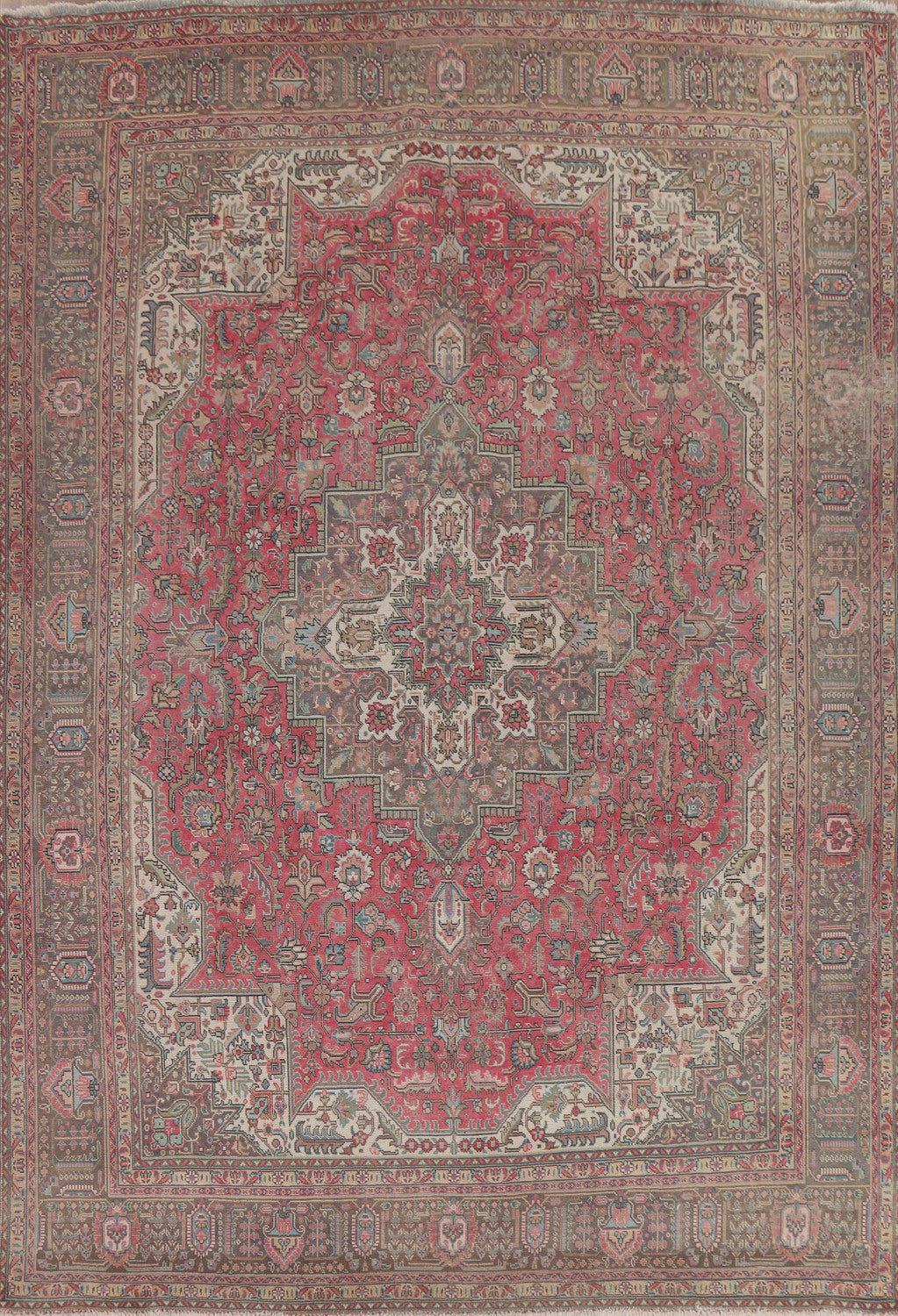 A Beautiful Genuine Persia ( Persia ) Tabriz rug is Hand Knotted by skillful weavers in Persia ( Persia ) with 100% Wool Material. This rug is in Very Good (Low Pile) condition. dimensions are 12' 3'' X 9' 7'' in foot and 373 X 292 in centimeter. the primary color is Pink.