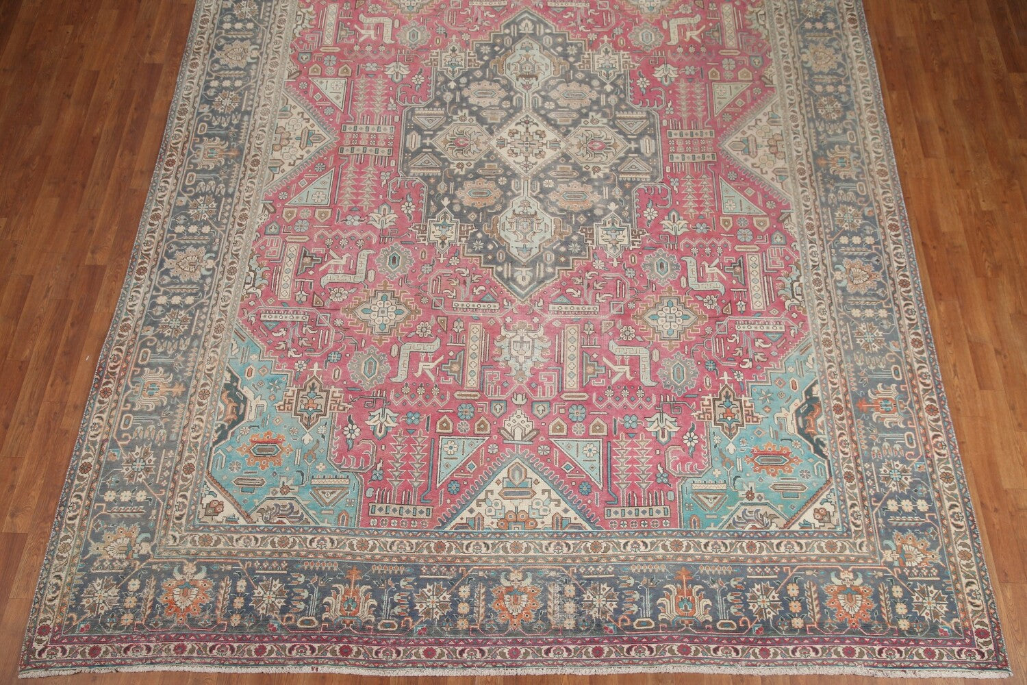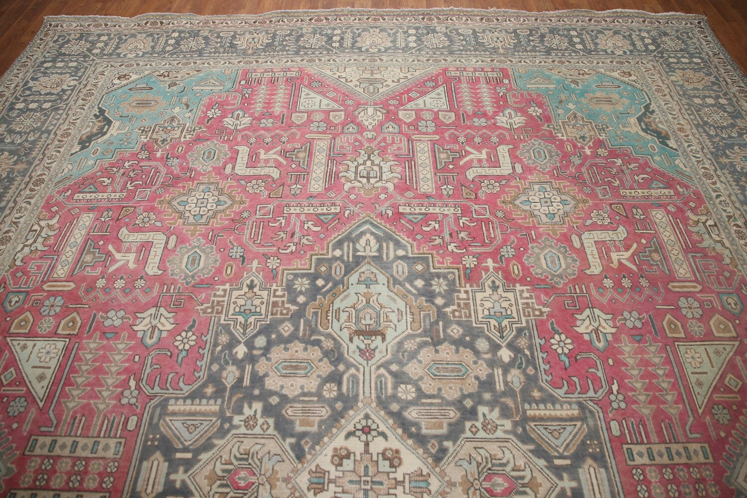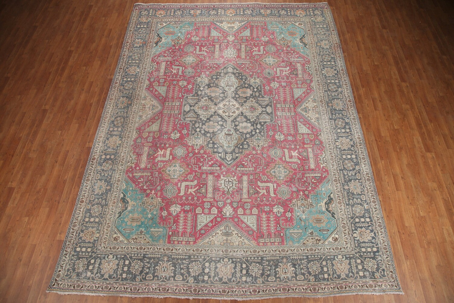 A Beautiful Genuine Persia ( Persia ) Tabriz rug is Hand Knotted by skillful weavers in Persia ( Persia ) with 100% Wool Material. This rug is in Very Good (Evenly Low Pile-Missing Pile) condition. dimensions are 13' 0'' X 9' 6'' in foot and 396 X 290 in centimeter. the primary color is Pink.
