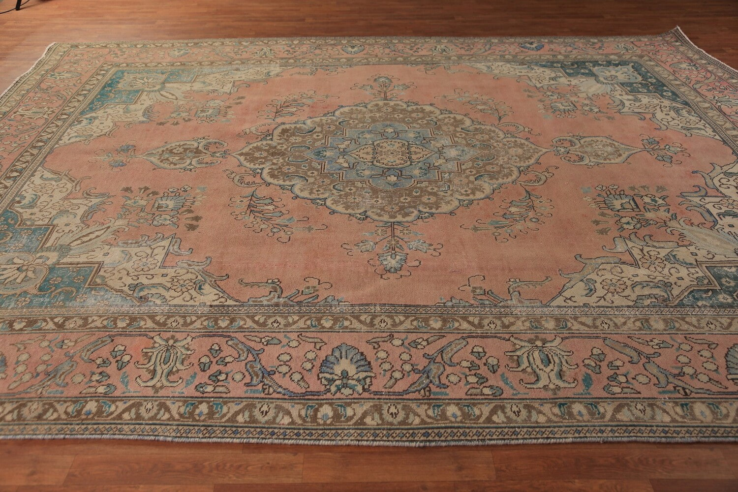 A Beautiful Genuine Persia ( Persia ) Tabriz rug is Hand Knotted by skillful weavers in Persia ( Persia ) with 100% Wool Material. This rug is in Very Good (Evenly Low Pile) condition. dimensions are 12' 8'' X 9' 10'' in foot and 386 X 300 in centimeter. the primary color is Coral.