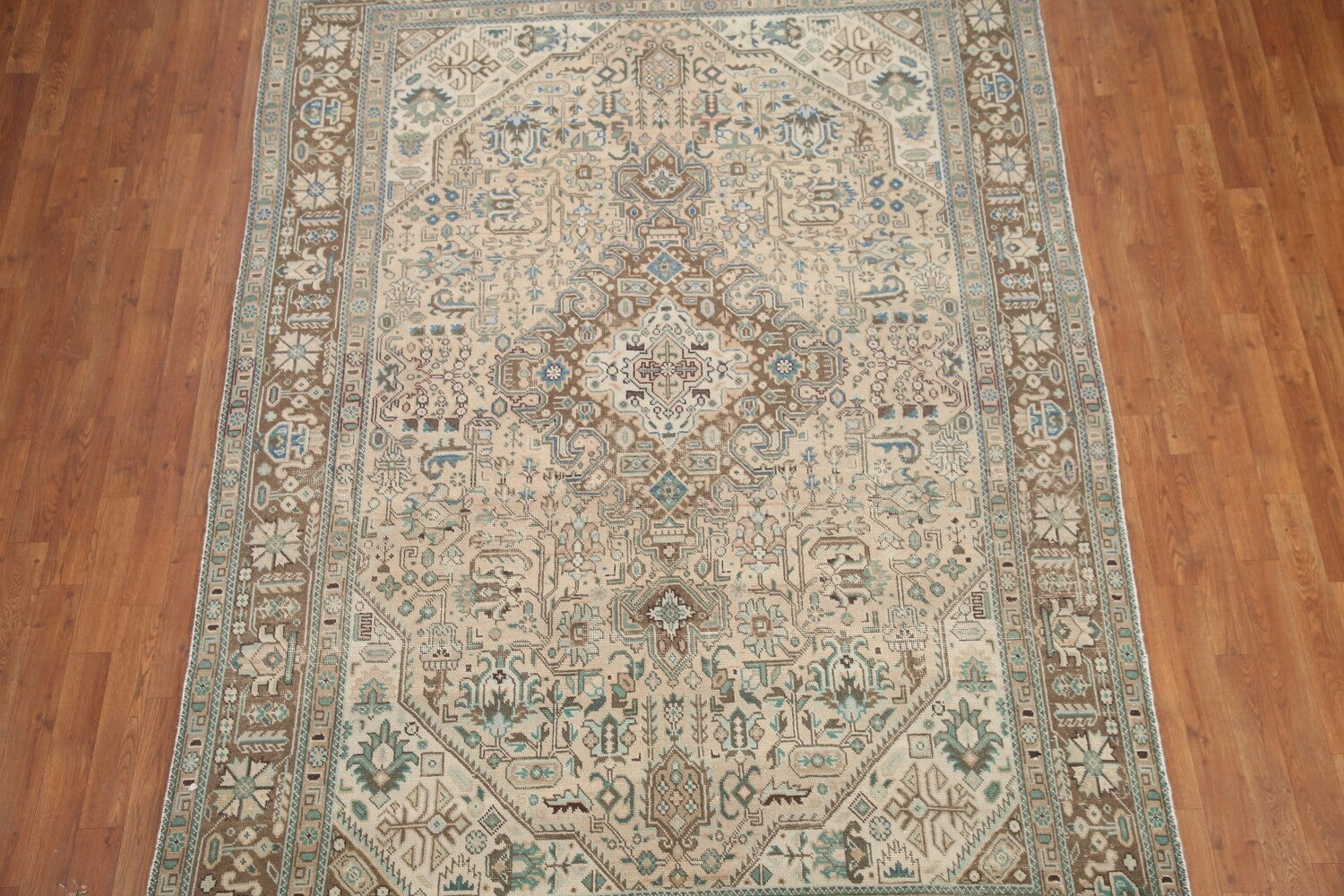 A Beautiful Genuine Persia ( Persia ) Tabriz rug is Hand Knotted by skillful weavers in Persia ( Persia ) with 100% Wool Material. This rug is in Very Good (Evenly Low Pile) condition. dimensions are 9' 7'' X 6' 2'' in foot and 292 X 188 in centimeter. the primary color is Beige & Ivories.