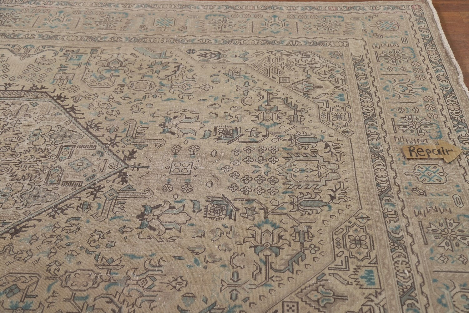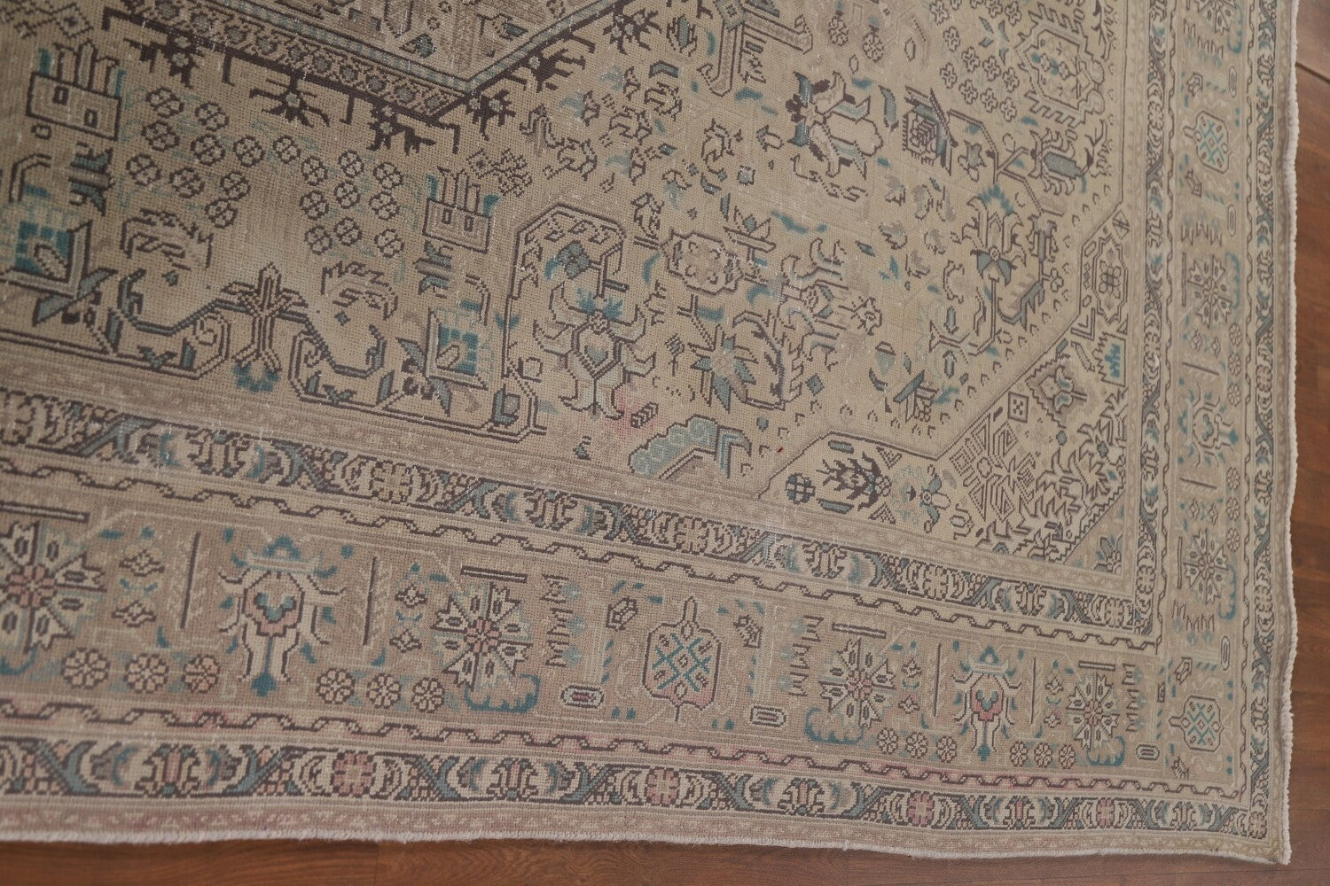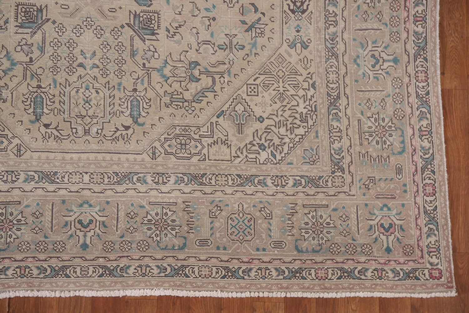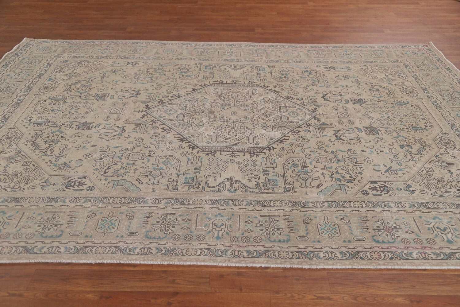 A Beautiful Genuine Persia ( Persia ) Tabriz rug is Hand Knotted by skillful weavers in Persia ( Persia ) with 100% Wool Material. This rug is in Very Good (Evenly Low Pile) condition. dimensions are 9' 8'' X 6' 7'' in foot and 295 X 201 in centimeter. the primary color is Beige & Ivories.