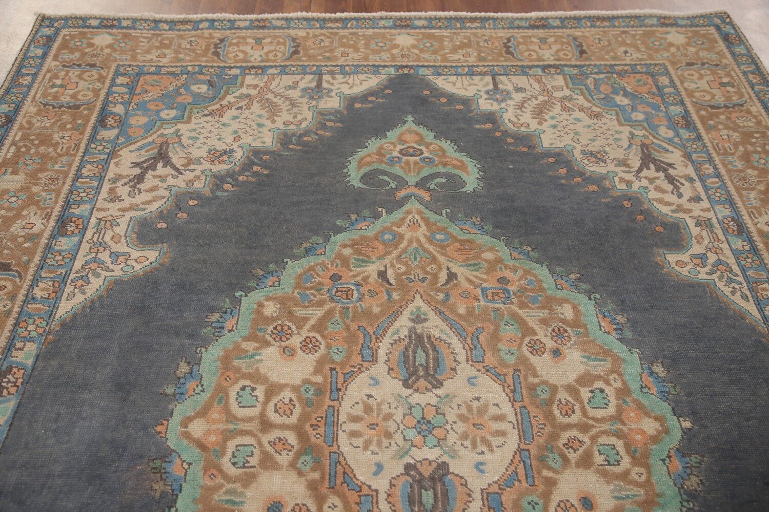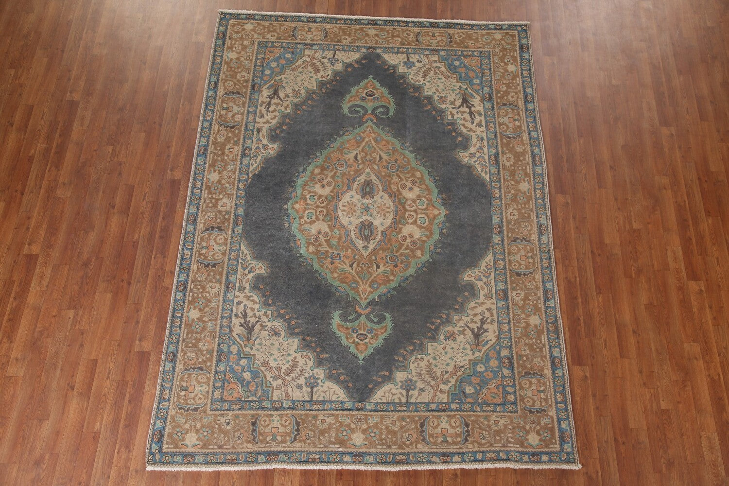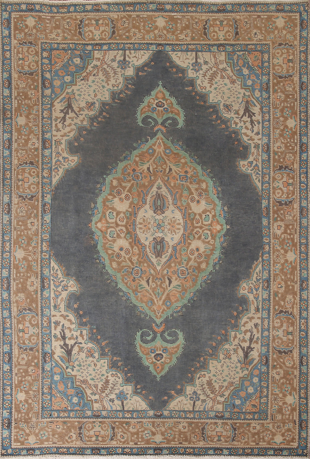 A Beautiful Genuine Persia ( Persia ) Tabriz rug is Hand Knotted by skillful weavers in Persia ( Persia ) with 100% Wool Material. This rug is in Very Good (Low Pile) condition. dimensions are 9' 1'' X 6' 8'' in foot and 277 X 203 in centimeter. the primary color is Greys & Charcoal.