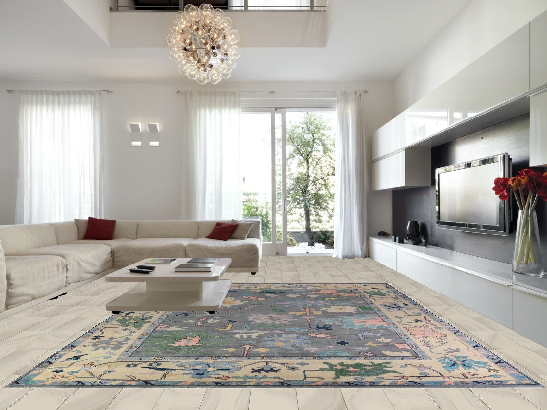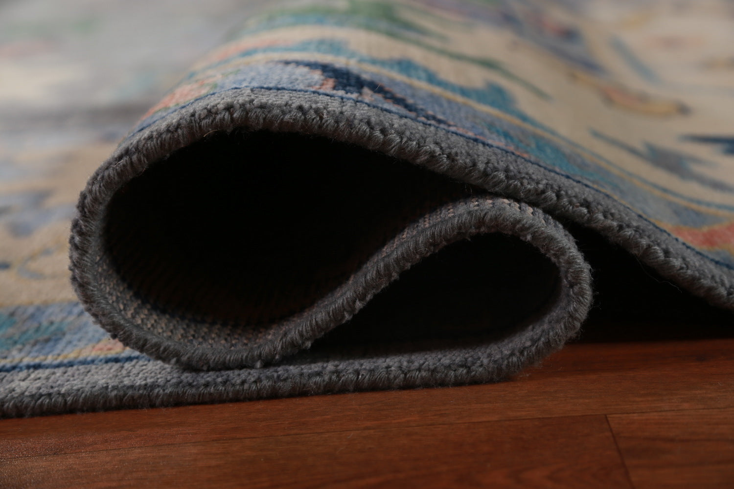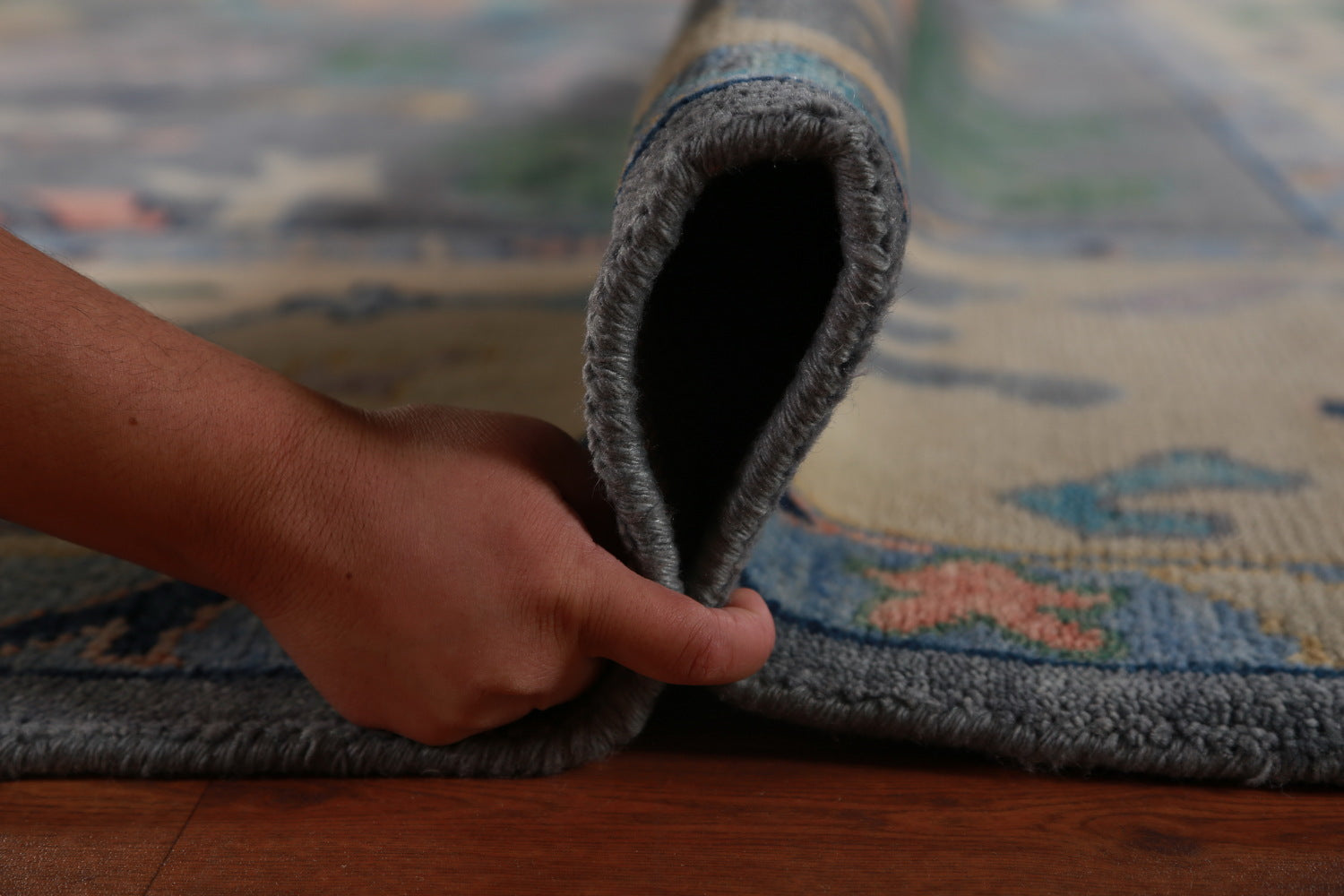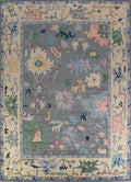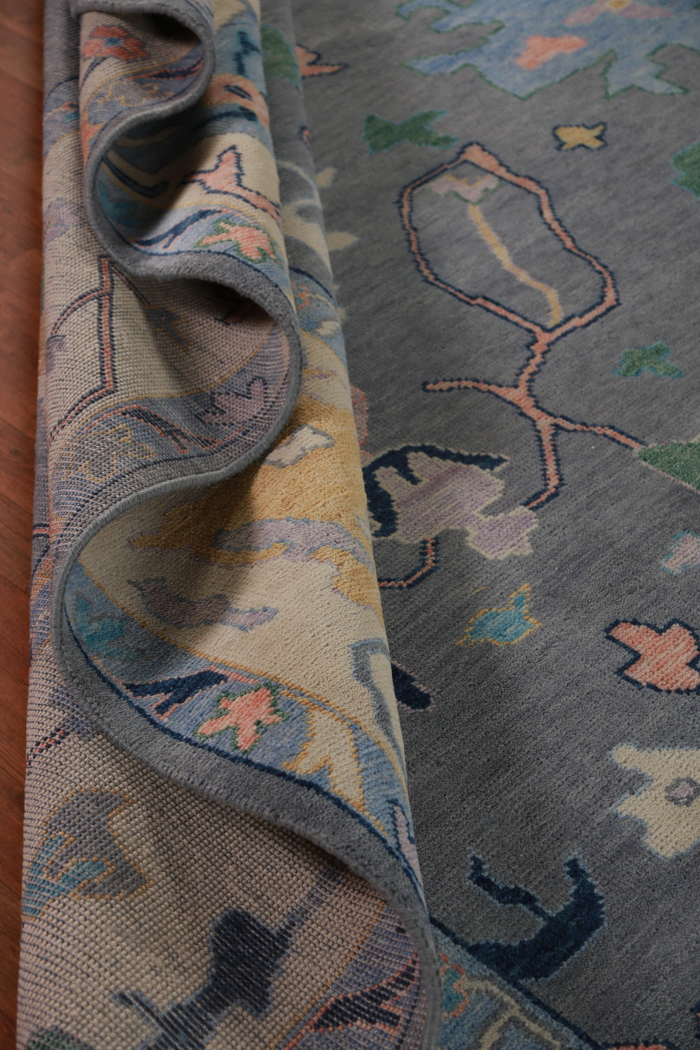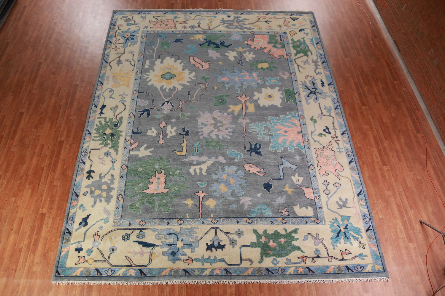A Beautiful Genuine India Oushak rug is Hand Knotted by skillful weavers in India with 100% Wool Material. This rug is in New, First Quality condition. dimensions are 14' 11'' X 11' 9'' in foot and 455 X 358 in centimeter. the primary color is Greys & Charcoal.