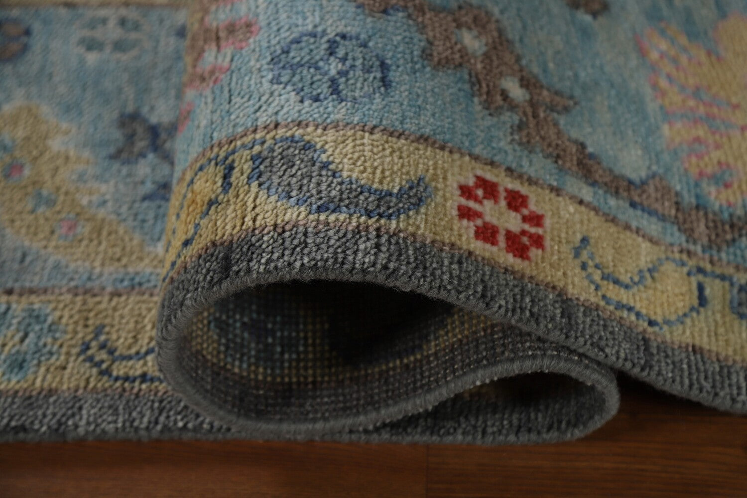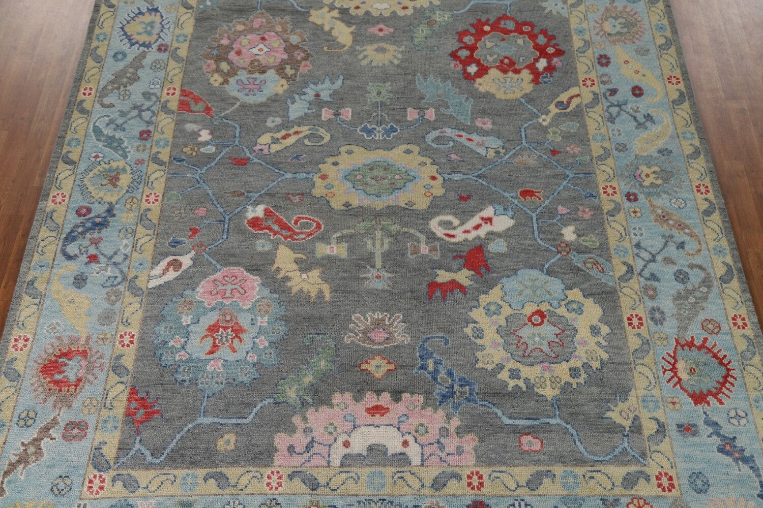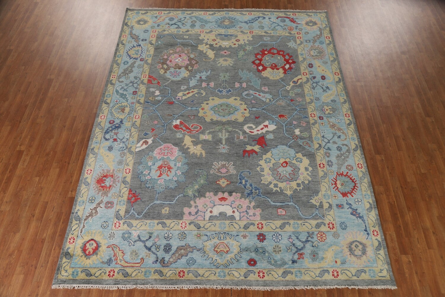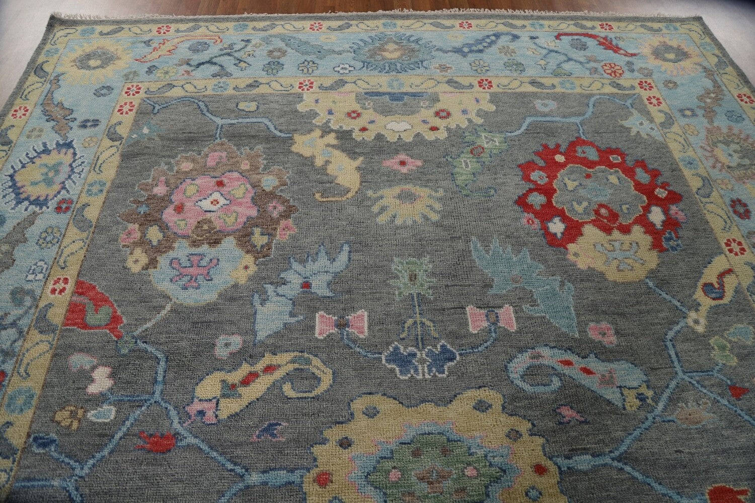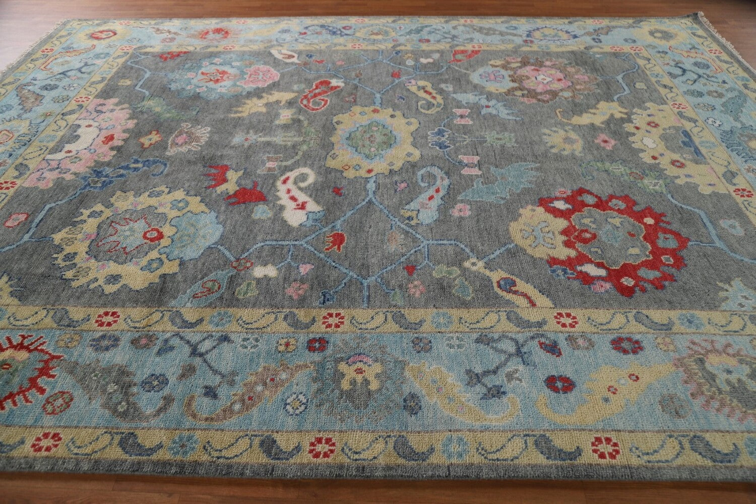 A Beautiful Genuine India Oushak rug is Hand Knotted by skillful weavers in India with 100% Wool Material. This rug is in New, First Quality condition. dimensions are 11' 9'' X 9' 0'' in foot and 358 X 274 in centimeter. the primary color is Greys & Charcoal.