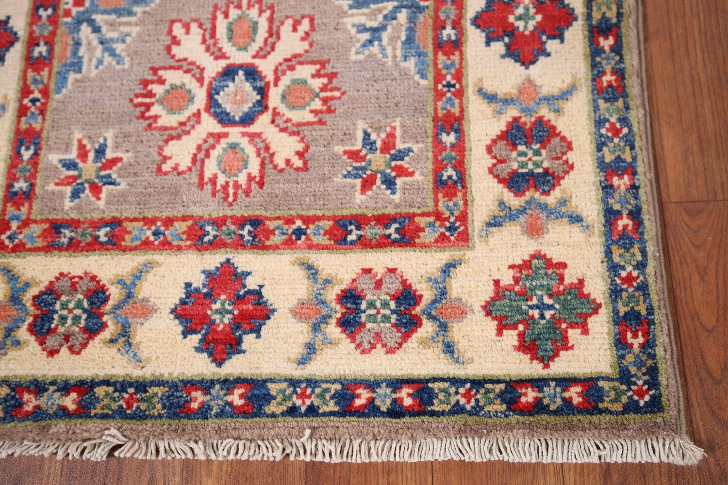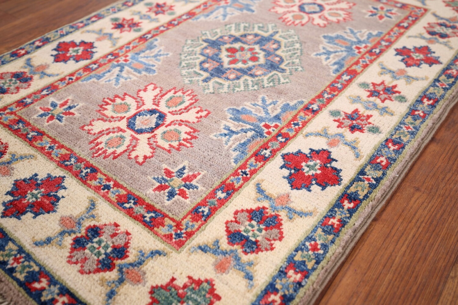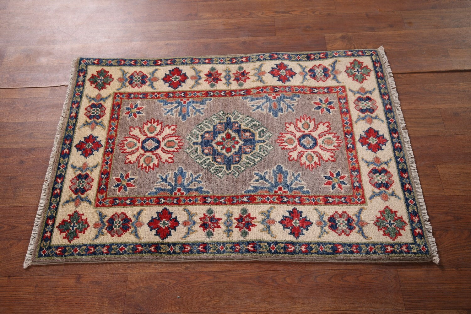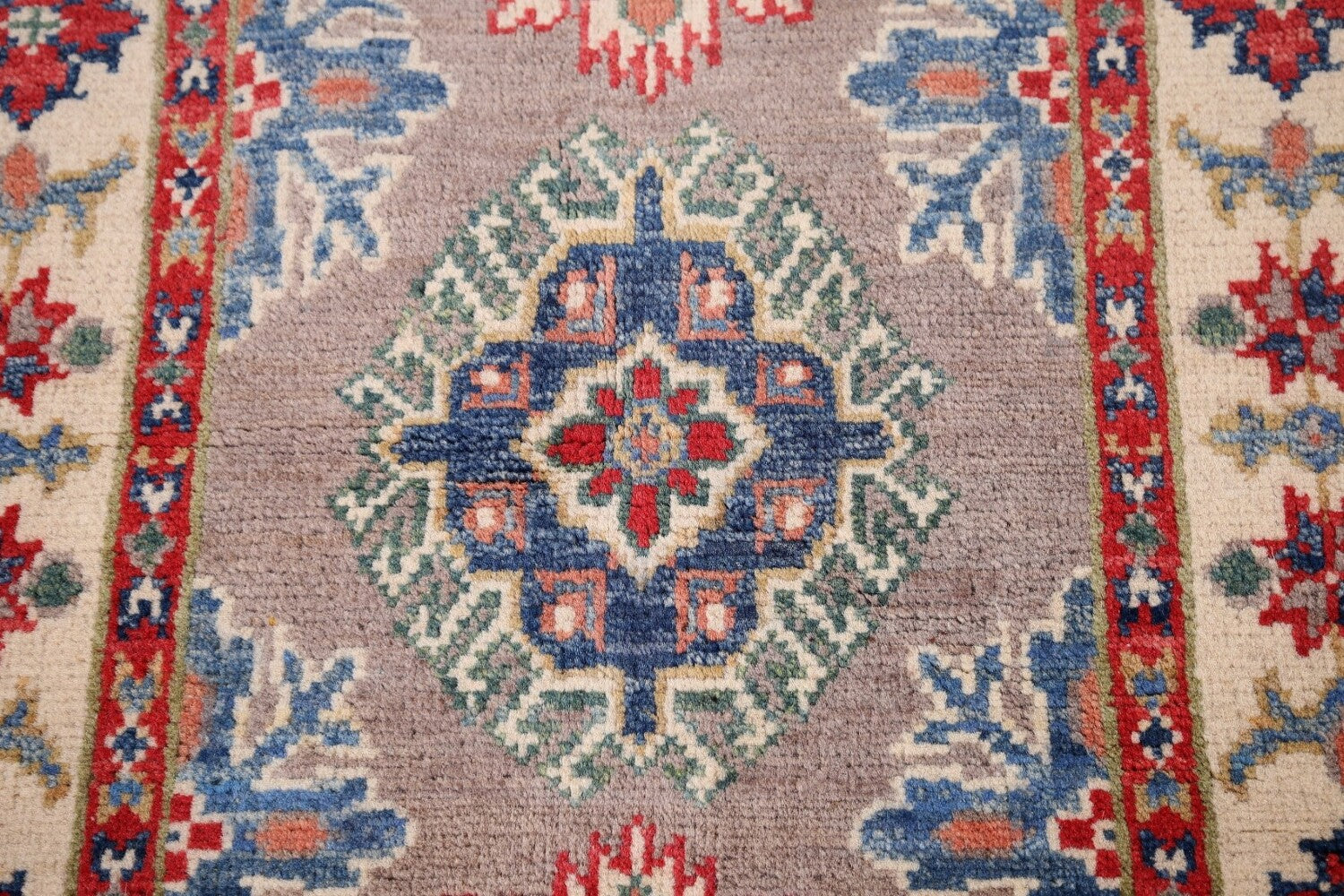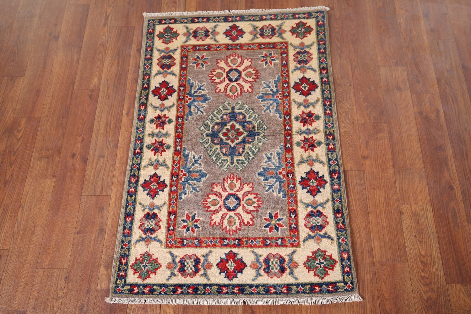 A Beautiful Genuine Pakistan Kazak rug is Hand Knotted by skillful weavers in Pakistan with 100% Wool Material. This rug is in New, First Quality condition. dimensions are 3' 0'' X 2' 0'' in foot and 91 X 61 in centimeter. the primary color is Greys & Charcoal.