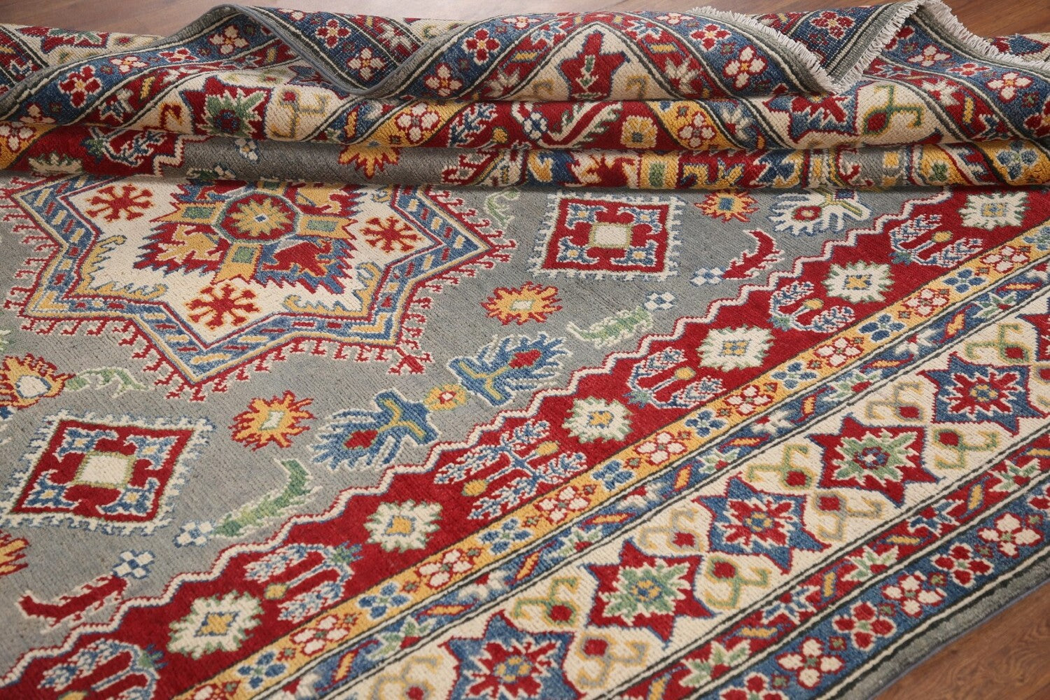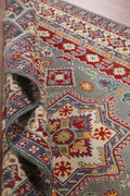 A Beautiful Genuine Pakistan Kazak rug is Hand Knotted by skillful weavers in Pakistan with 100% Wool Material. This rug is in New, First Quality condition. dimensions are 9' 8'' X 6' 6'' in foot and 295 X 198 in centimeter. the primary color is Greys & Charcoal.