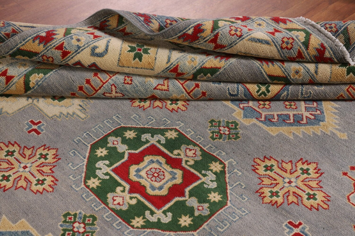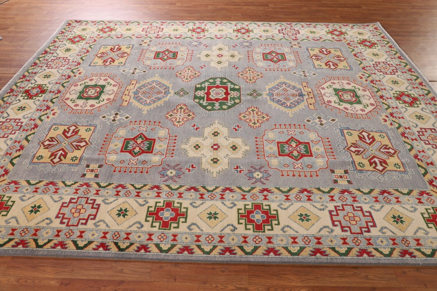 A Beautiful Genuine Pakistan Kazak rug is Hand Knotted by skillful weavers in Pakistan with 100% Wool Material. This rug is in New, First Quality condition. dimensions are 9' 11'' X 8' 0'' in foot and 302 X 244 in centimeter. the primary color is Greys & Charcoal.