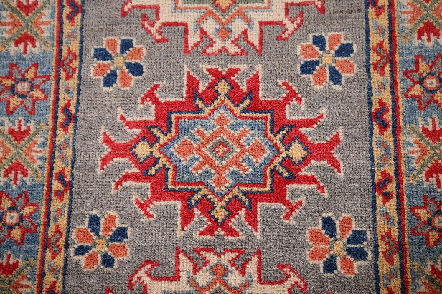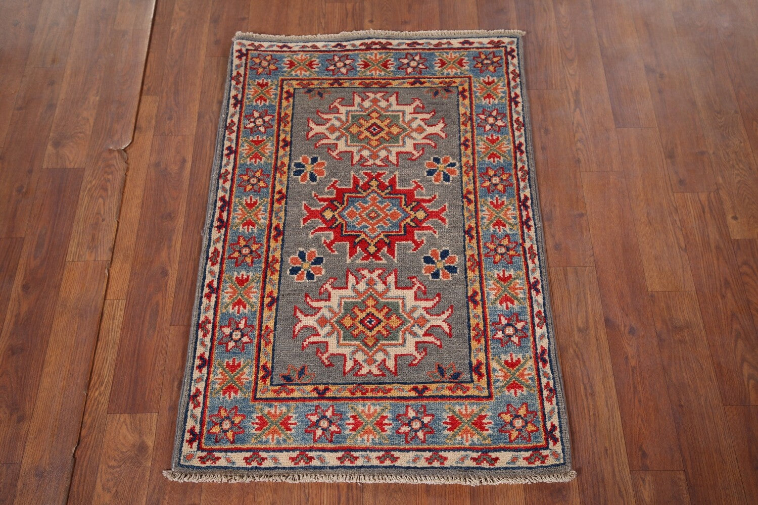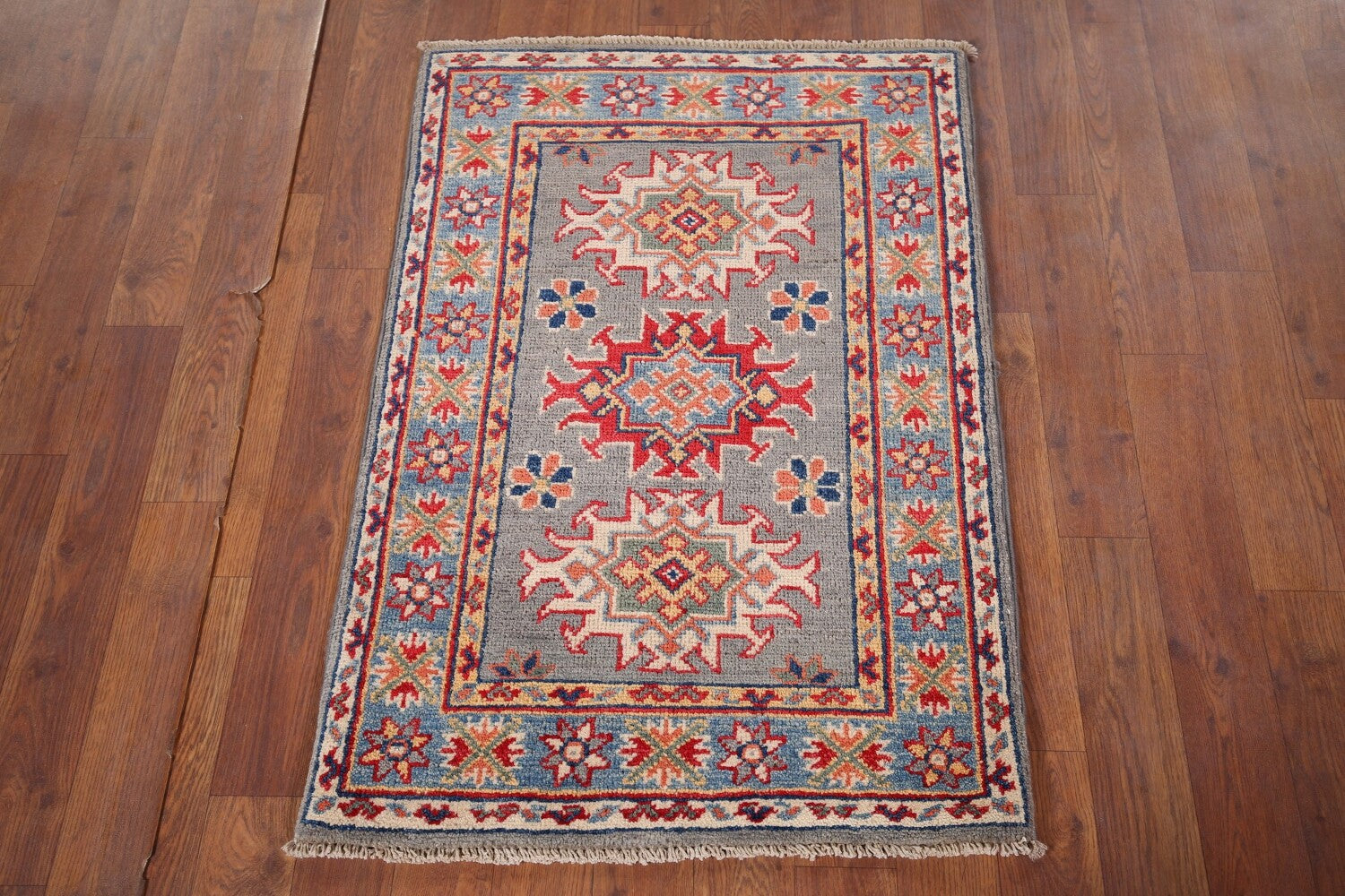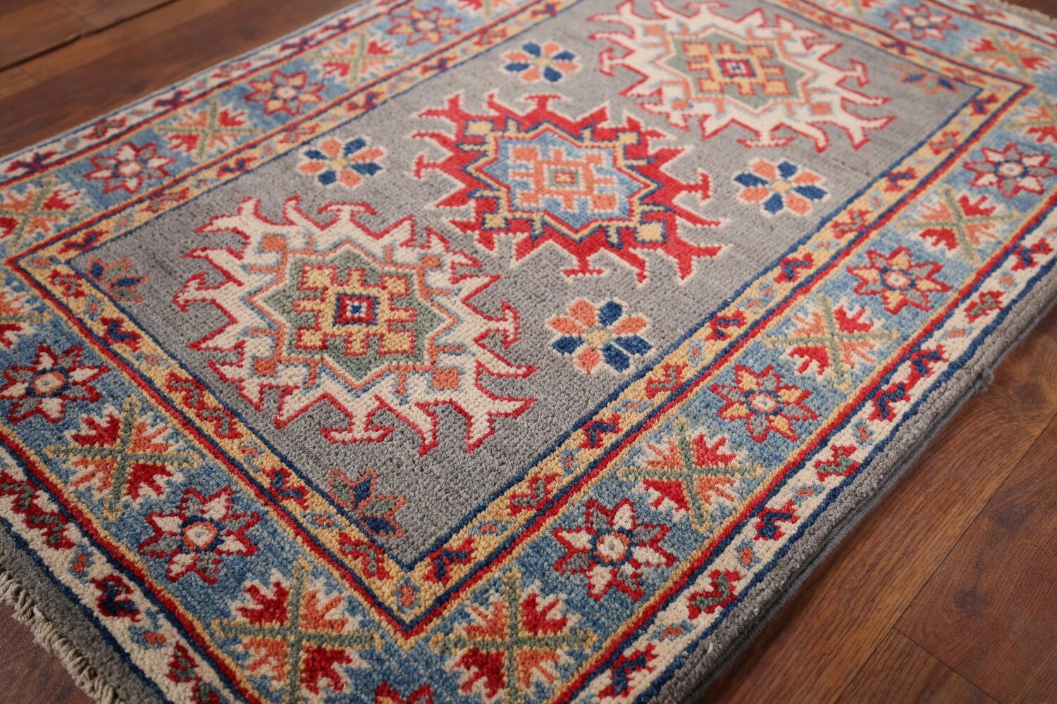 A Beautiful Genuine Pakistan Kazak rug is Hand Knotted by skillful weavers in Pakistan with 100% Wool Material. This rug is in New, First Quality condition. dimensions are 3' 0'' X 2' 0'' in foot and 91 X 61 in centimeter. the primary color is Greys & Charcoal.
