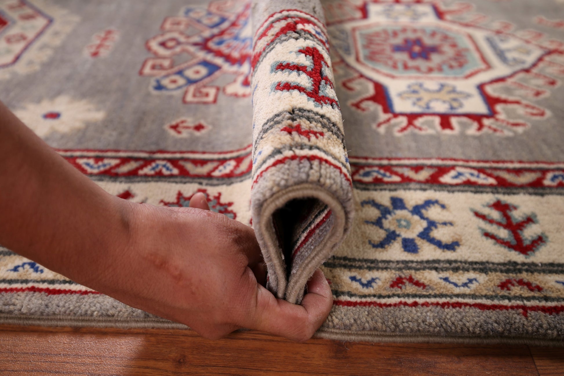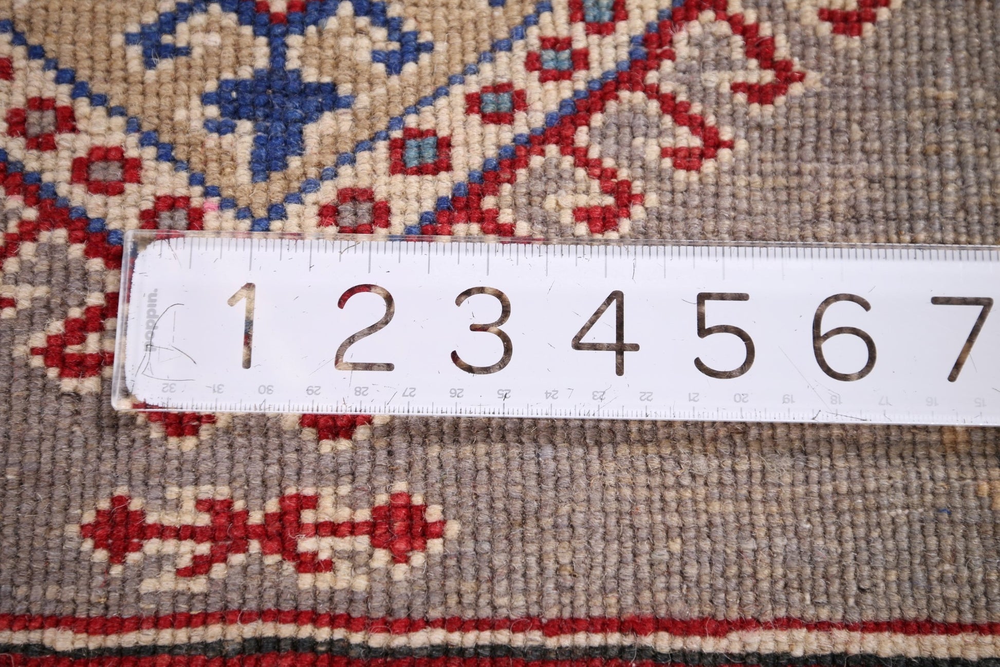 A Beautiful Genuine Pakistan Kazak rug is Hand Knotted by skillful weavers in Pakistan with 100% Wool Material. This rug is in New, First Quality condition. dimensions are 19' 5'' X 2' 8'' in foot and 592 X 81 in centimeter. the primary color is Greys & Charcoal.