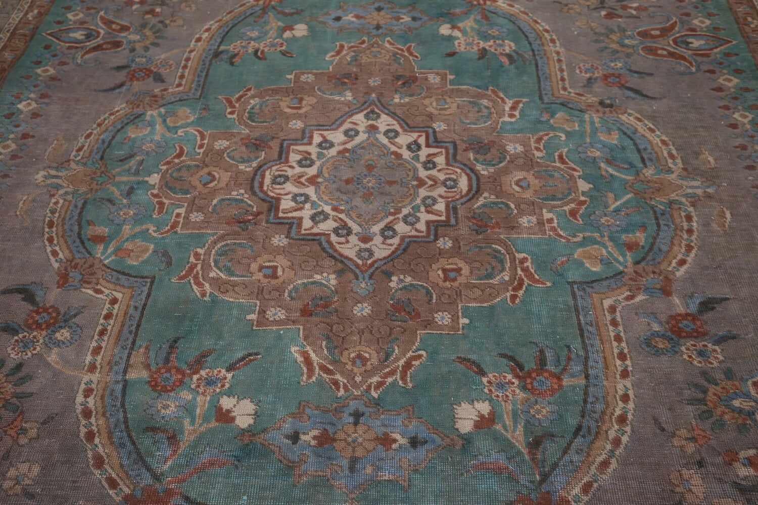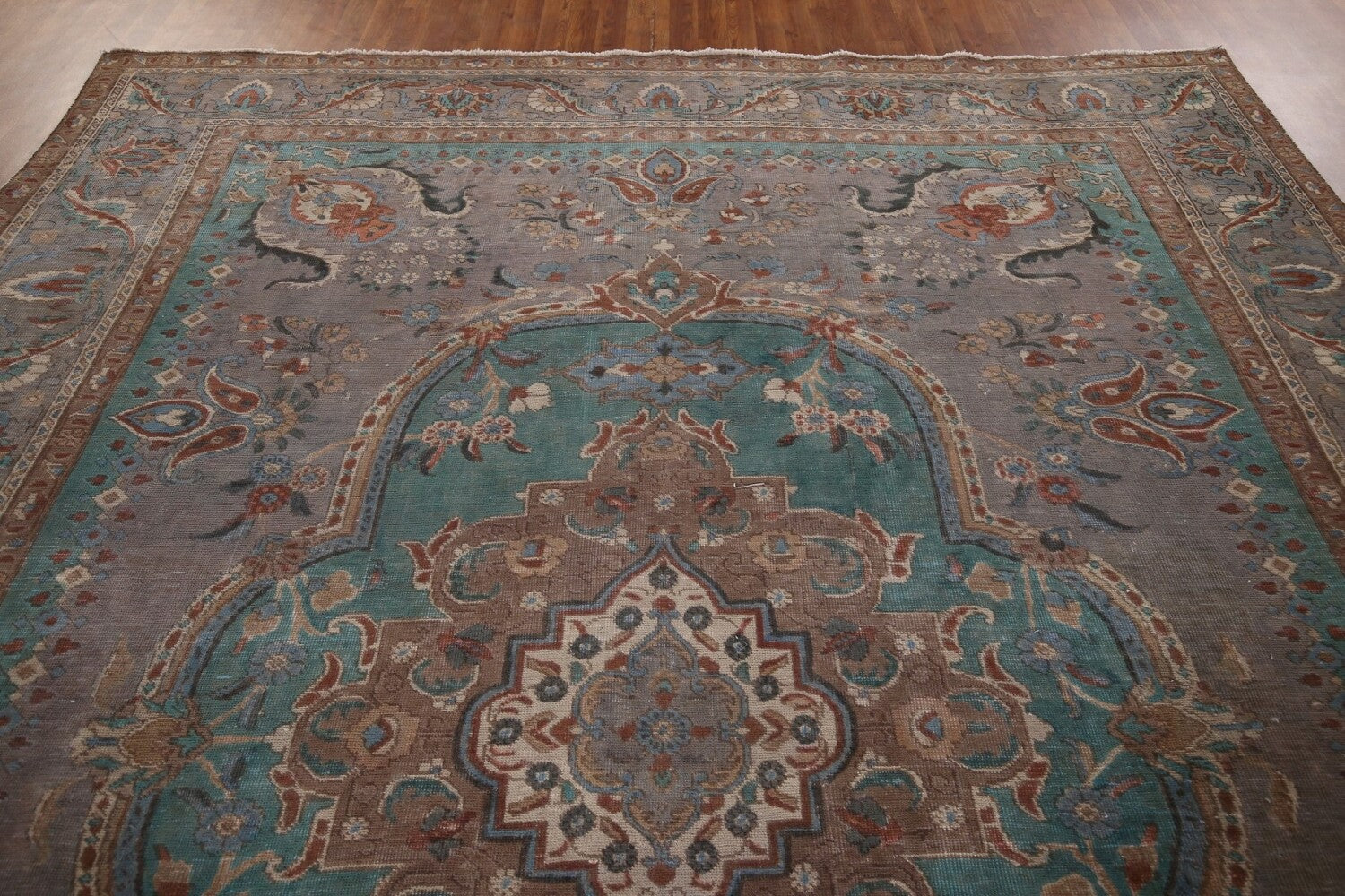 A Beautiful Genuine Persia ( Persia ) Tabriz rug is Hand Knotted by skillful weavers in Persia ( Persia ) with 100% Wool Material. This rug is in Very Good ( Evenly Low Pile-Repair) condition. dimensions are 12' 7'' X 10' 1'' in foot and 384 X 307 in centimeter. the primary color is Greys & Charcoal.