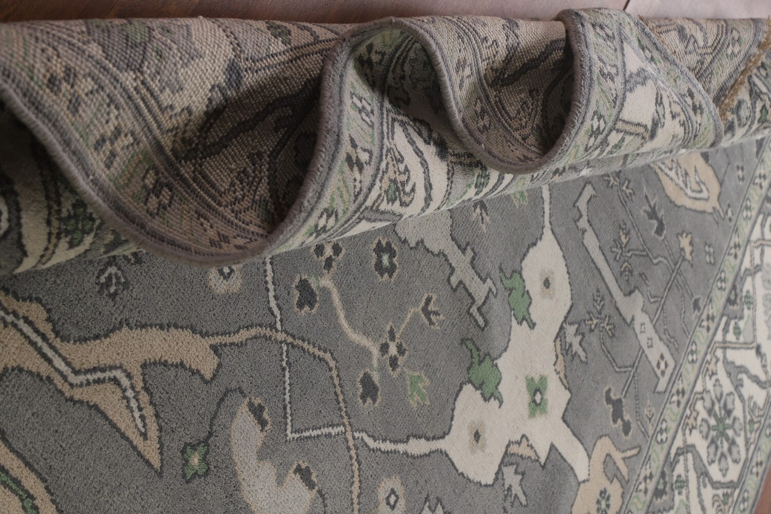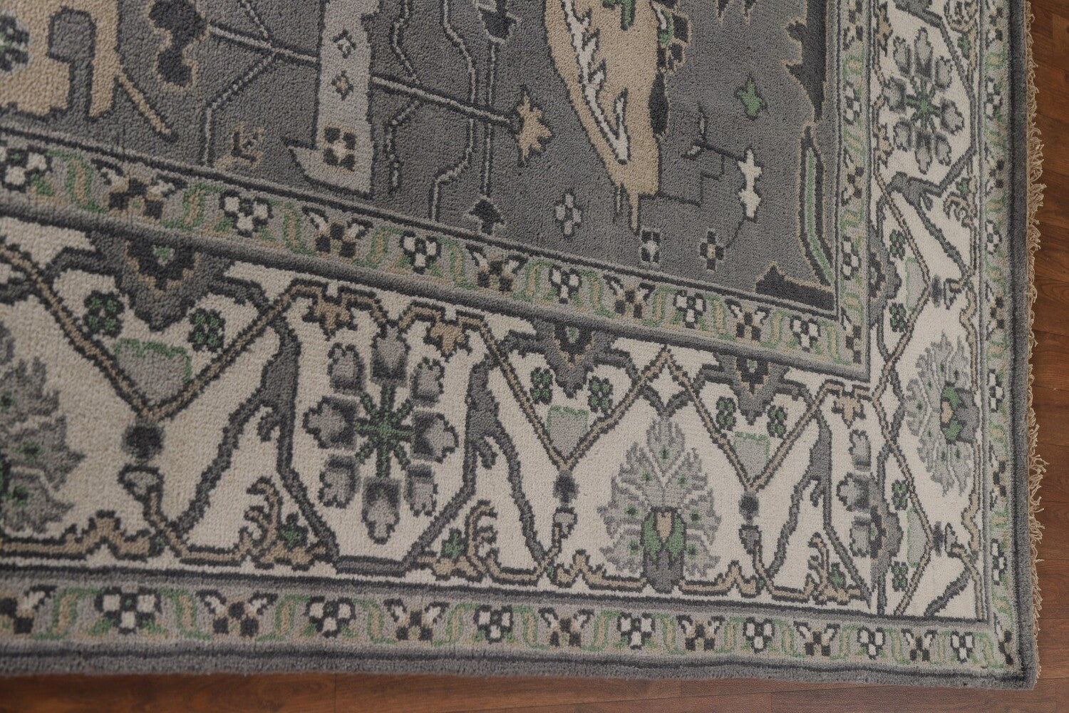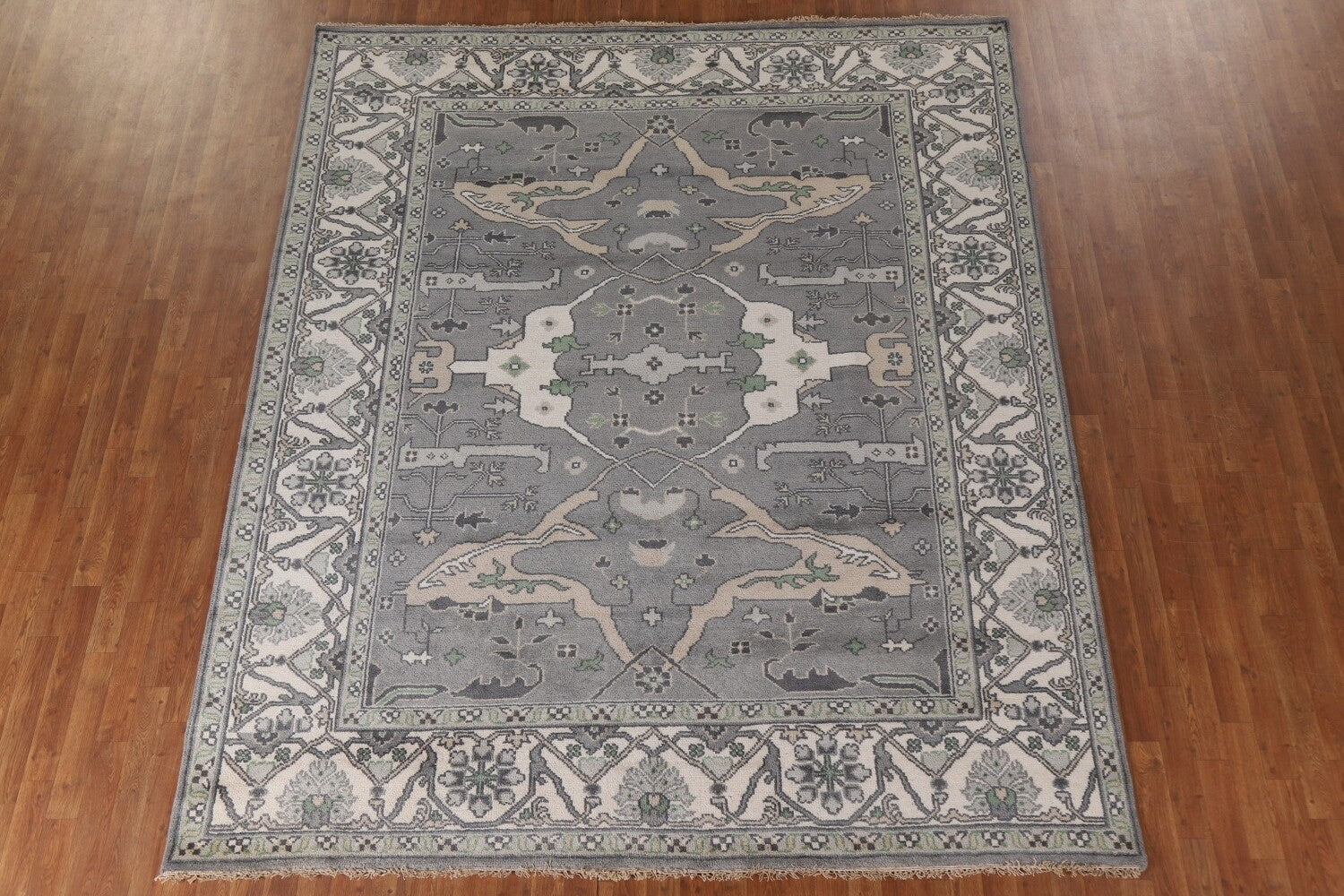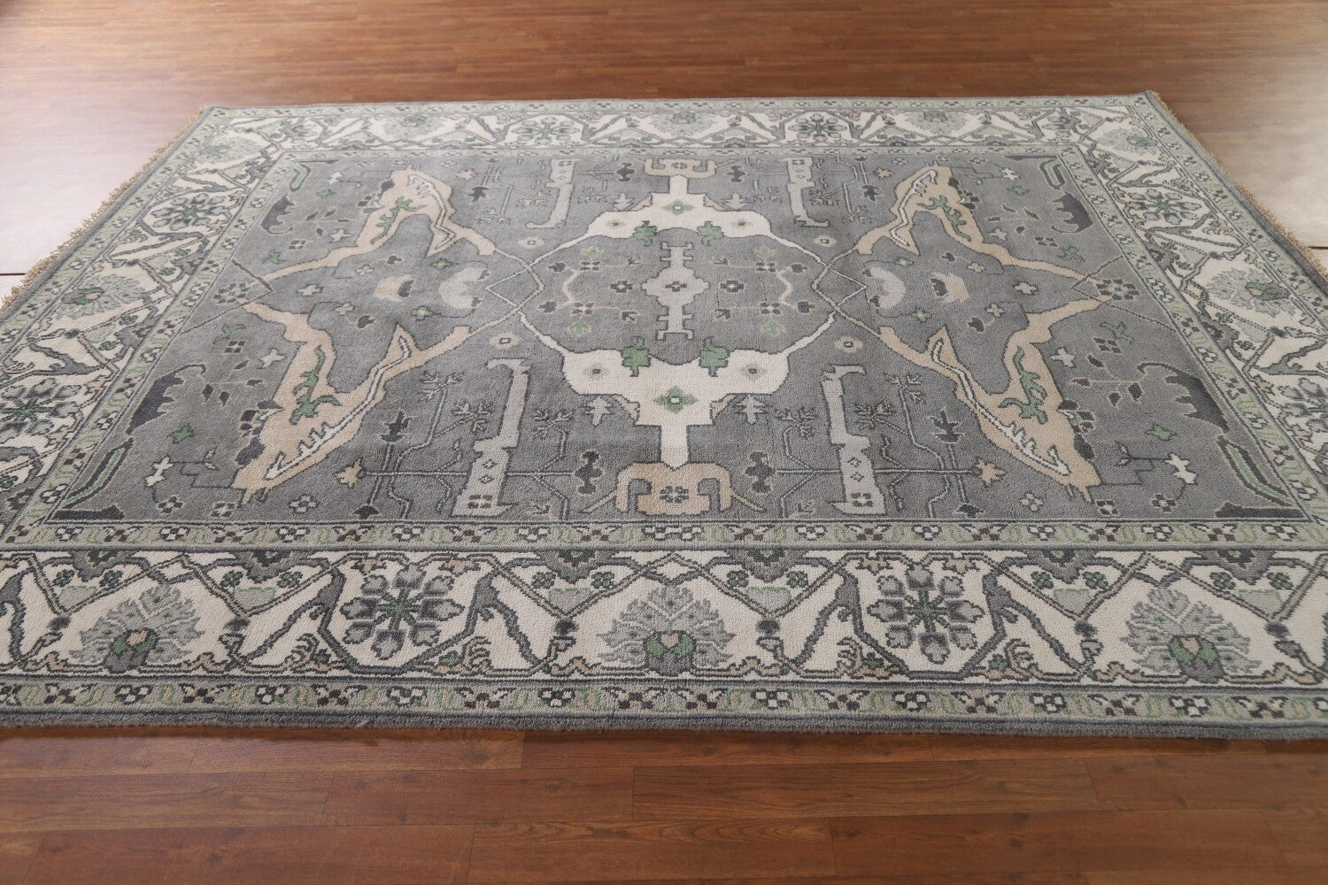 A Beautiful Genuine India Oushak rug is Hand Knotted by skillful weavers in India with 100% Wool Material. This rug is in New, First Quality condition. dimensions are 9' 10'' X 8' 2'' in foot and 300 X 249 in centimeter. the primary color is Greys & Charcoal.