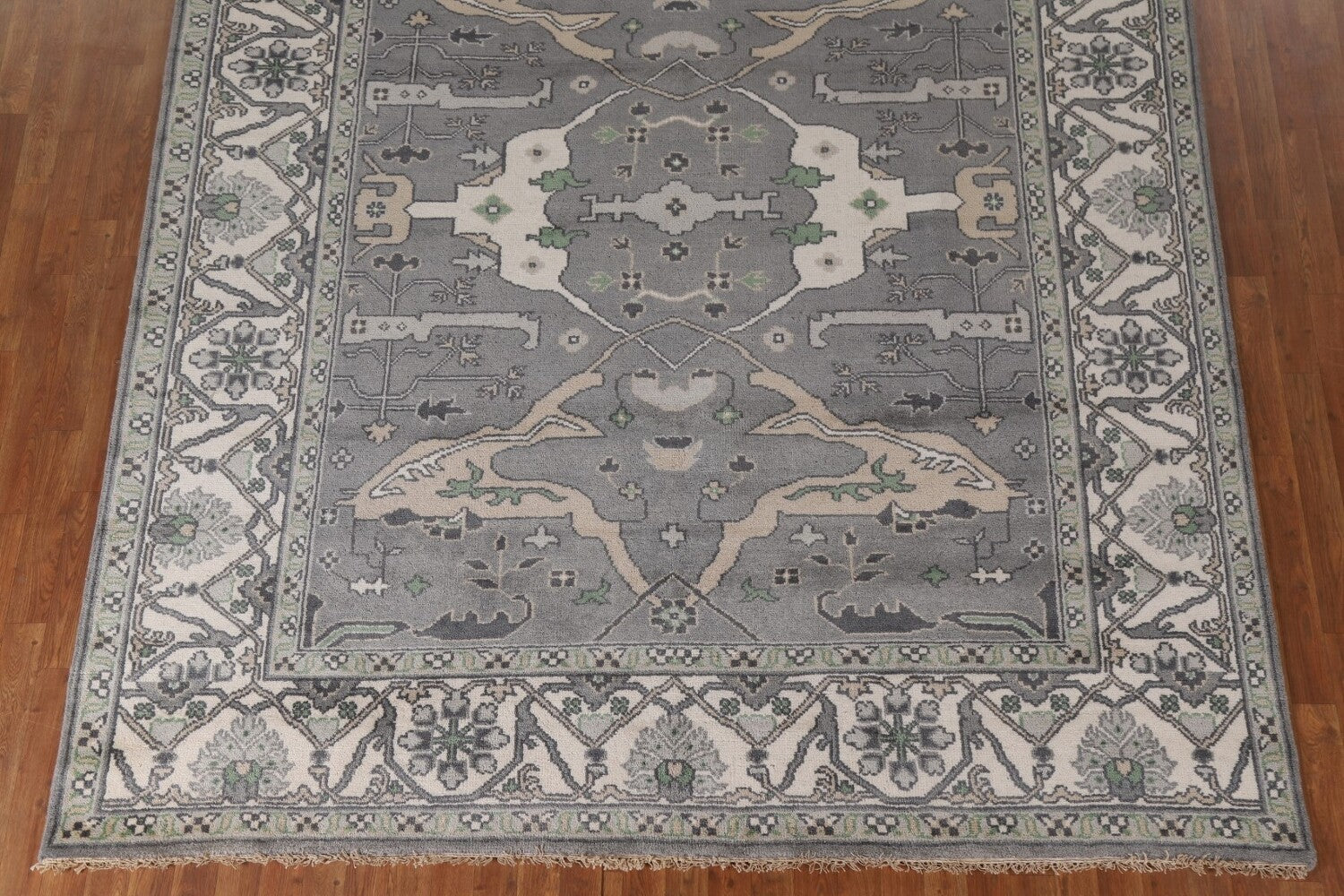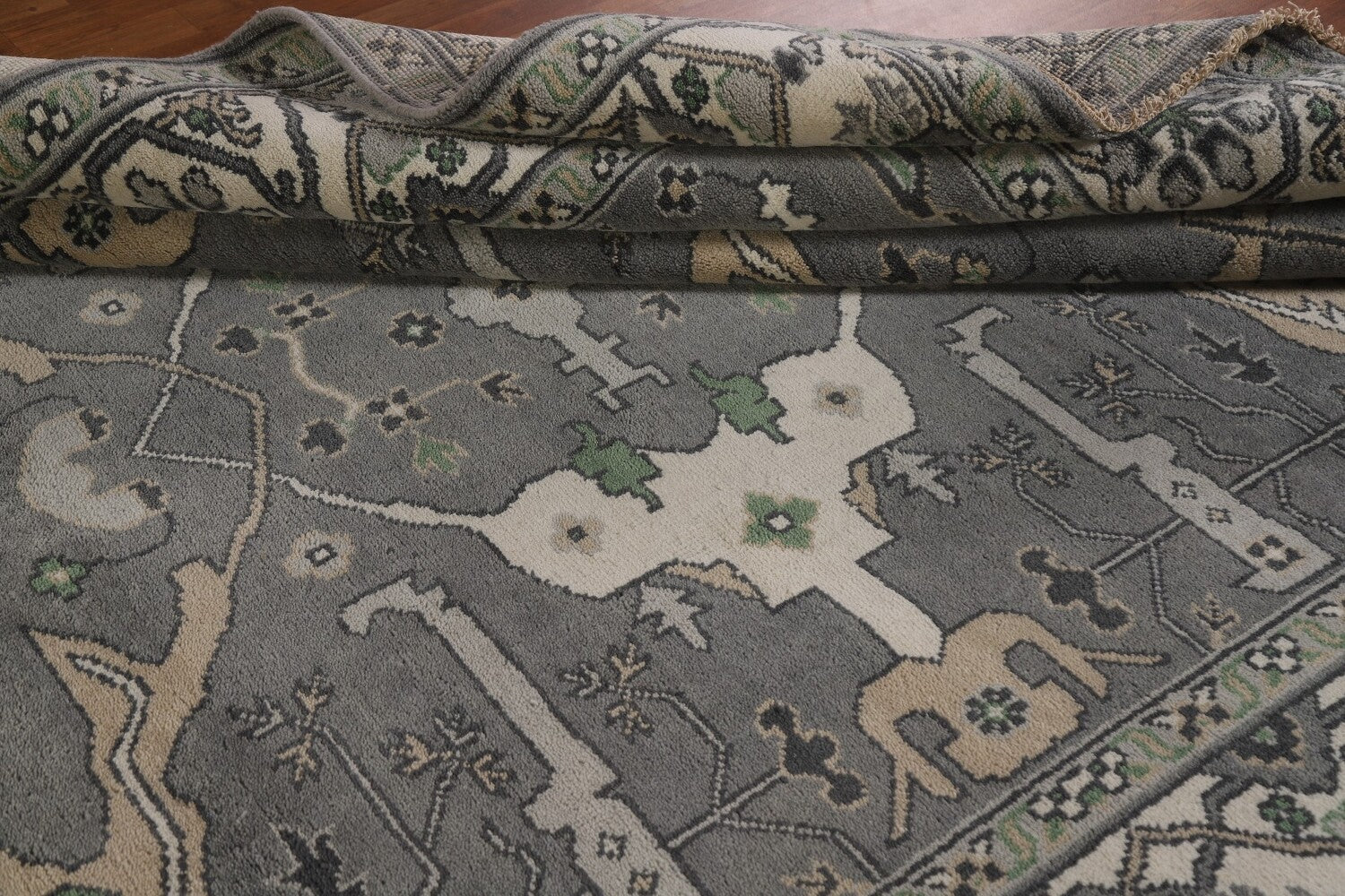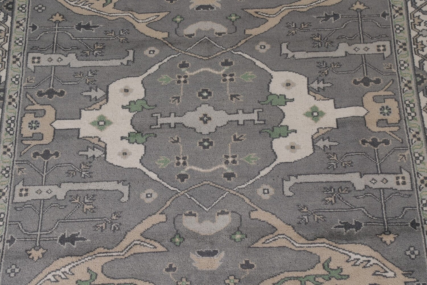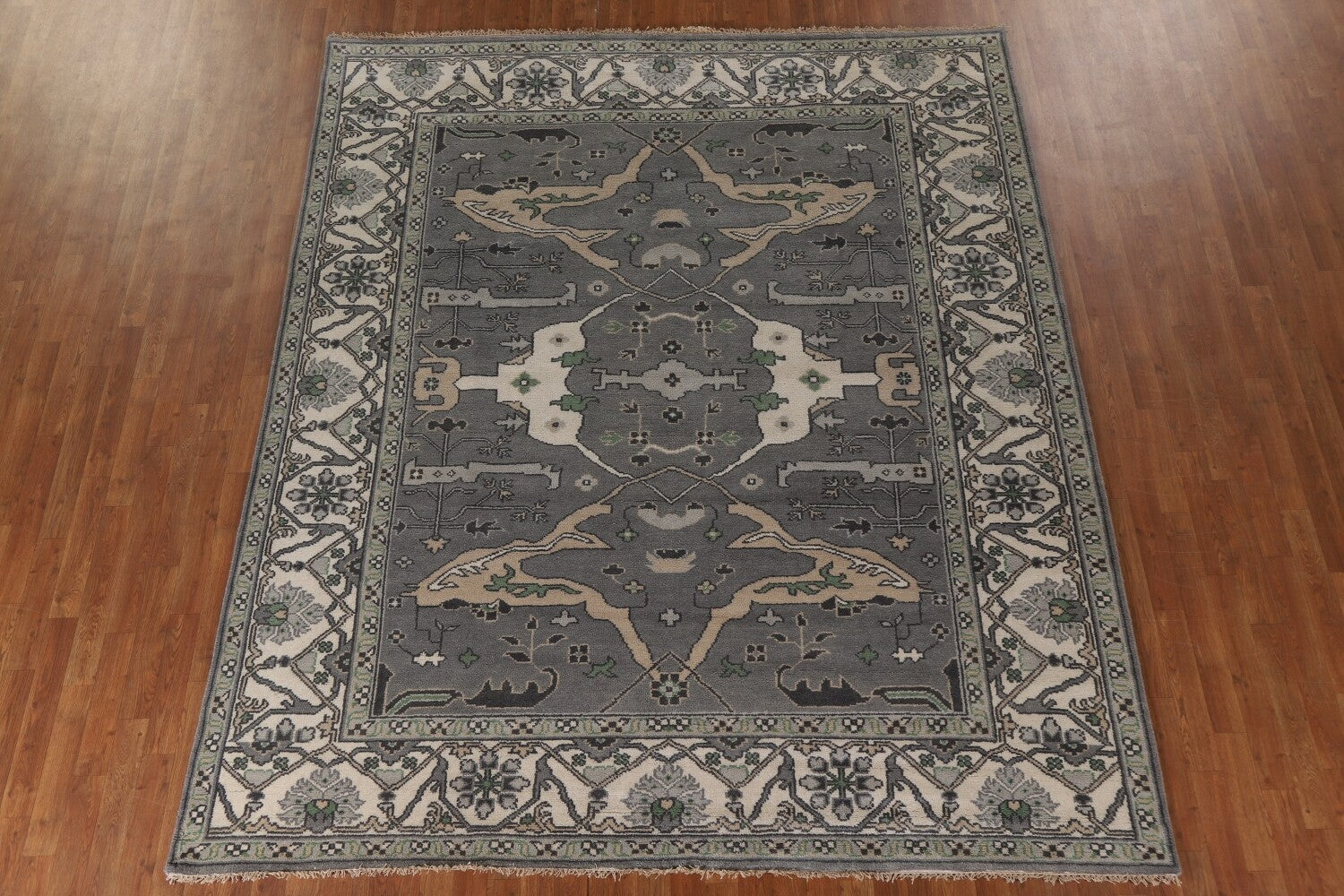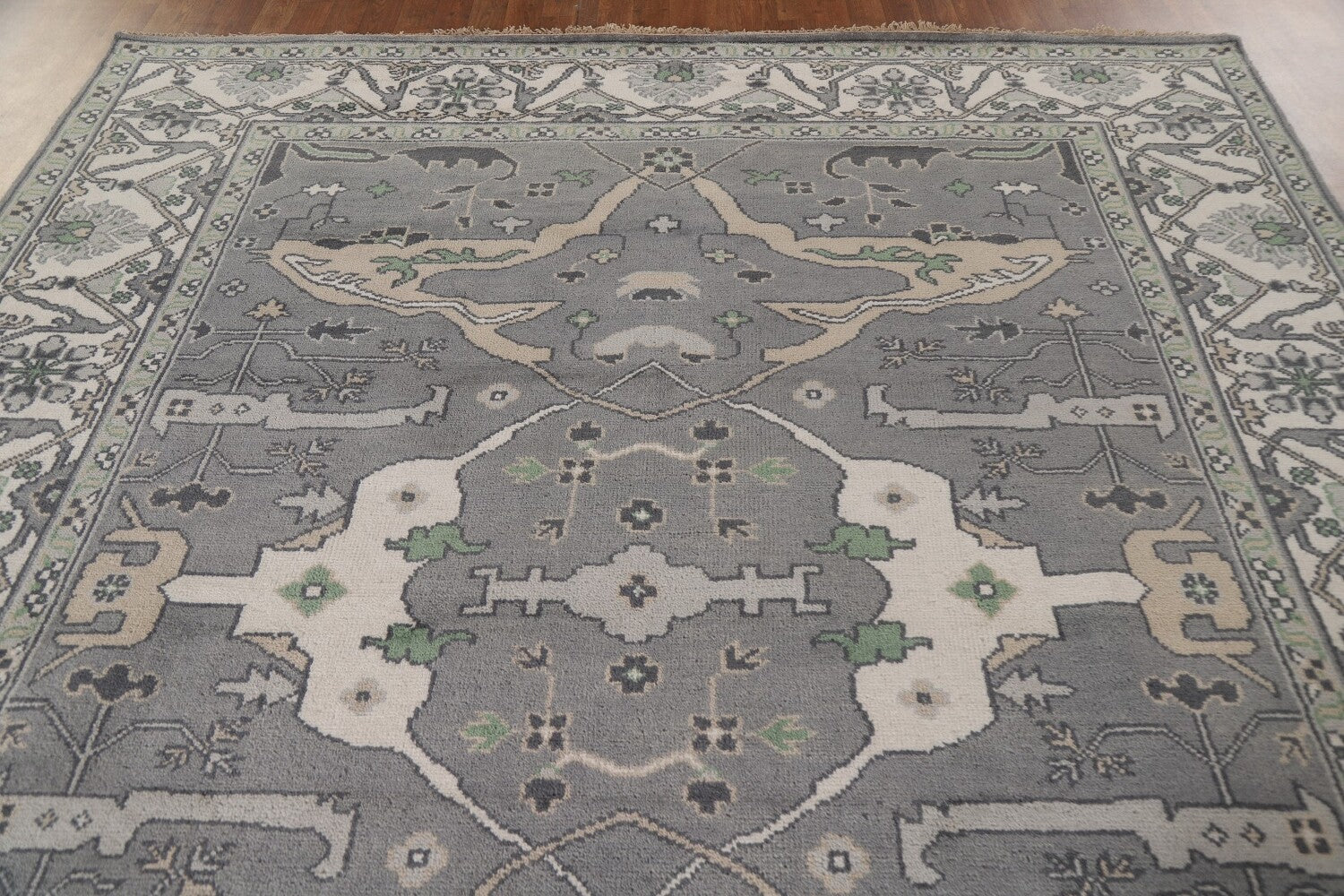 A Beautiful Genuine India Oushak rug is Hand Knotted by skillful weavers in India with 100% Wool Material. This rug is in New, First Quality condition. dimensions are 9' 10'' X 8' 2'' in foot and 300 X 249 in centimeter. the primary color is Greys & Charcoal.