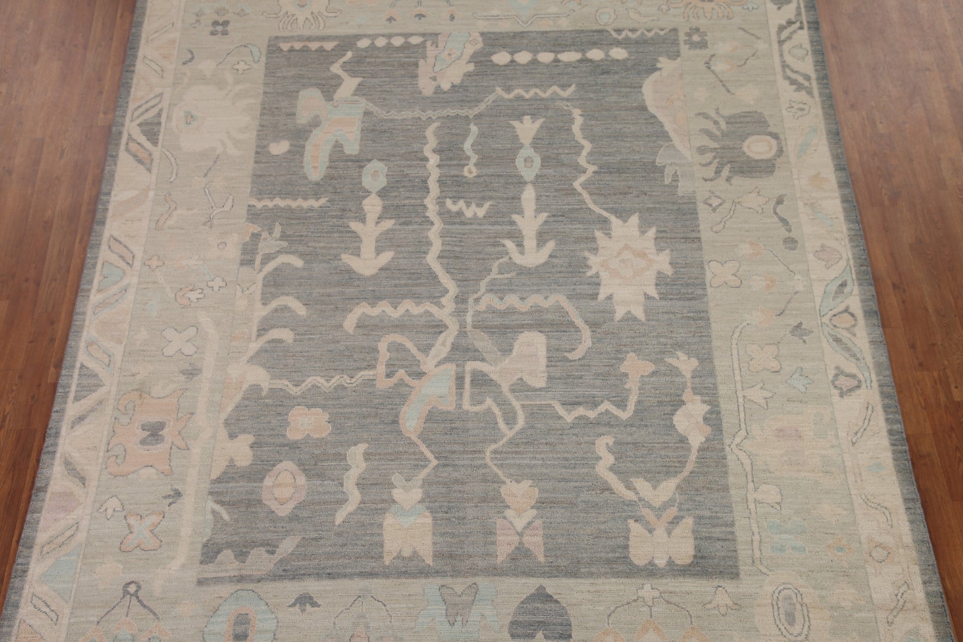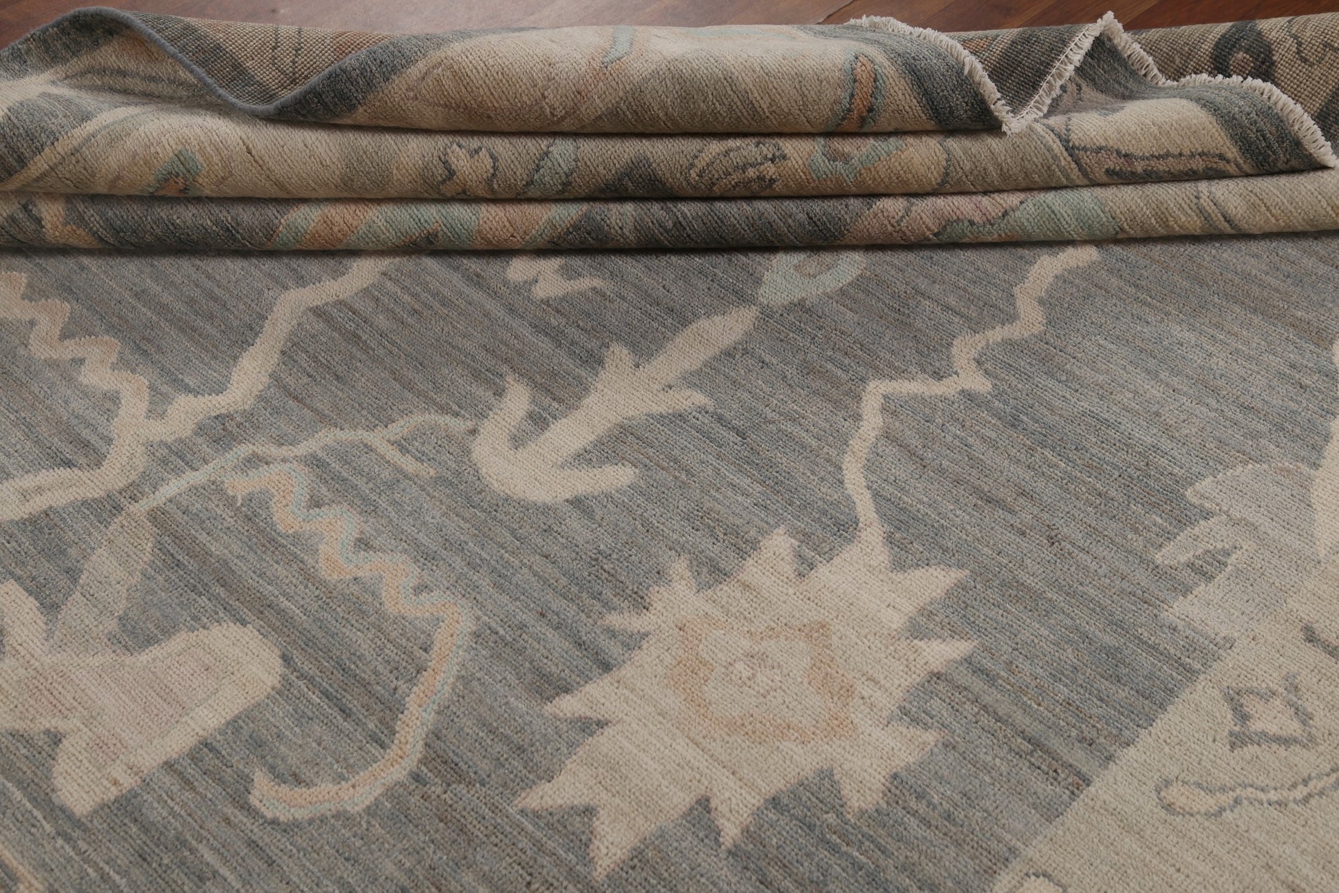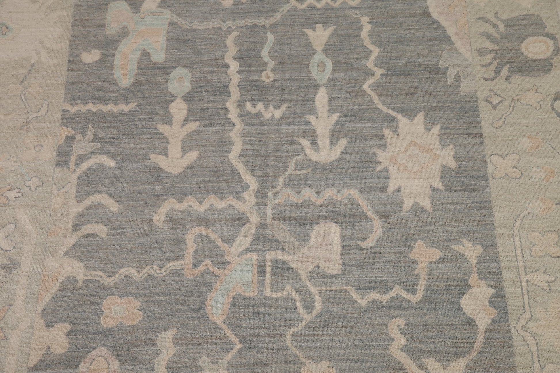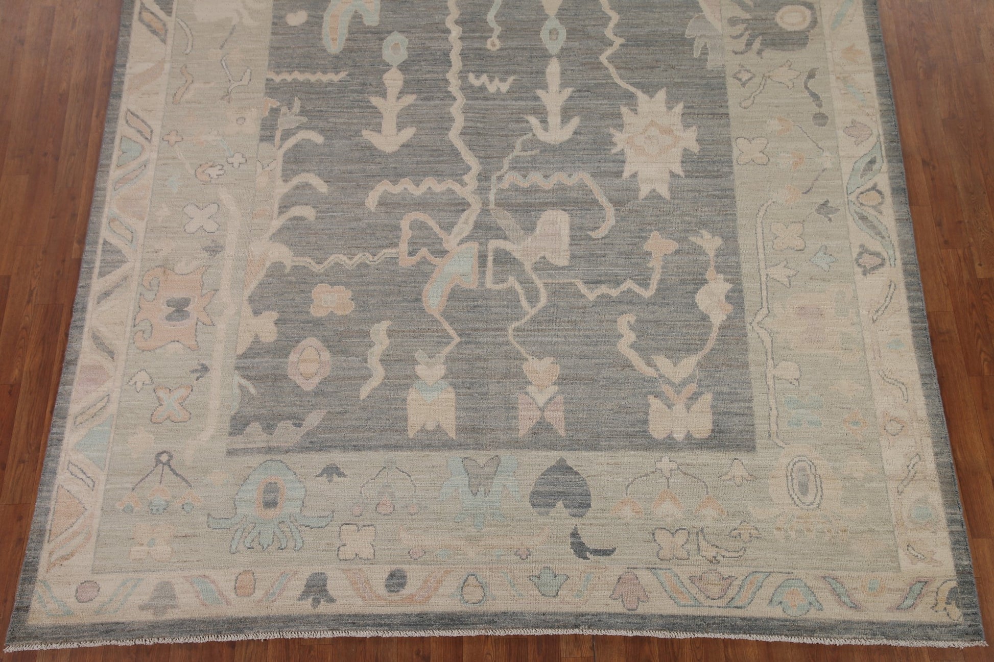 A Beautiful Genuine Turkey Oushak rug is Hand Knotted by skillful weavers in Turkey with 100% Wool Material. This rug is in New, First Quality condition. dimensions are 9' 10'' X 8' 2'' in foot and 300 X 249 in centimeter. the primary color is Greys & Charcoal.