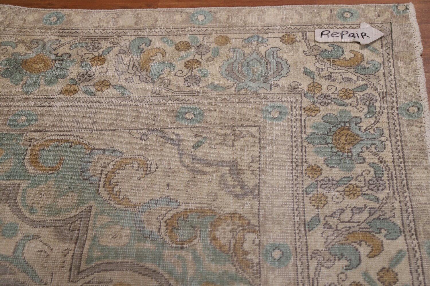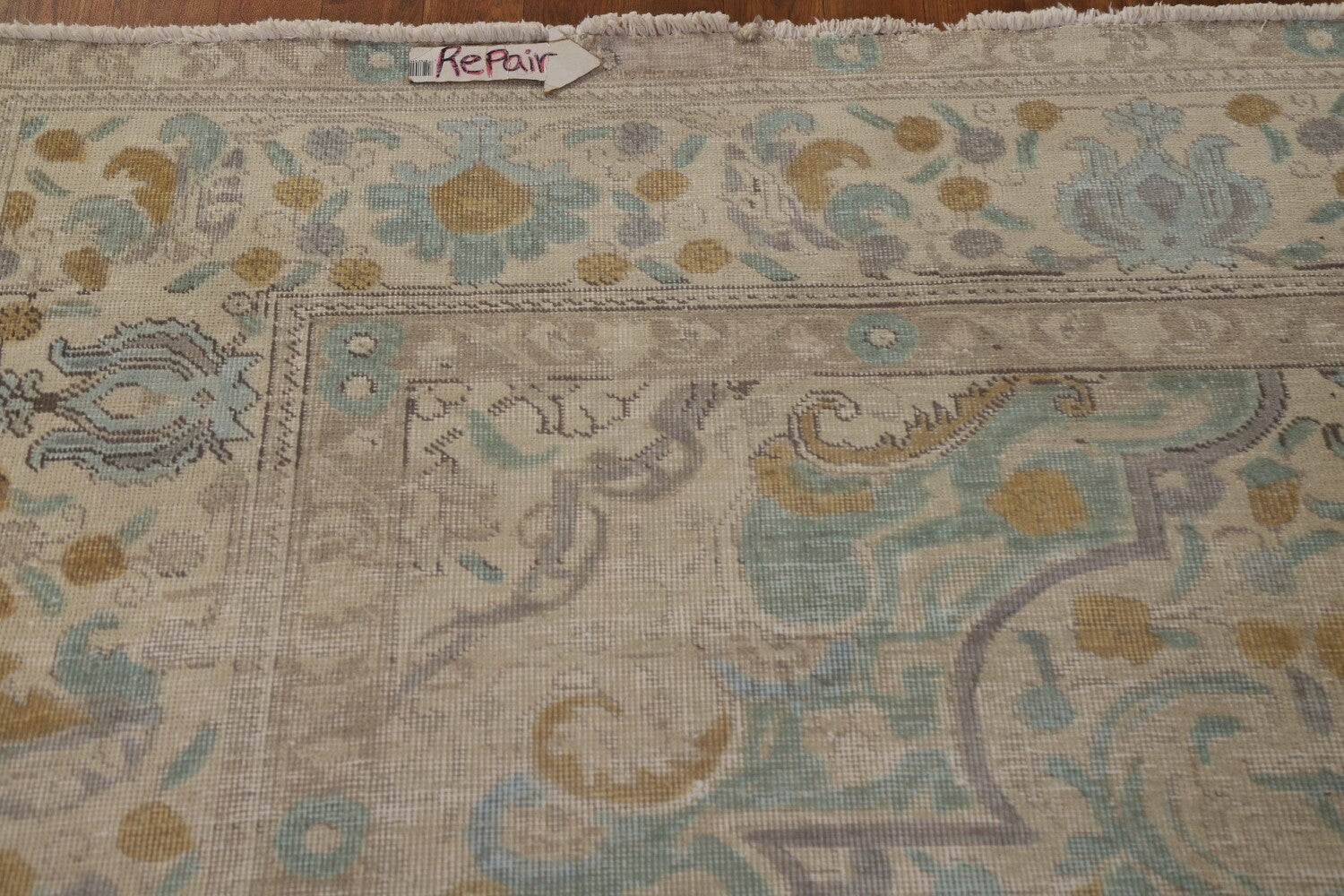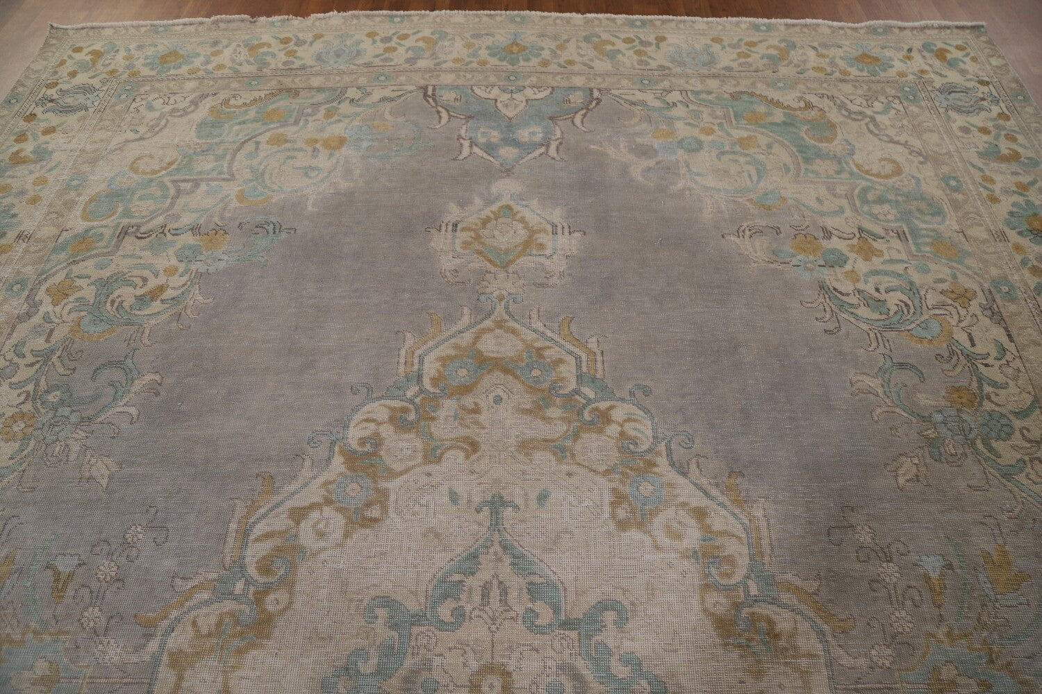 A Beautiful Genuine Persia ( Persia ) Tabriz rug is Hand Knotted by skillful weavers in Persia ( Persia ) with 100% Wool Material. This rug is in Very Good (Evenly Low Pile-Repair) condition. dimensions are 12' 4'' X 9' 9'' in foot and 376 X 297 in centimeter. the primary color is Greys & Charcoal.