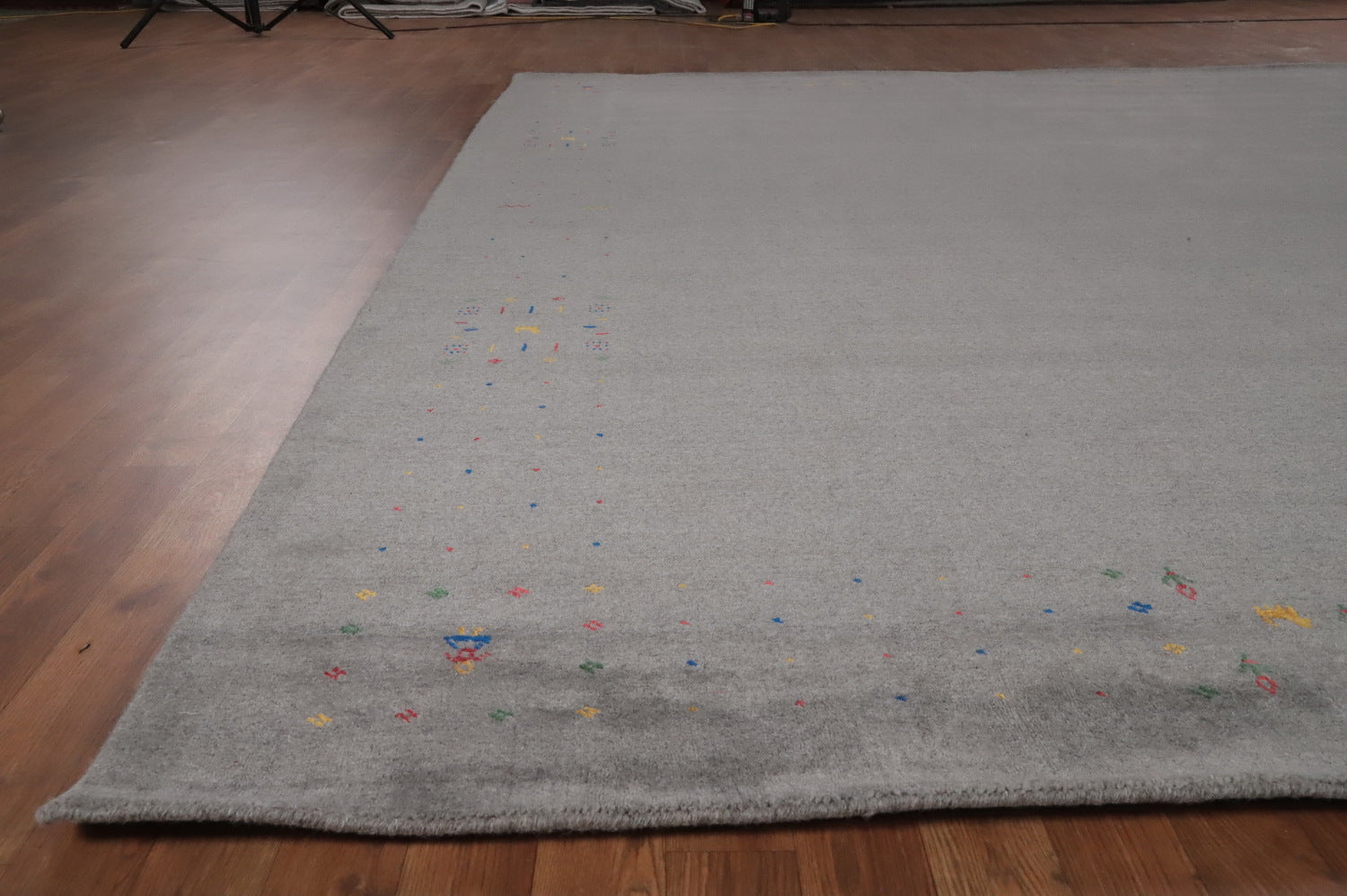 A Beautiful Genuine India Gabbeh rug is Hand Knotted by skillful weavers in India with 100% Wool Material. This rug is in New, First Quality condition. dimensions are 12' 2'' X 9' 4'' in foot and 371 X 284 in centimeter. the primary color is Greys & Charcoal.