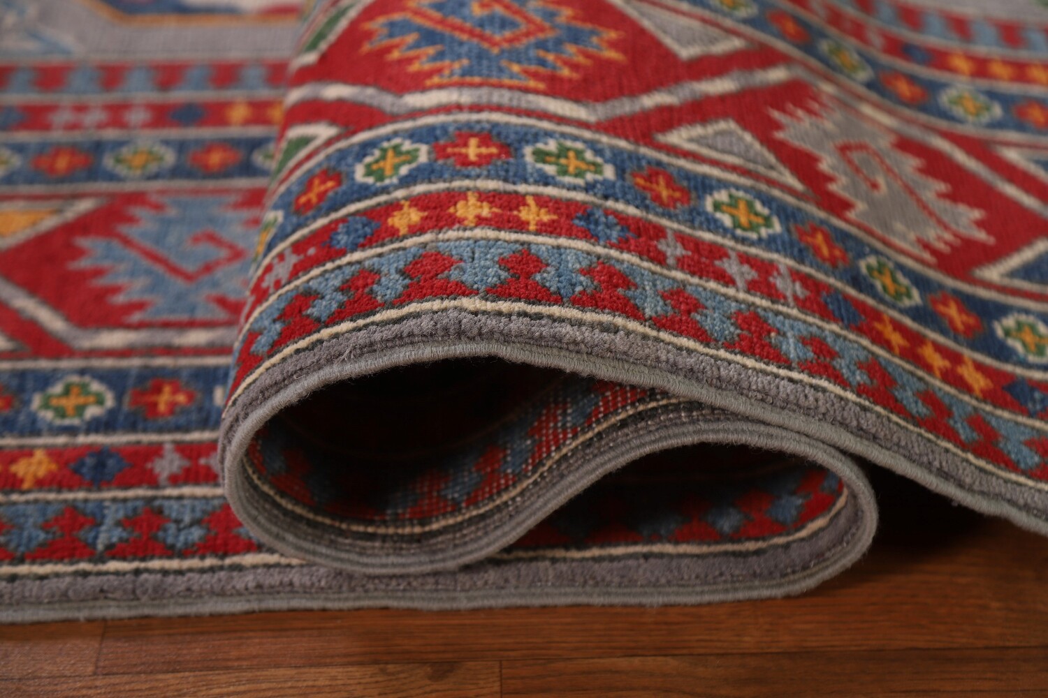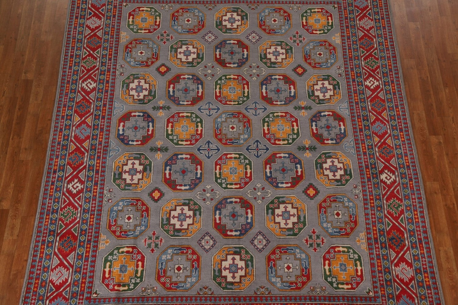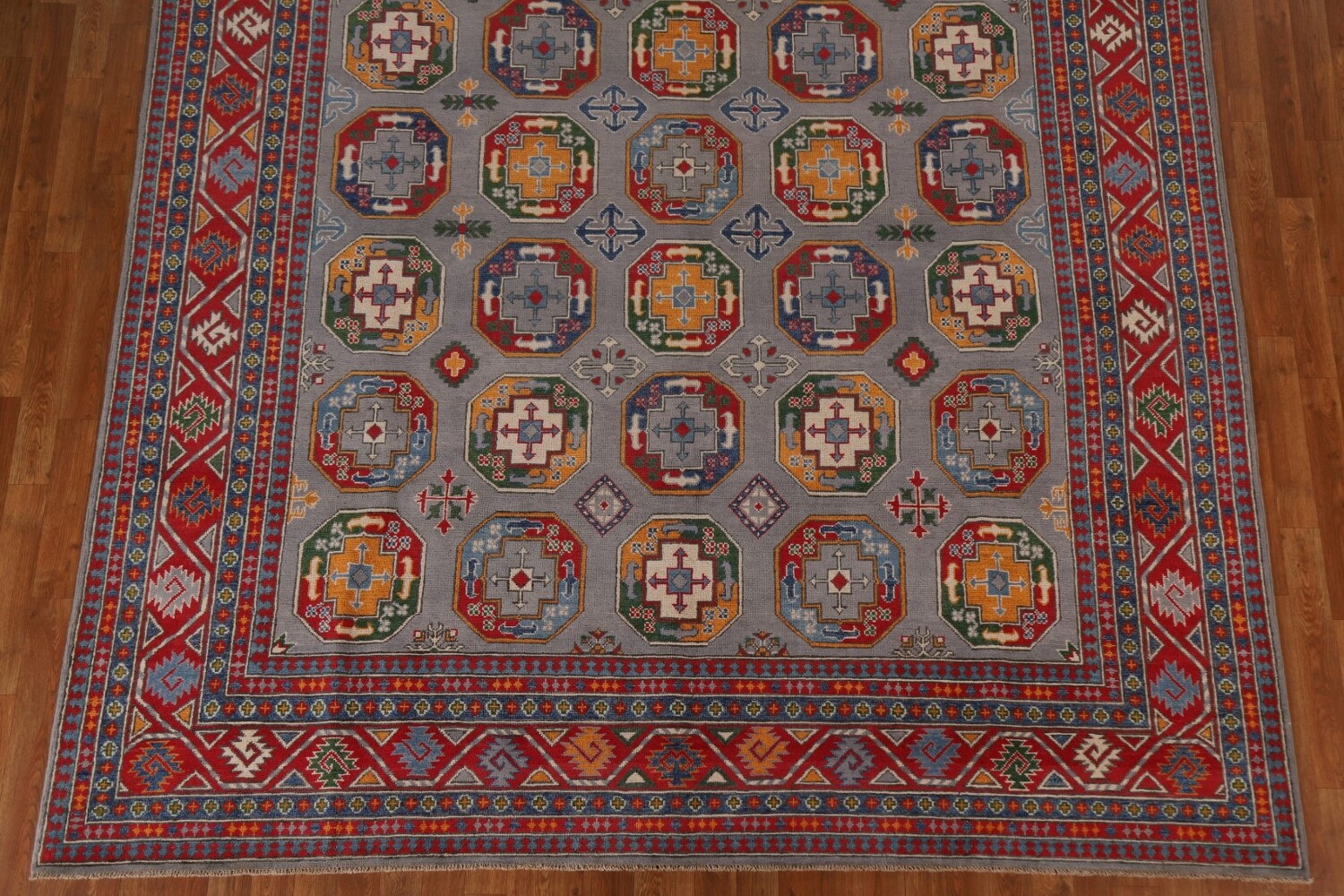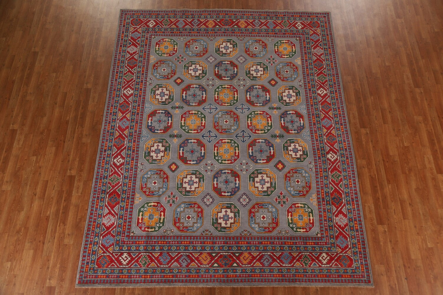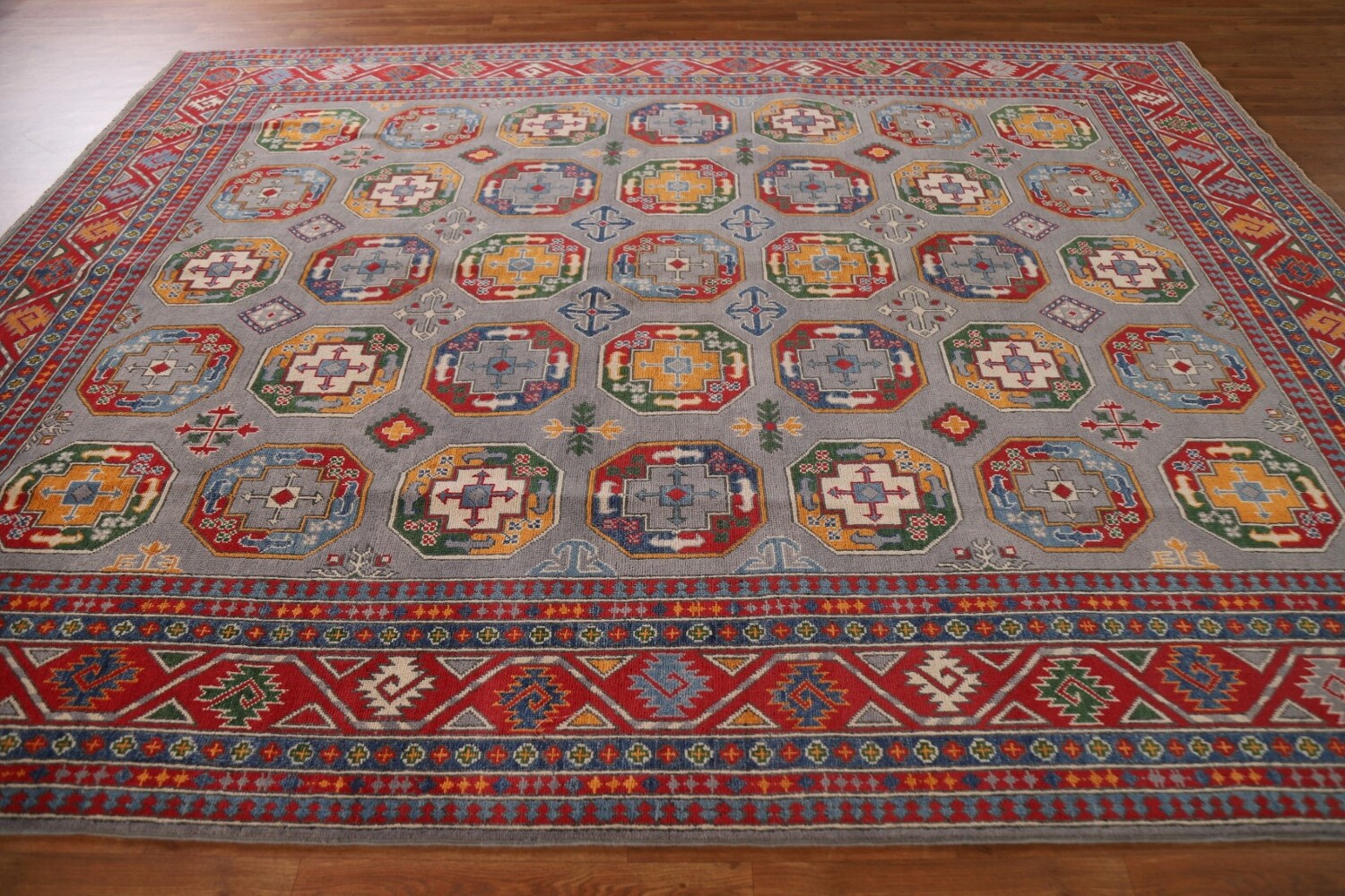 A Beautiful Genuine Pakistan Kazak rug is Hand Knotted by skillful weavers in Pakistan with 100% Wool Material. This rug is in New, First Quality condition. dimensions are 10' 4'' X 8' 2'' in foot and 315 X 249 in centimeter. the primary color is Greys & Charcoal.