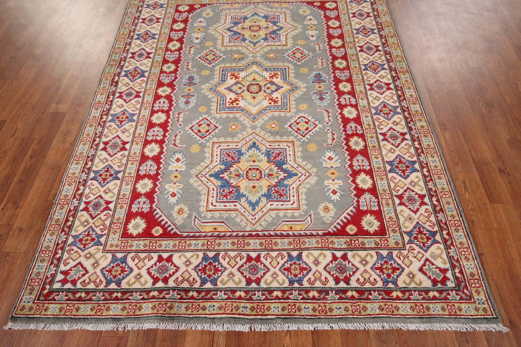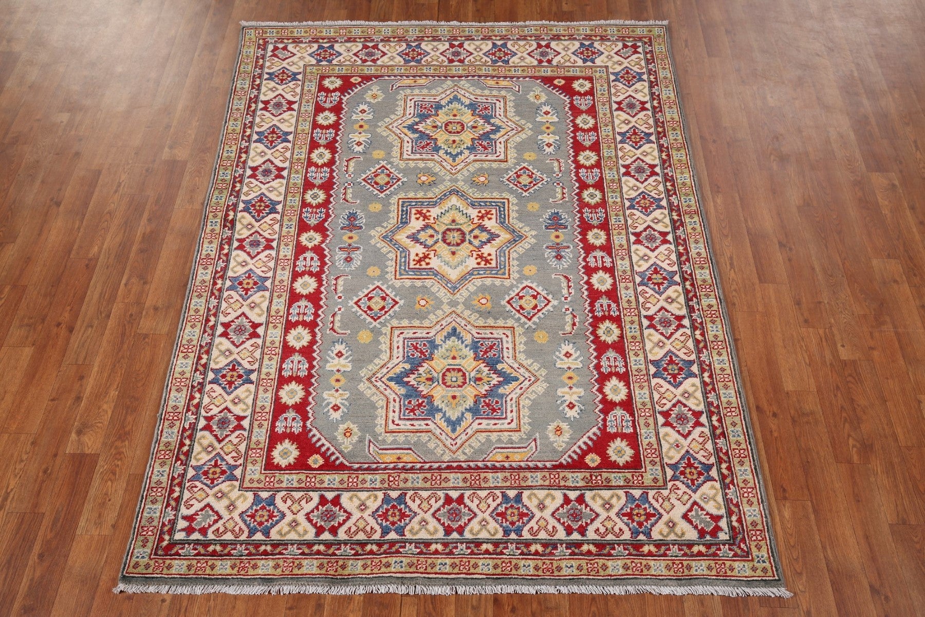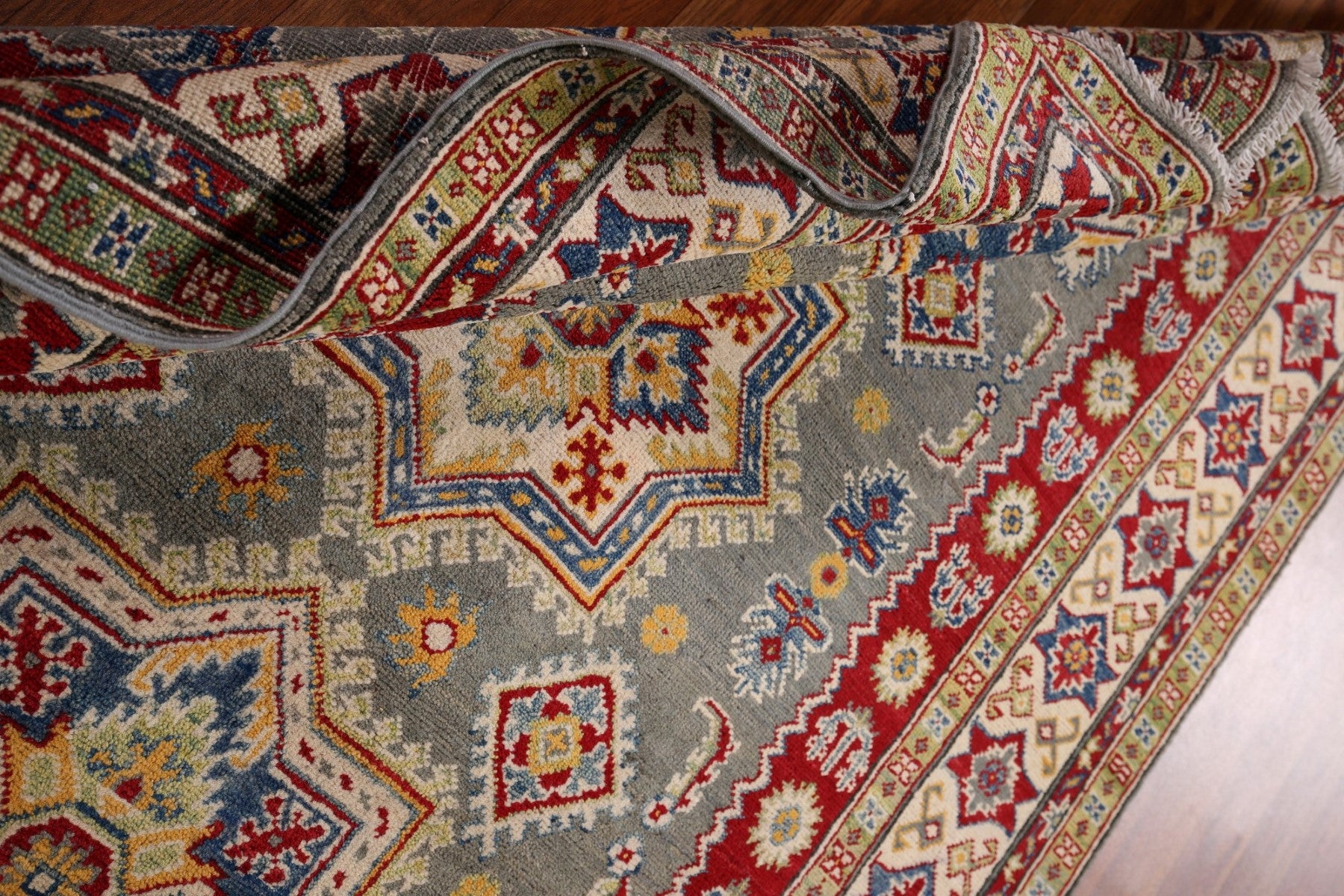 A Beautiful Genuine Pakistan Kazak rug is Hand Knotted by skillful weavers in Pakistan with 100% Wool Material. This rug is in New, First Quality condition. dimensions are 6' 8'' X 4' 11'' in foot and 203 X 150 in centimeter. the primary color is Greys & Charcoal.