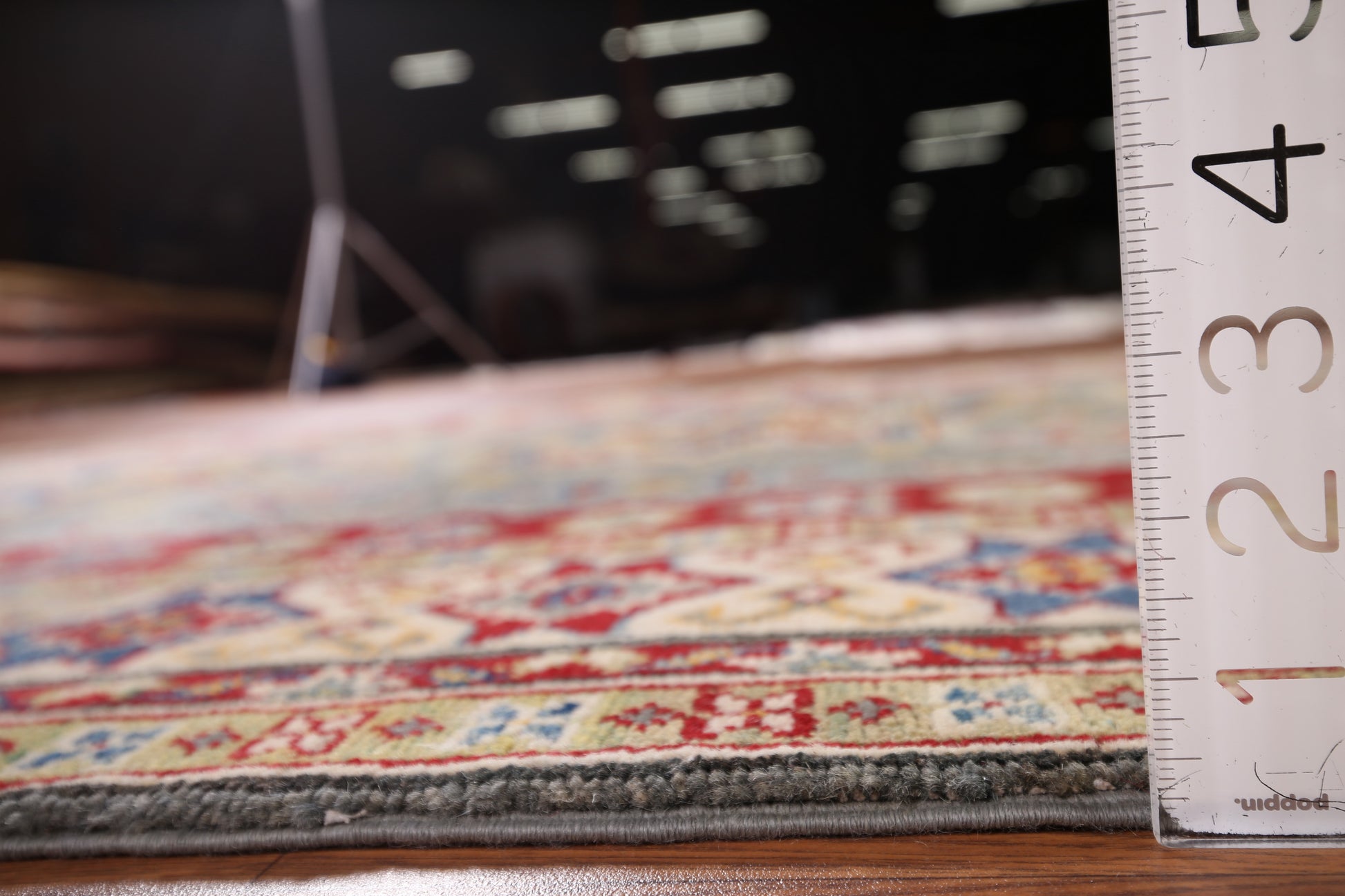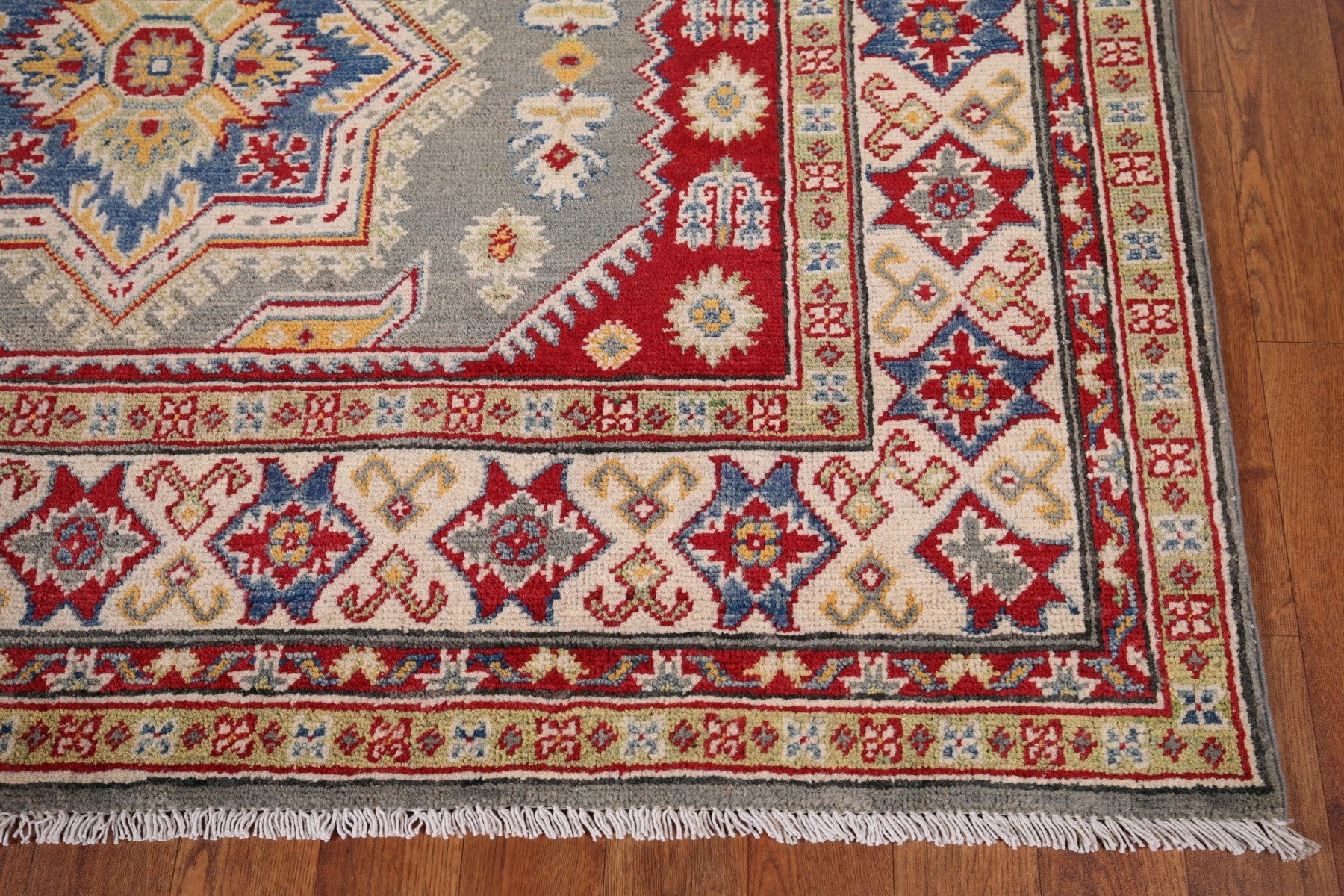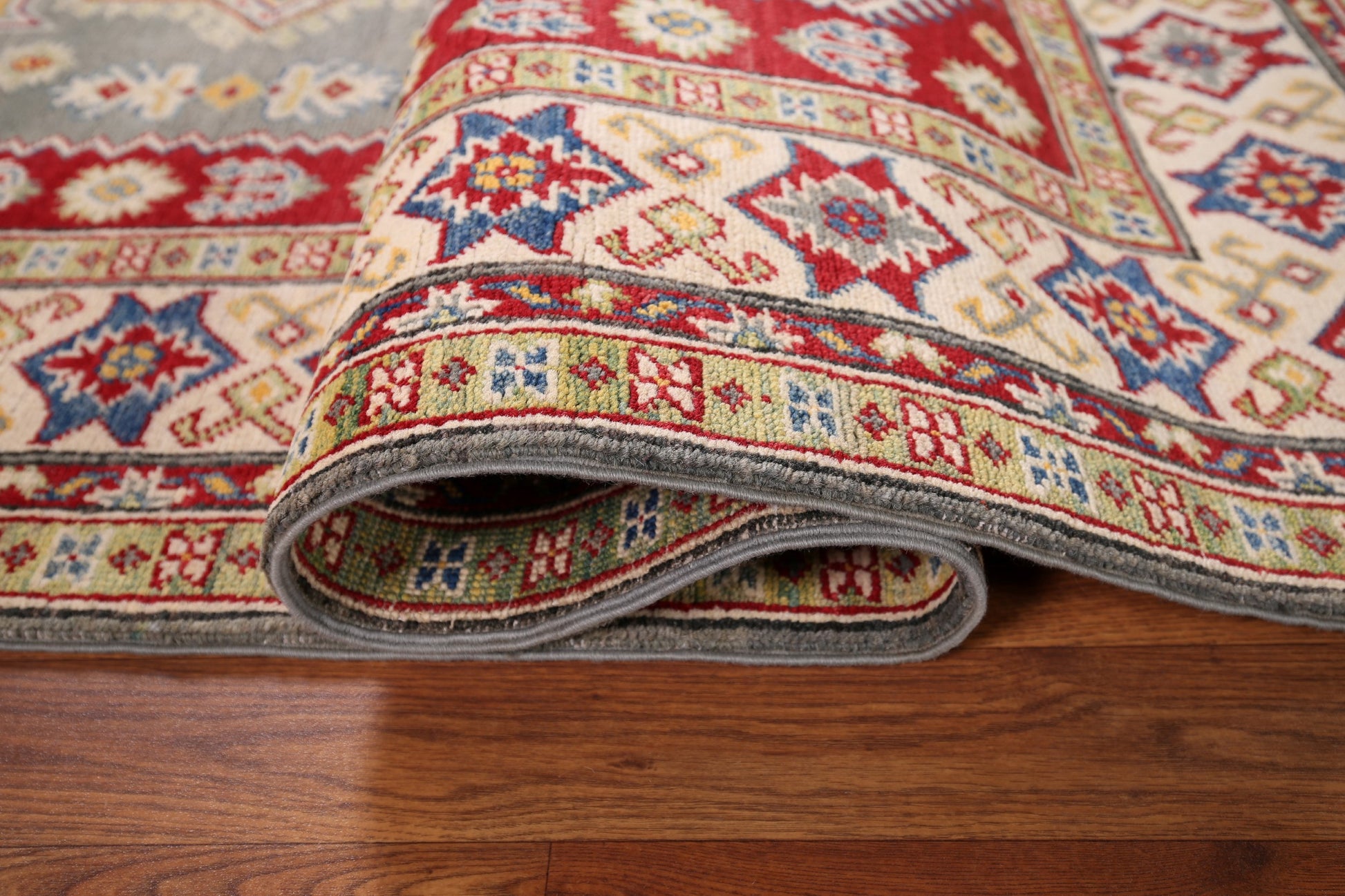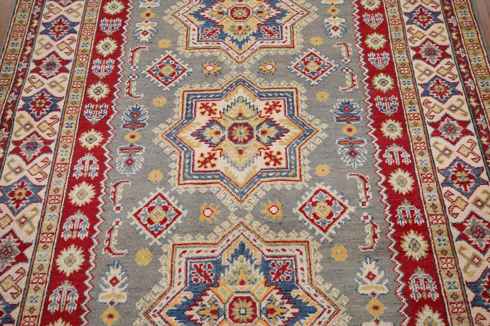 A Beautiful Genuine Pakistan Kazak rug is Hand Knotted by skillful weavers in Pakistan with 100% Wool Material. This rug is in New, First Quality condition. dimensions are 6' 8'' X 4' 11'' in foot and 203 X 150 in centimeter. the primary color is Greys & Charcoal.