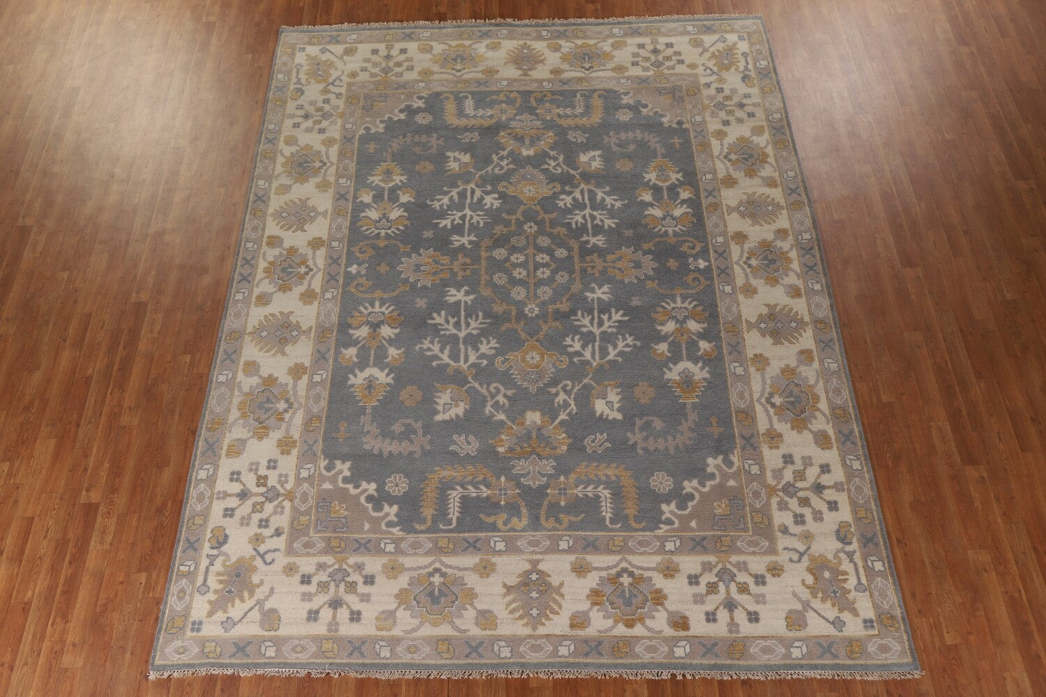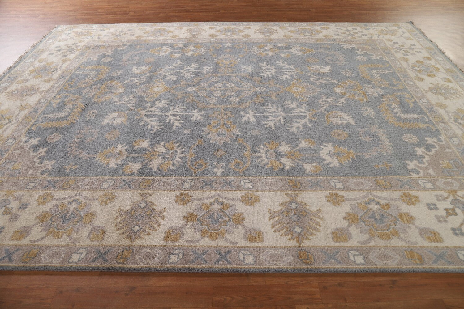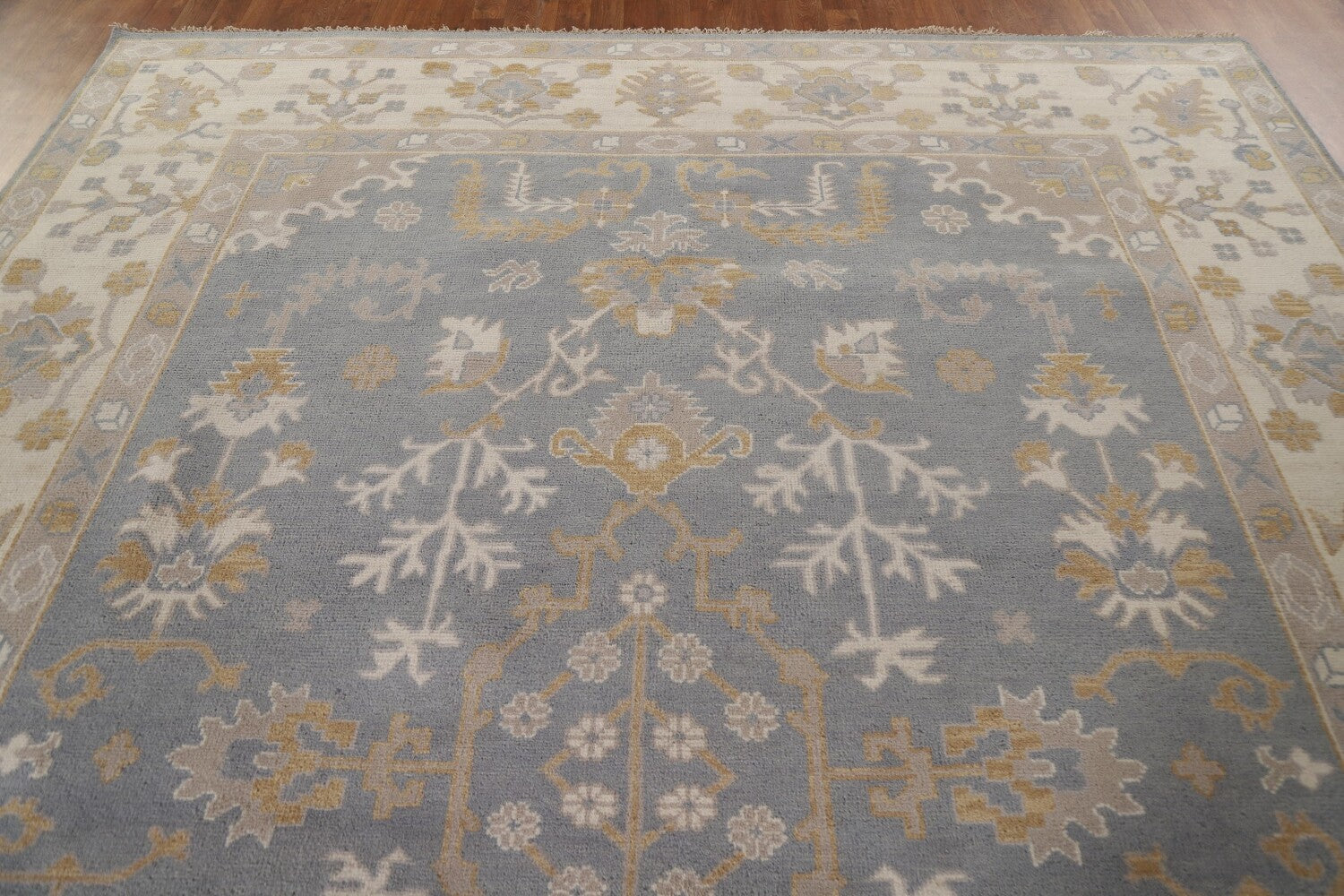 A Beautiful Genuine India Oushak rug is Hand Knotted by skillful weavers in India with 100% Wool Material. This rug is in New, First Quality condition. dimensions are 11' 9'' X 9' 0'' in foot and 358 X 274 in centimeter. the primary color is Greys & Charcoal.