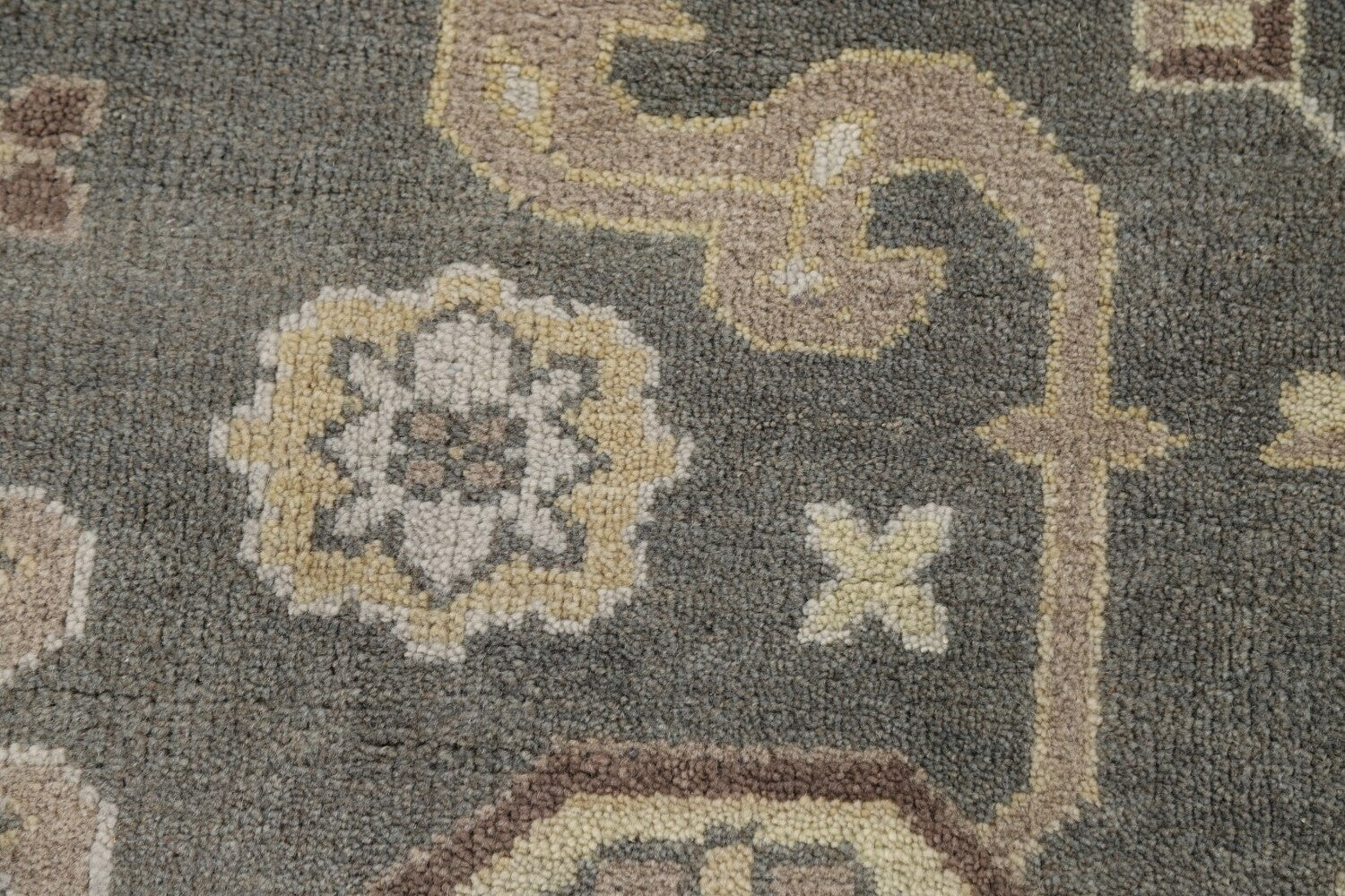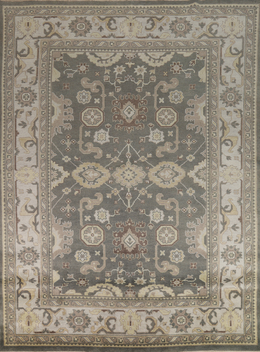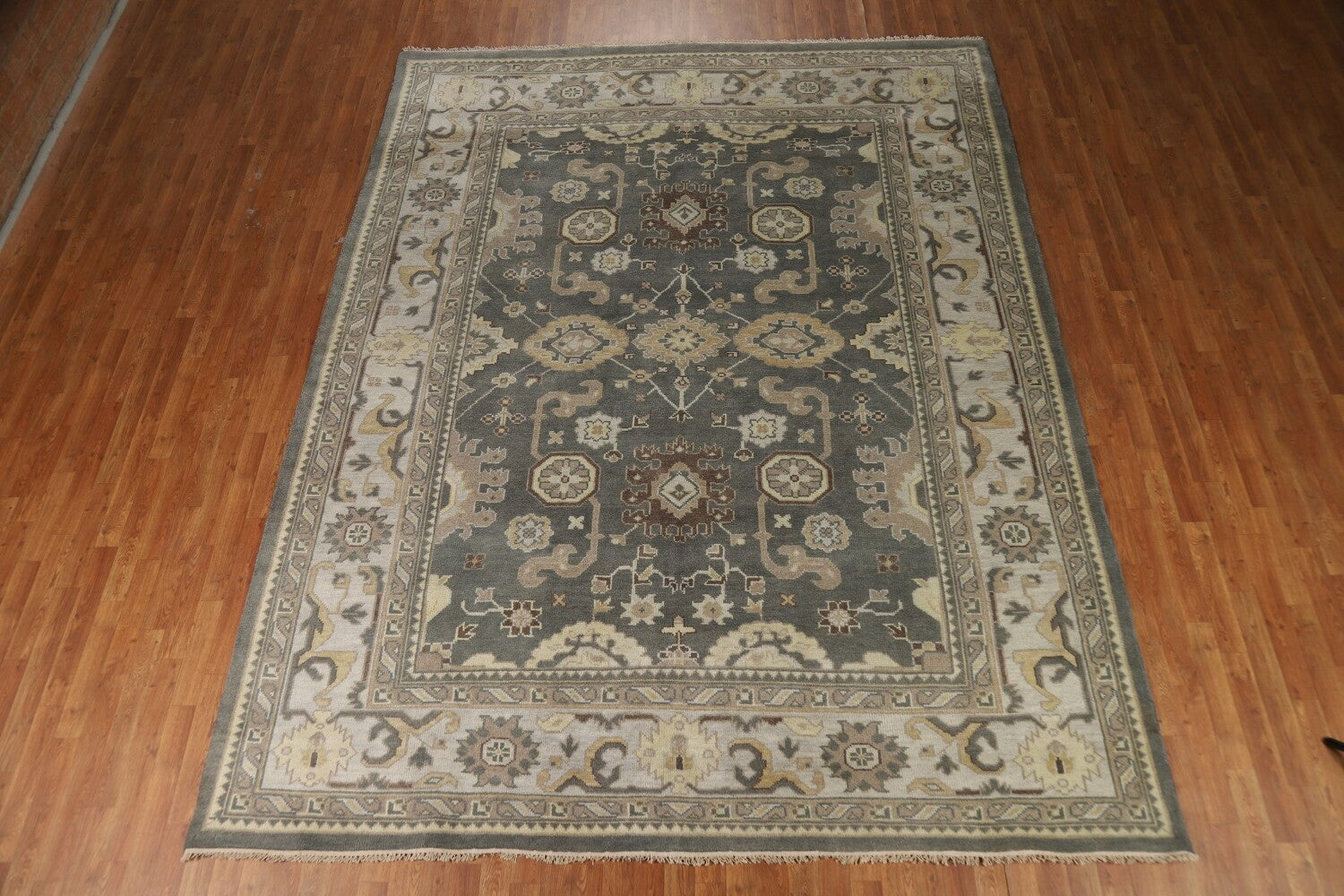 A Beautiful Genuine India Oushak rug is Hand Knotted by skillful weavers in India with 100% Wool Material. This rug is in New, First Quality condition. dimensions are 11' 8'' X 9' 0'' in foot and 356 X 274 in centimeter. the primary color is Greys & Charcoal.