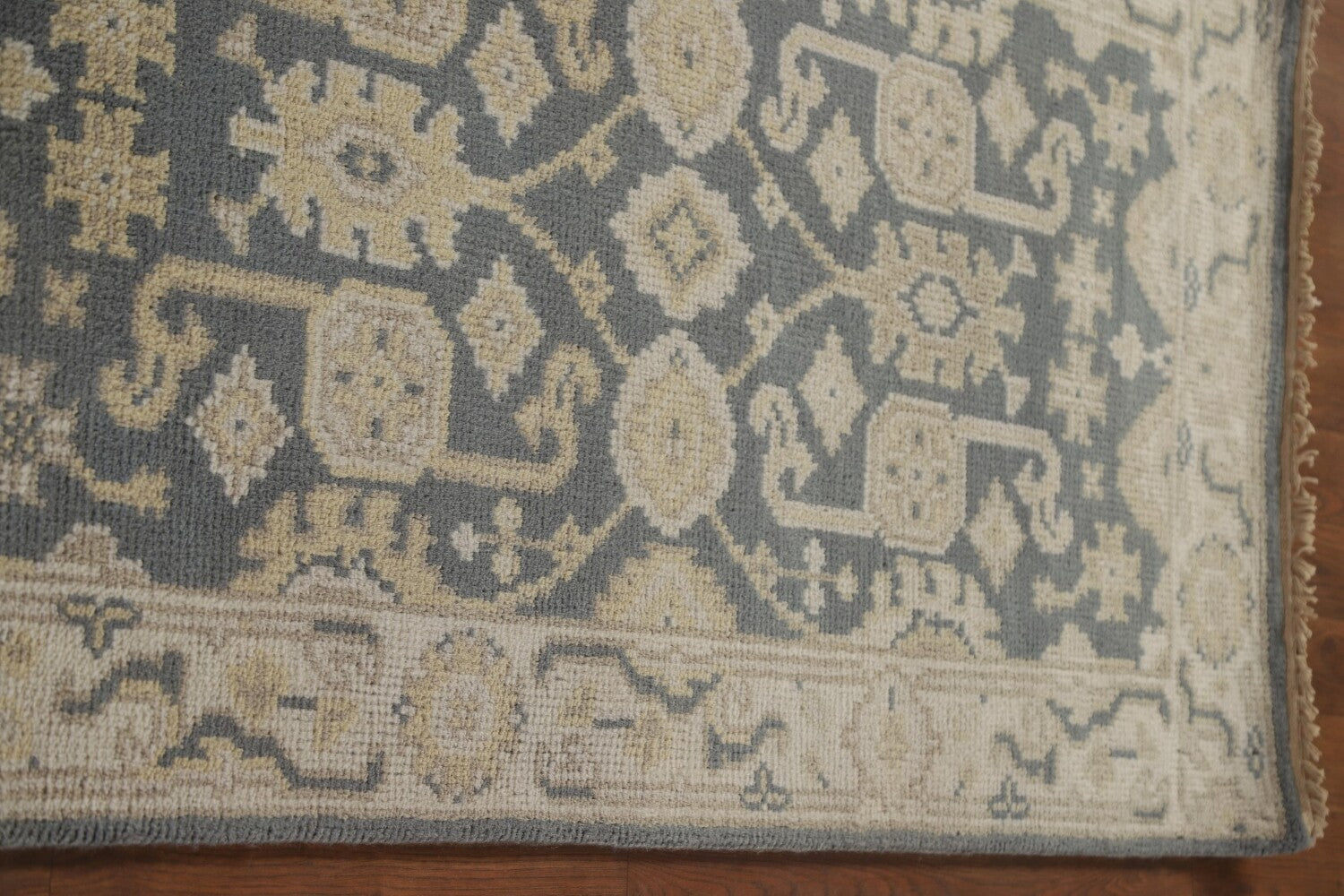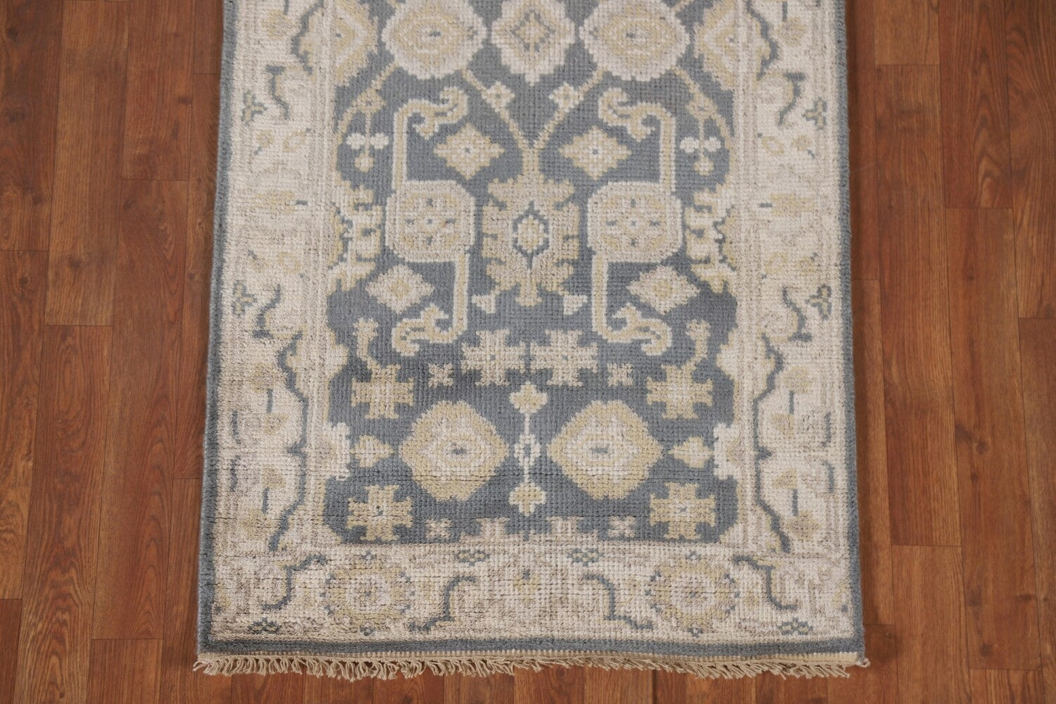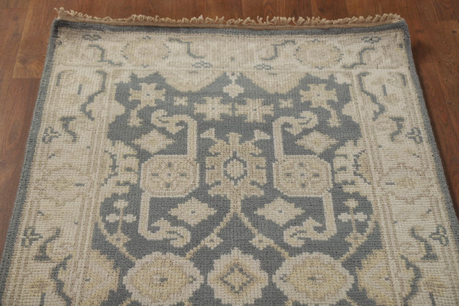 A Beautiful Genuine India Oushak rug is Hand Knotted by skillful weavers in India with 100% Wool Material. This rug is in New, First Quality condition. dimensions are 15' 11'' X 2' 8'' in foot and 485 X 81 in centimeter. the primary color is Greys & Charcoal.