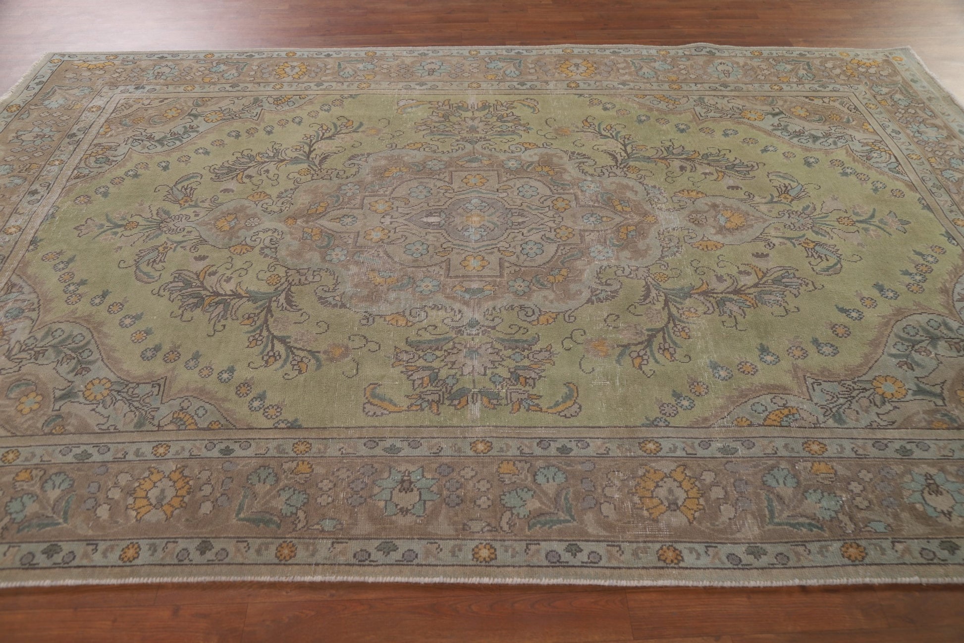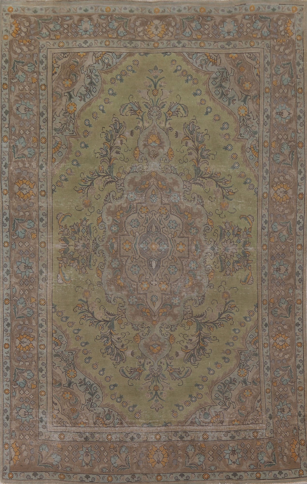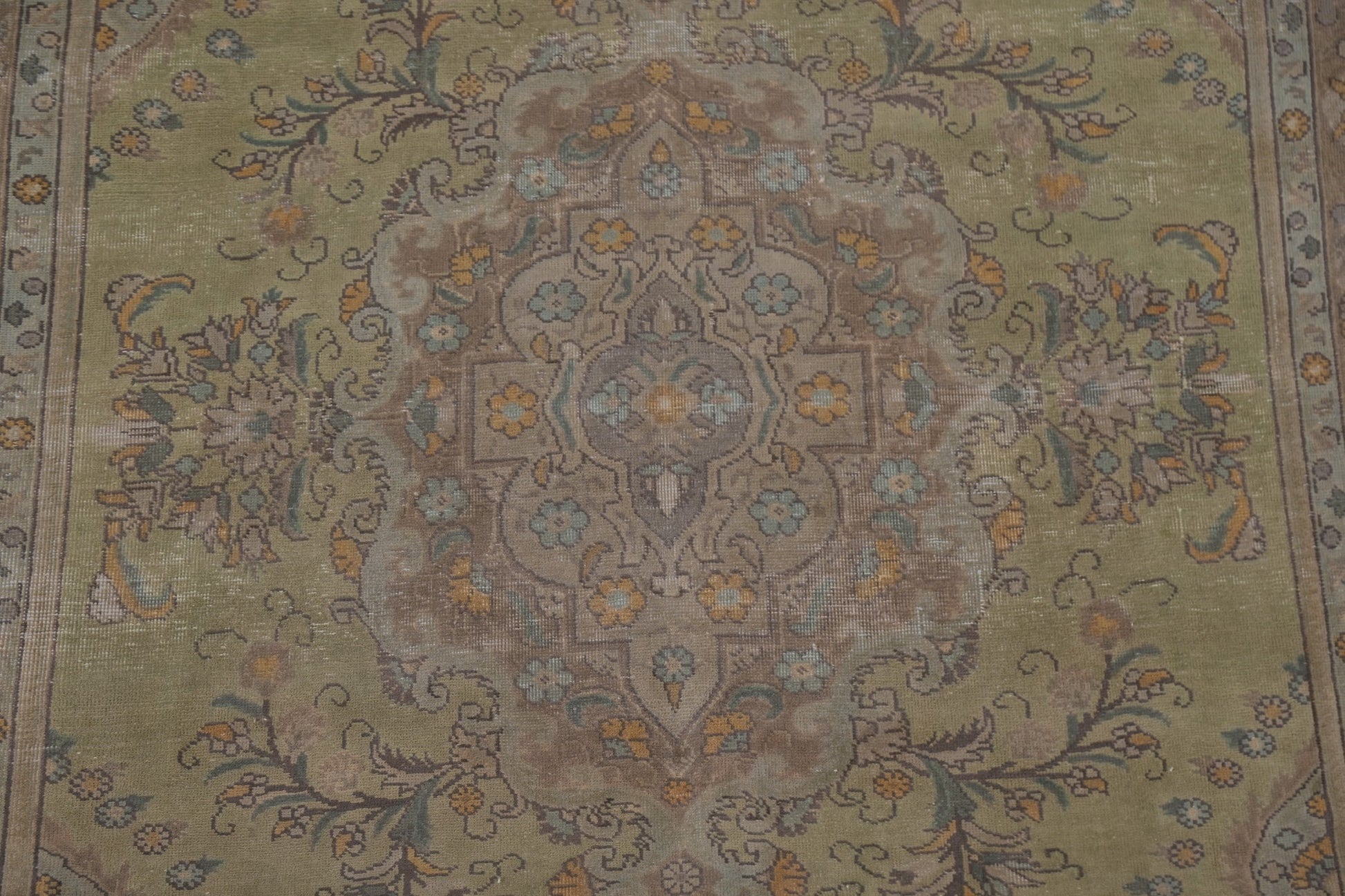 A Beautiful Genuine Persia ( Persia ) Tabriz rug is Hand Knotted by skillful weavers in Persia ( Persia ) with 100% Wool Material. This rug is in Very Good (Evenly Low Pile) condition. dimensions are 9' 8'' X 6' 6'' in foot and 295 X 198 in centimeter. the primary color is Green.