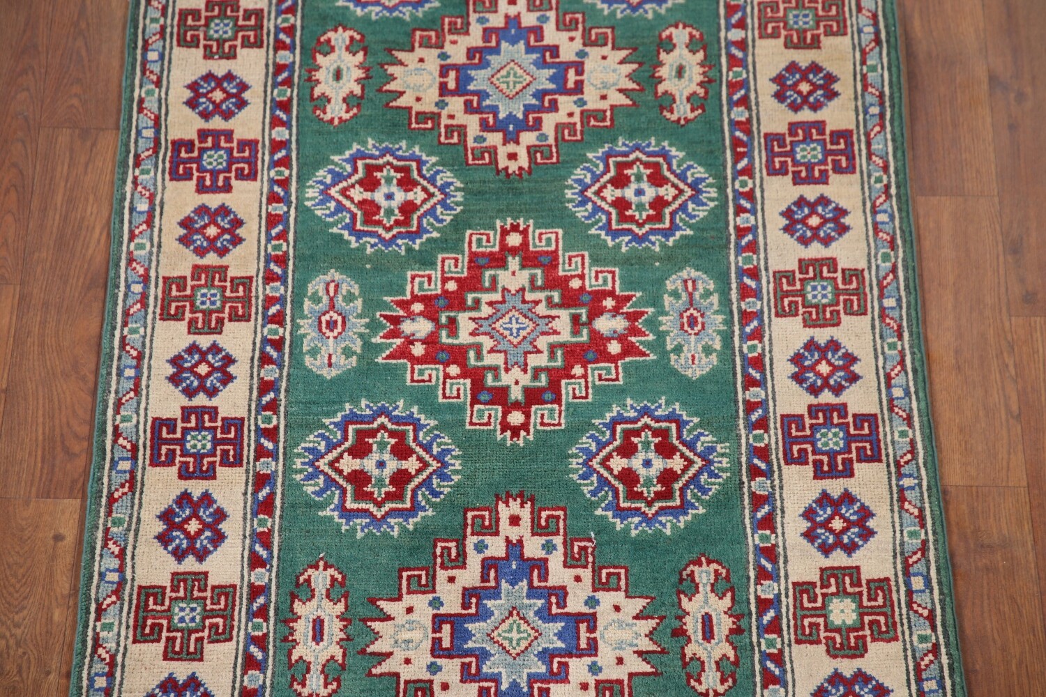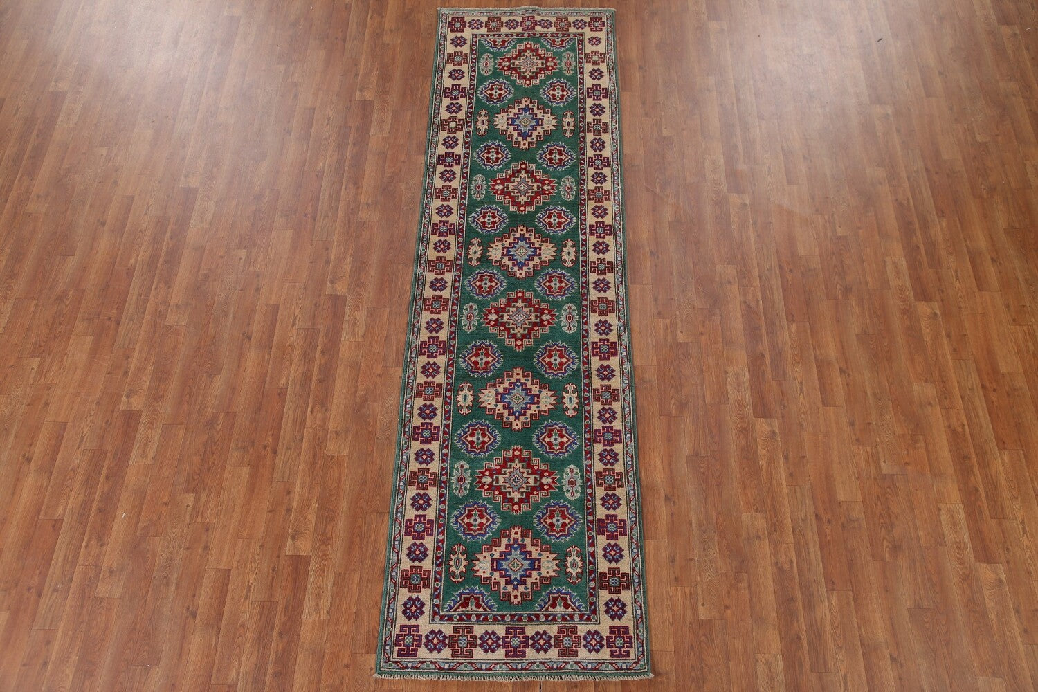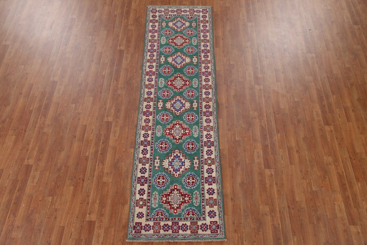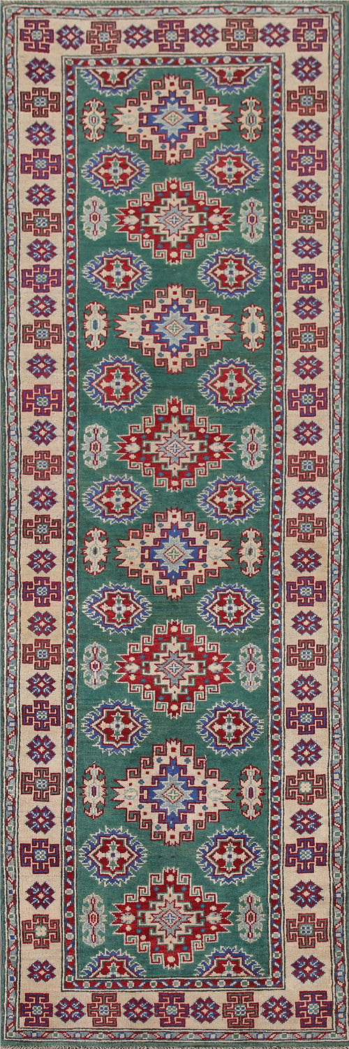 A Beautiful Genuine Pakistan Kazak rug is Hand Knotted by skillful weavers in Pakistan with 100% Wool Material. This rug is in New, First Quality condition. dimensions are 9' 8'' X 2' 8'' in foot and 295 X 81 in centimeter. the primary color is Green.