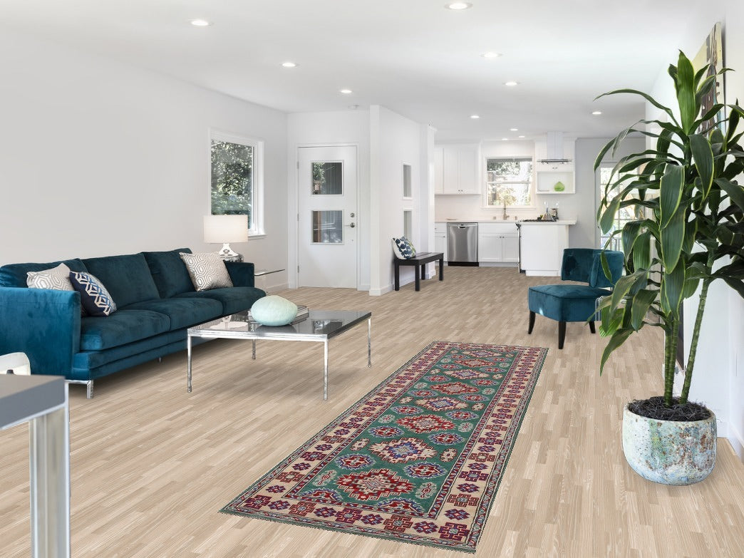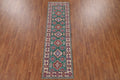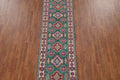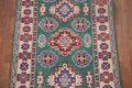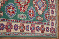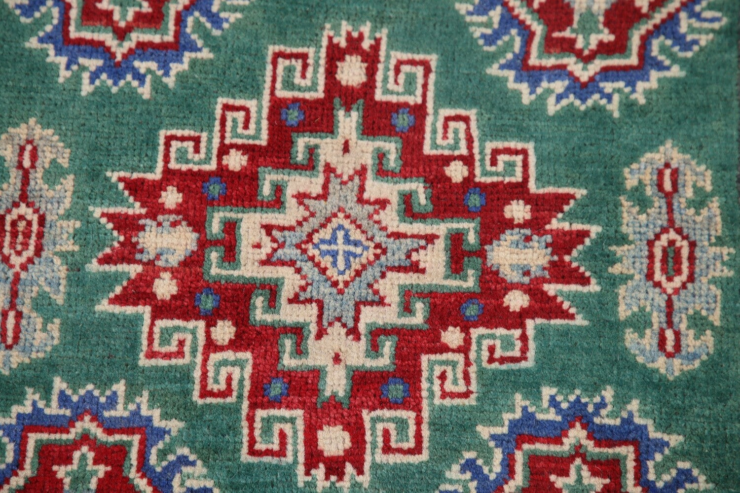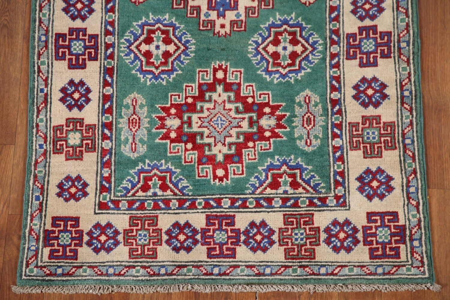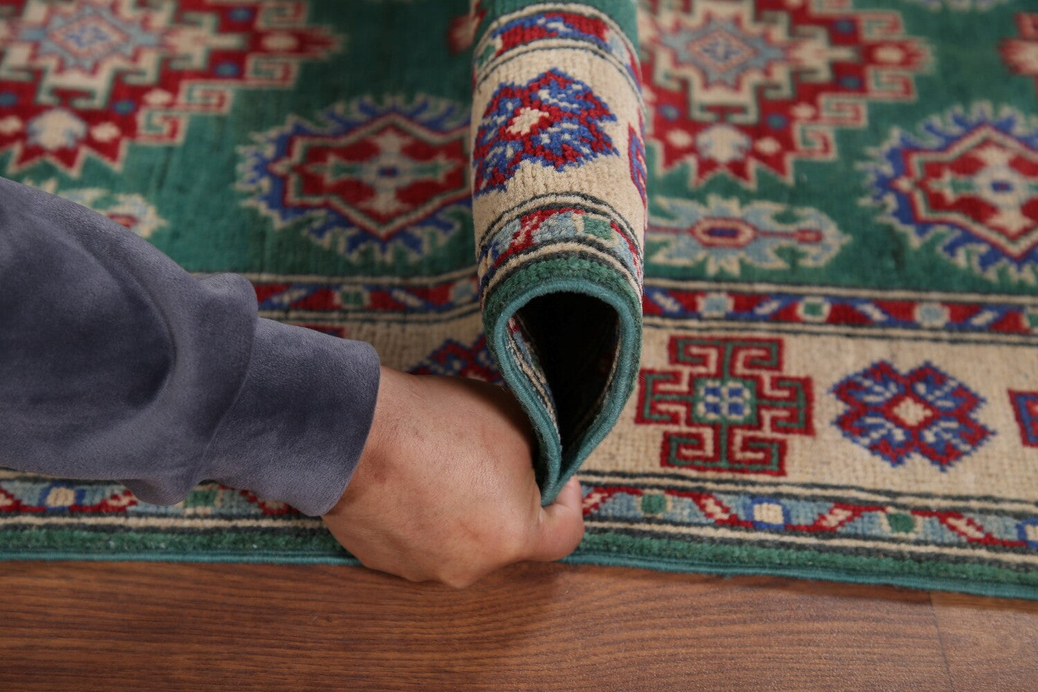A Beautiful Genuine Pakistan Kazak rug is Hand Knotted by skillful weavers in Pakistan with 100% Wool Material. This rug is in New, First Quality condition. dimensions are 9' 8'' X 2' 8'' in foot and 295 X 81 in centimeter. the primary color is Green.