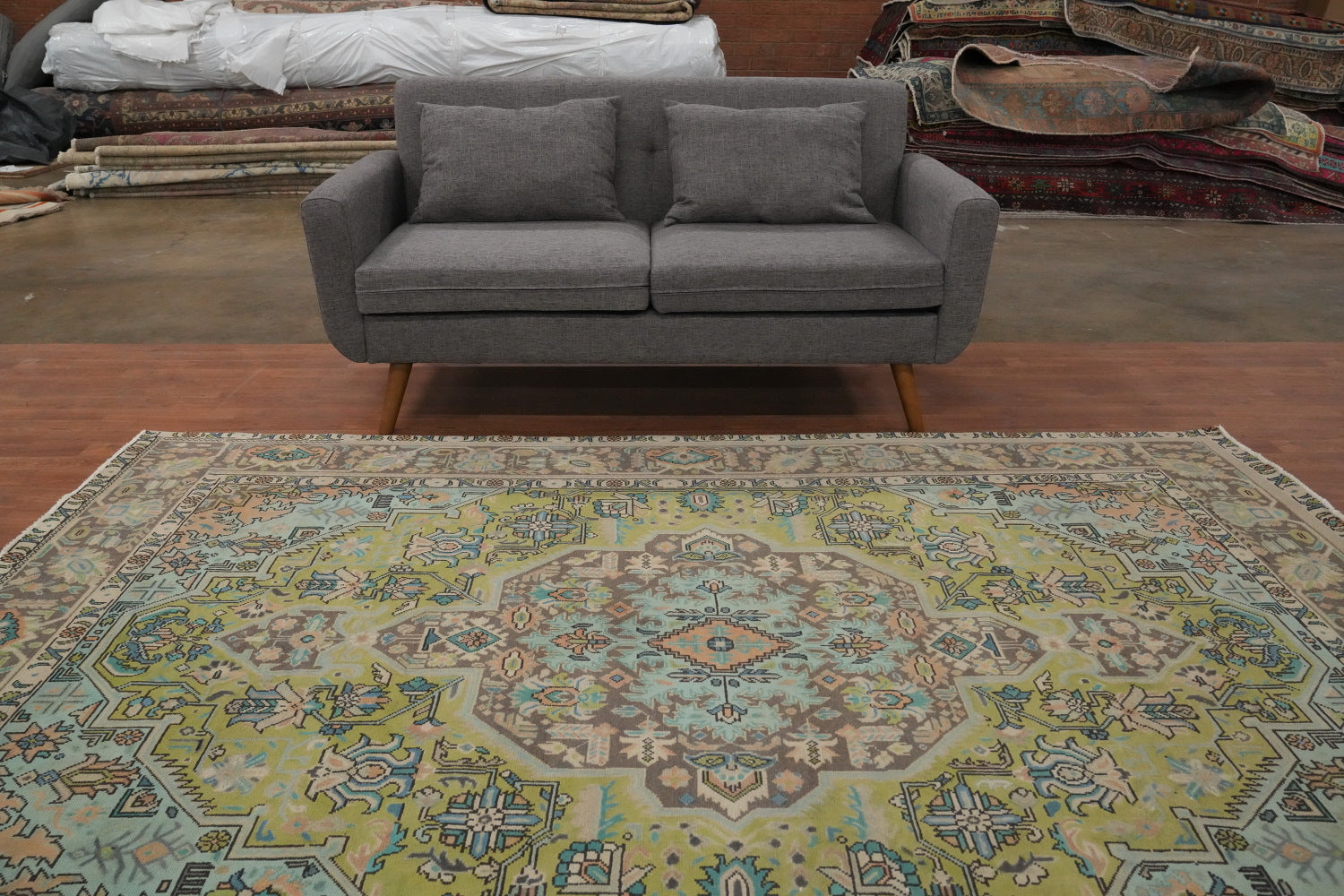 A Beautiful Genuine Persia ( Persia ) Tabriz rug is Hand Knotted by skillful weavers in Persia ( Persia ) with 100% Wool Material. This rug is in Very Good (Evenly Low Pile) condition. dimensions are 9' 2'' X 6' 5'' in foot and 279 X 196 in centimeter. the primary color is Green.