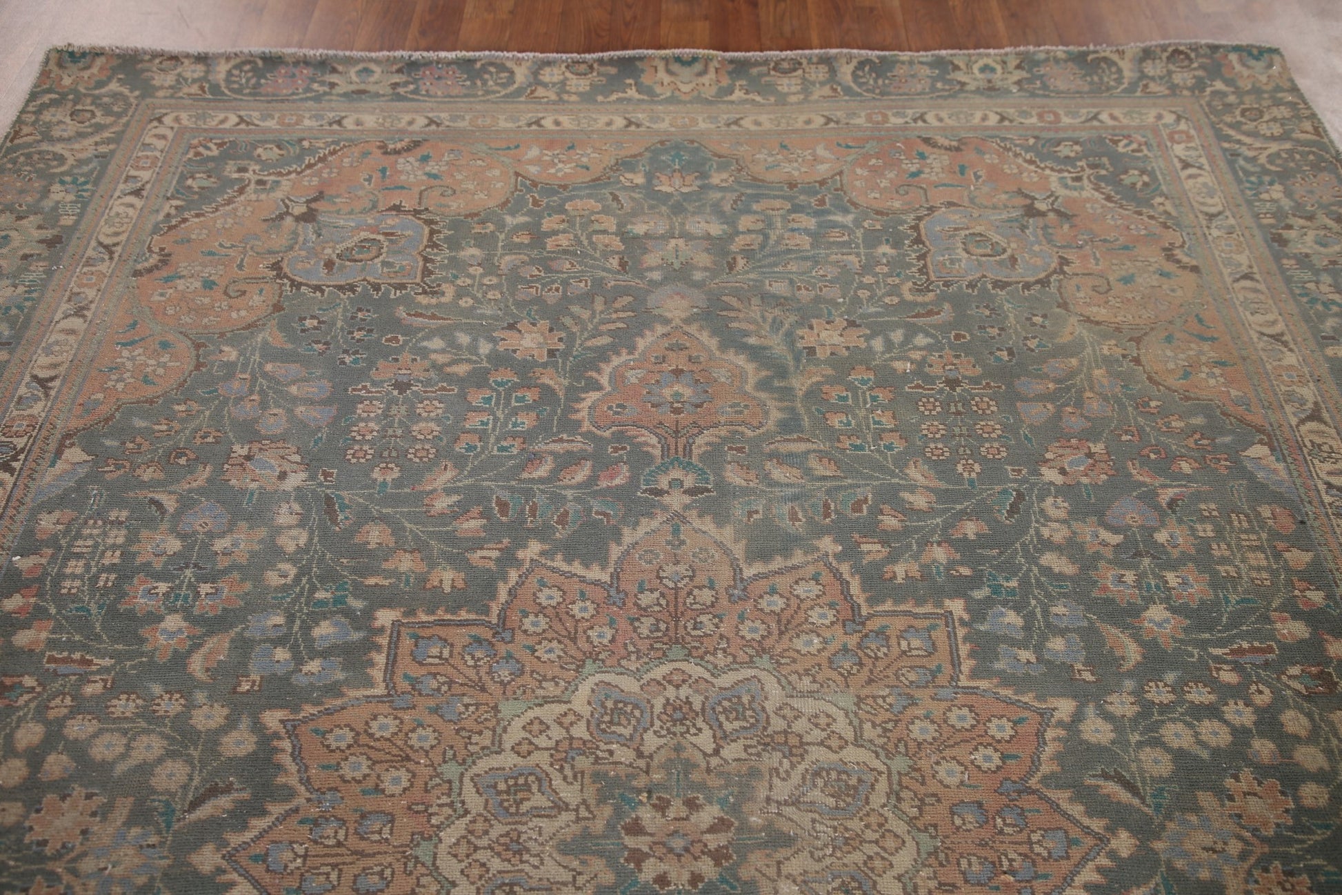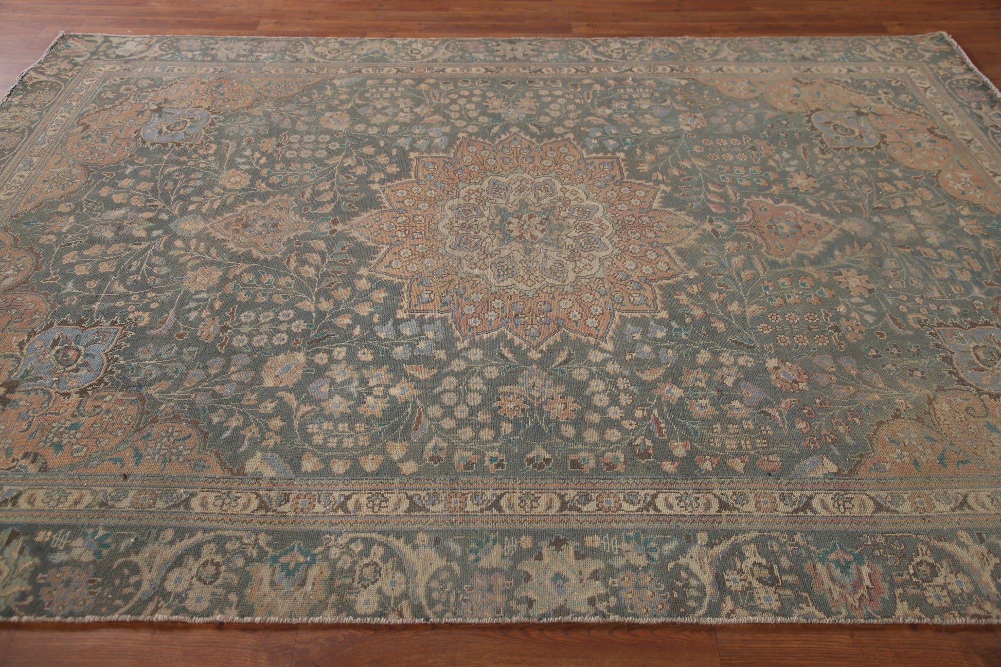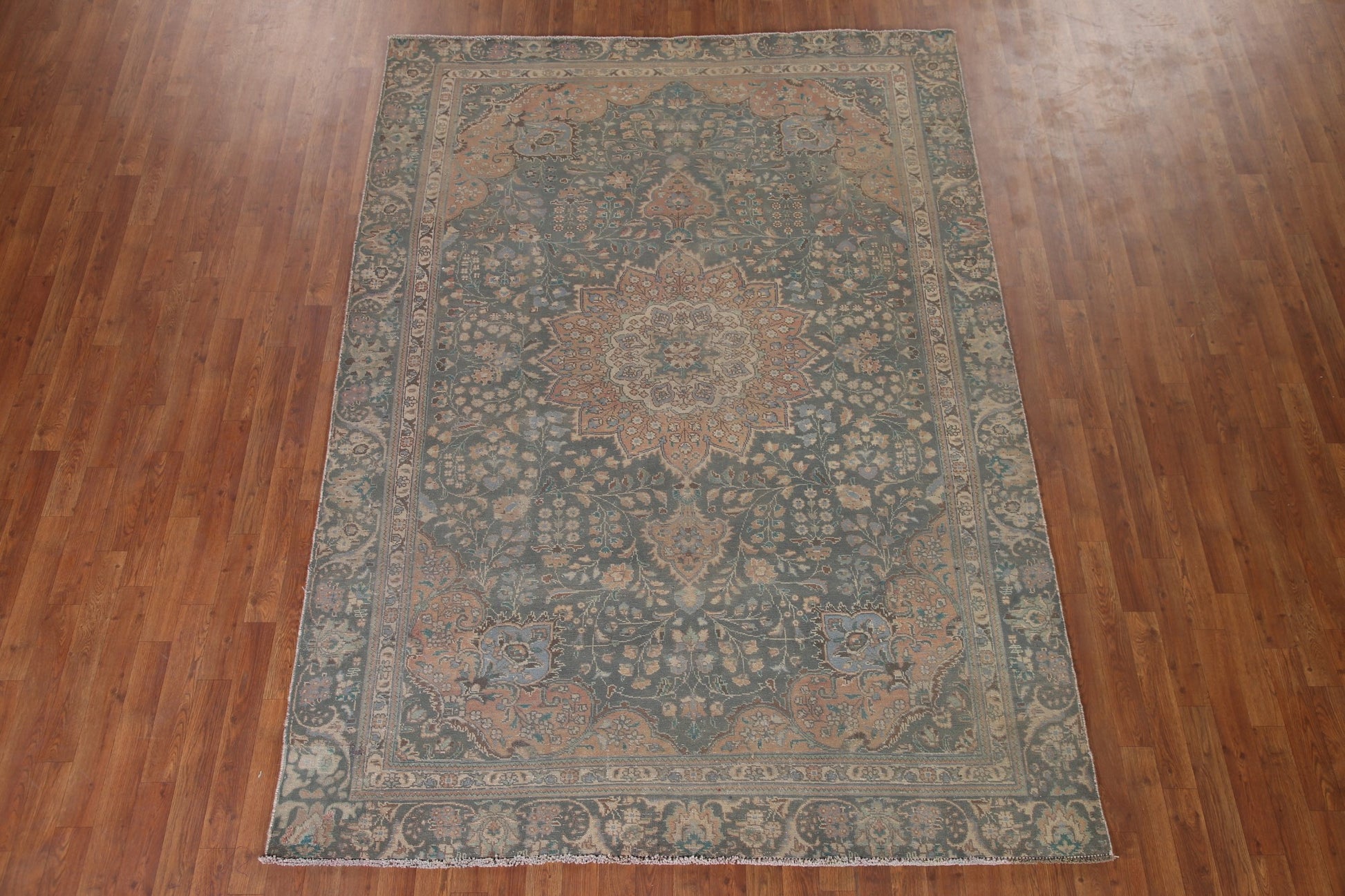 A Beautiful Genuine Persia ( Persia ) Tabriz rug is Hand Knotted by skillful weavers in Persia ( Persia ) with 100% Wool Material. This rug is in Very Good (Evenly Low Pile-Repair) condition. dimensions are 8' 11'' X 6' 5'' in foot and 272 X 196 in centimeter. the primary color is Green.