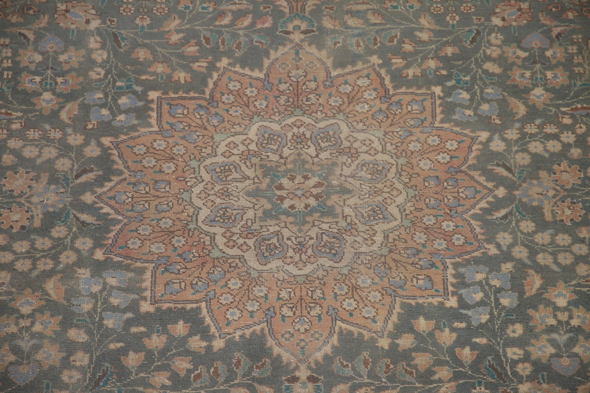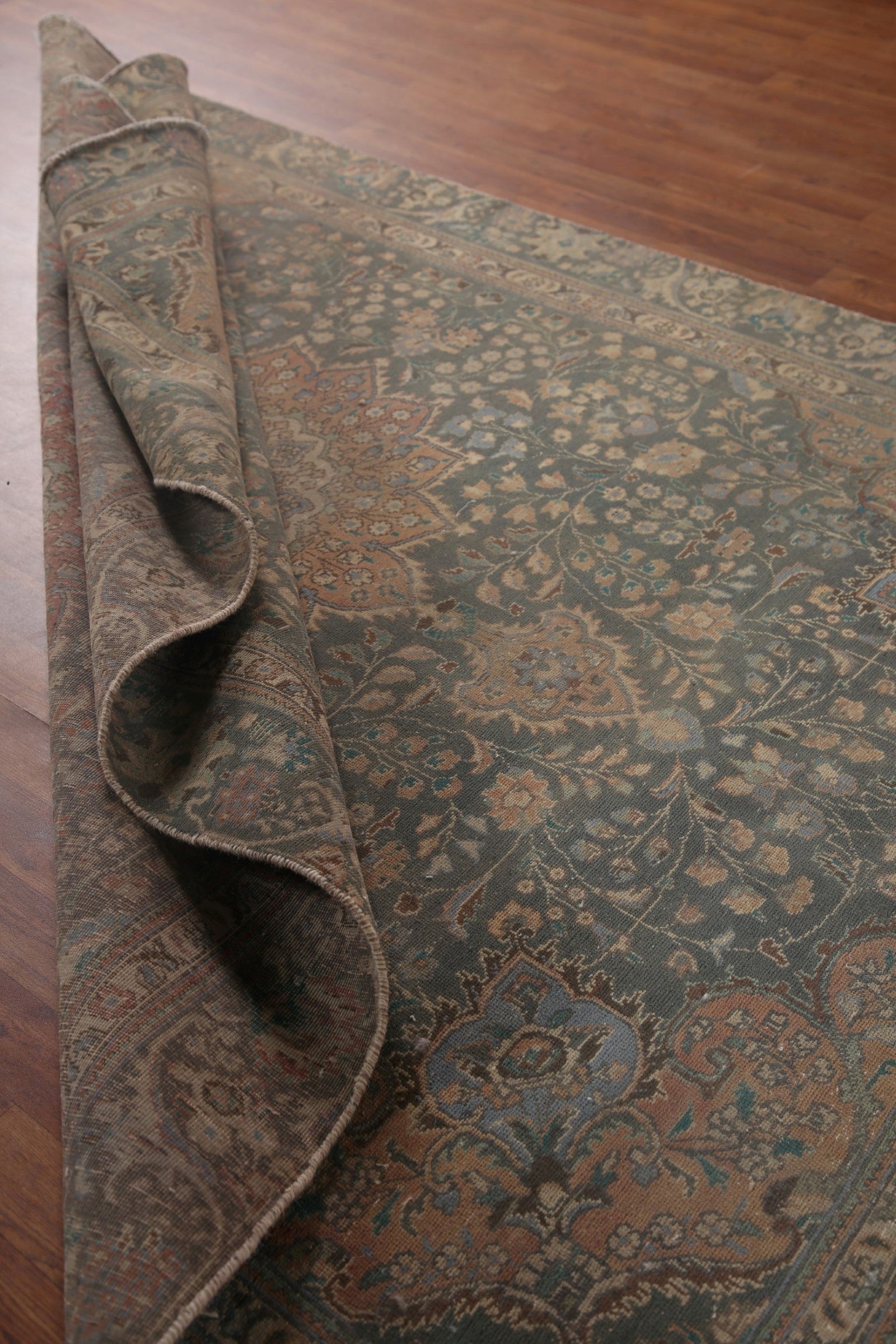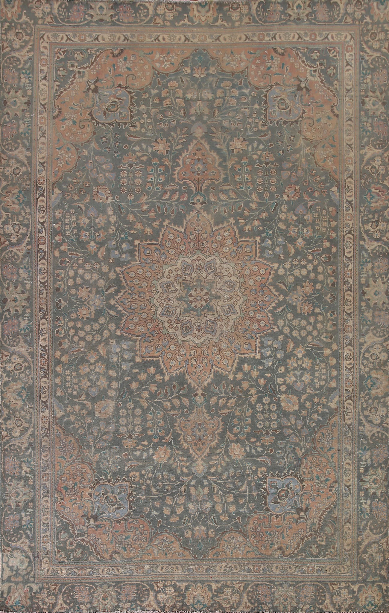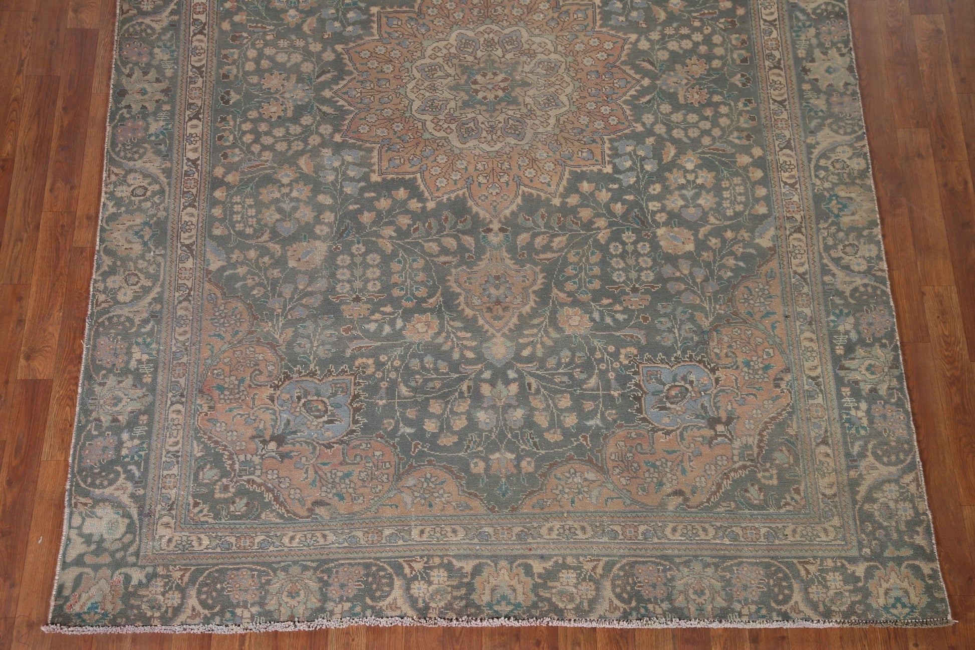 A Beautiful Genuine Persia ( Persia ) Tabriz rug is Hand Knotted by skillful weavers in Persia ( Persia ) with 100% Wool Material. This rug is in Very Good (Evenly Low Pile-Repair) condition. dimensions are 8' 11'' X 6' 5'' in foot and 272 X 196 in centimeter. the primary color is Green.