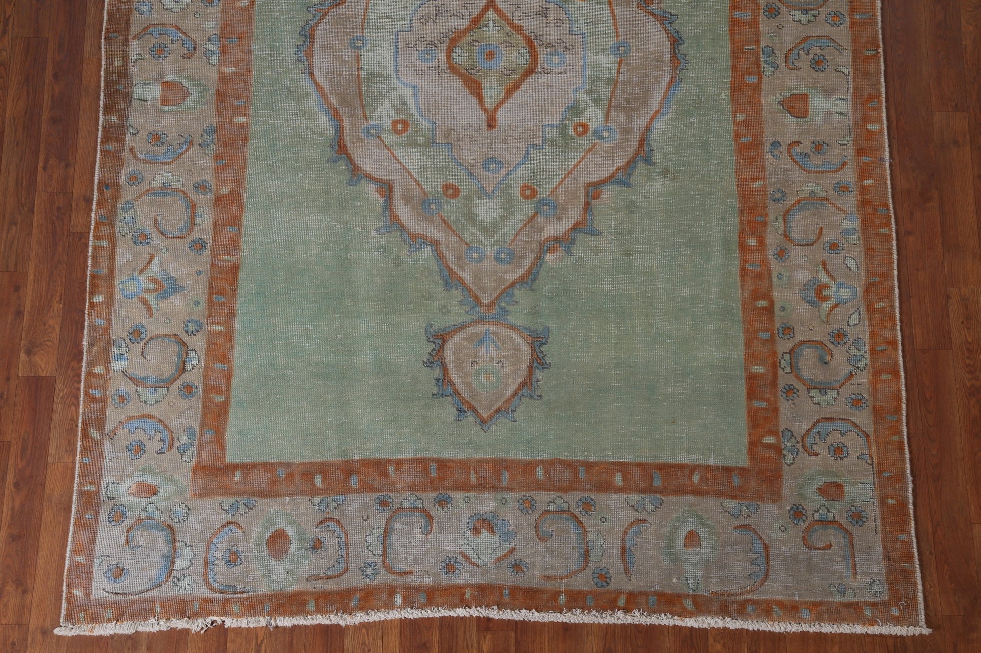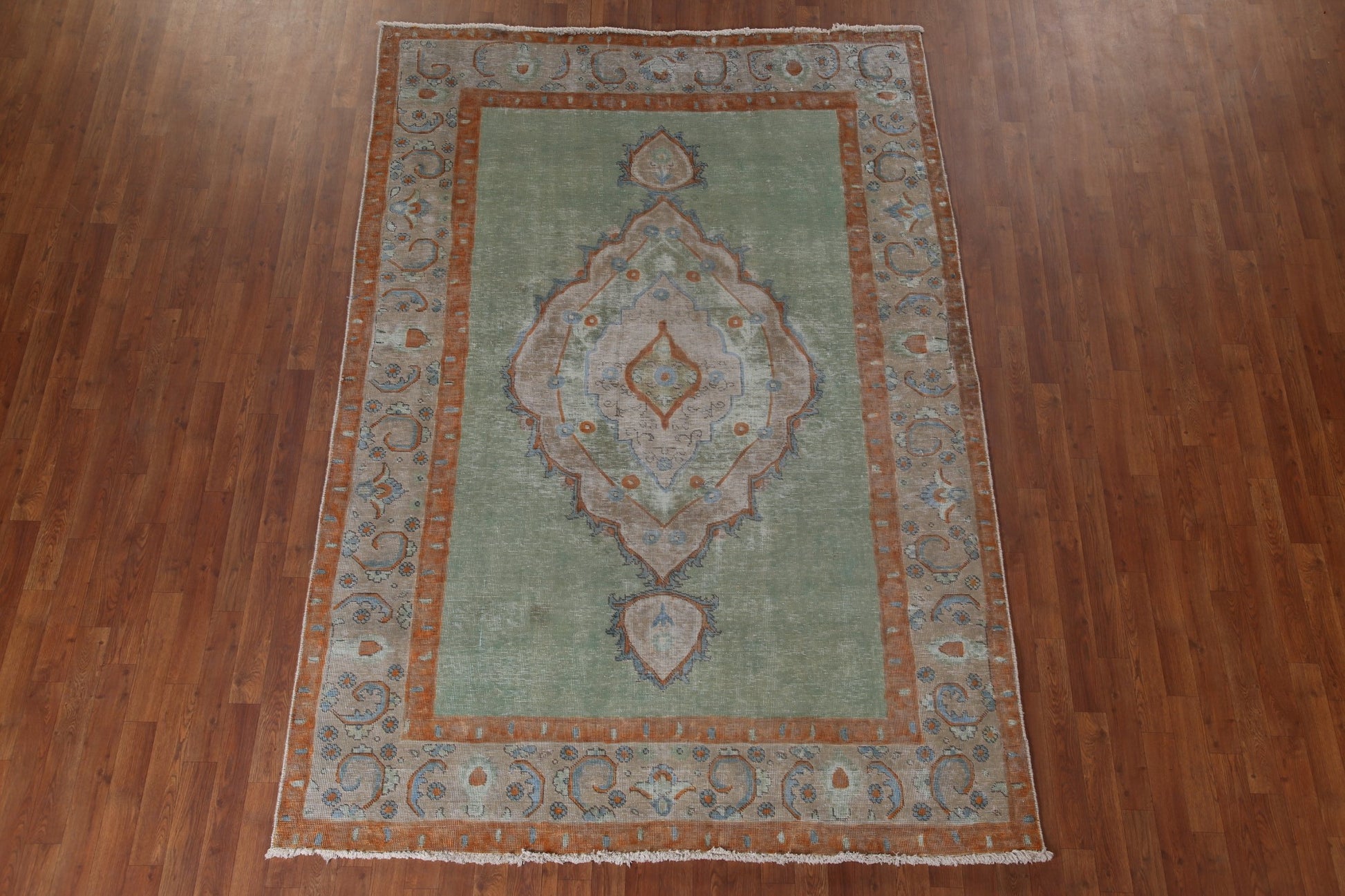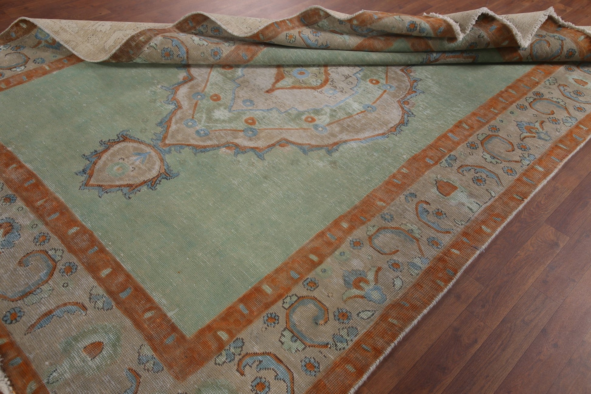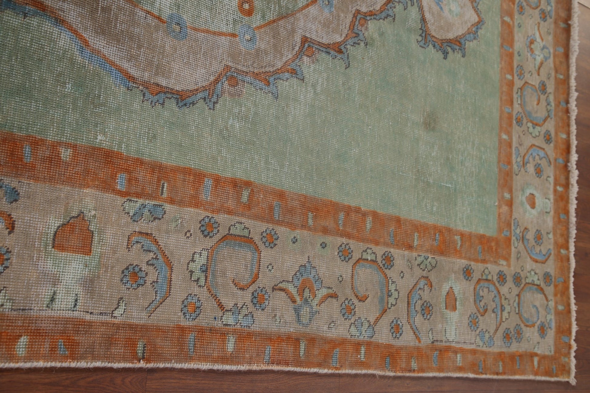 A Beautiful Genuine Persia ( Persia ) Tabriz rug is Hand Knotted by skillful weavers in Persia ( Persia ) with 100% Wool Material. This rug is in Very Good (Low Pile) condition. dimensions are 9' 0'' X 6' 4'' in foot and 274 X 193 in centimeter. the primary color is Green.