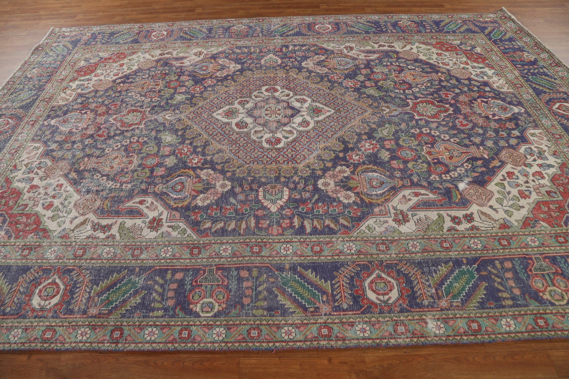 A Beautiful Genuine Persia ( Persia ) Tabriz rug is Hand Knotted by skillful weavers in Persia ( Persia ) with 100% Wool Material. This rug is in Very Good (Evenly Low Pile) condition. dimensions are 11' 9'' X 8' 1'' in foot and 358 X 246 in centimeter. the primary color is Navy Blue & Blues.