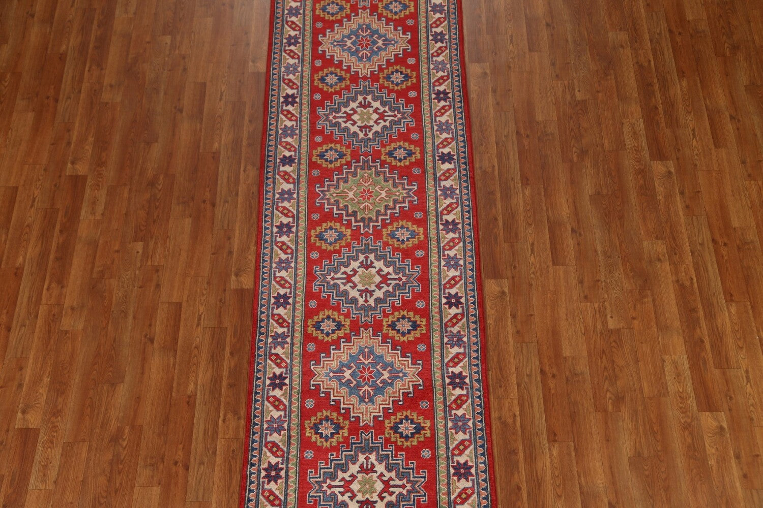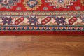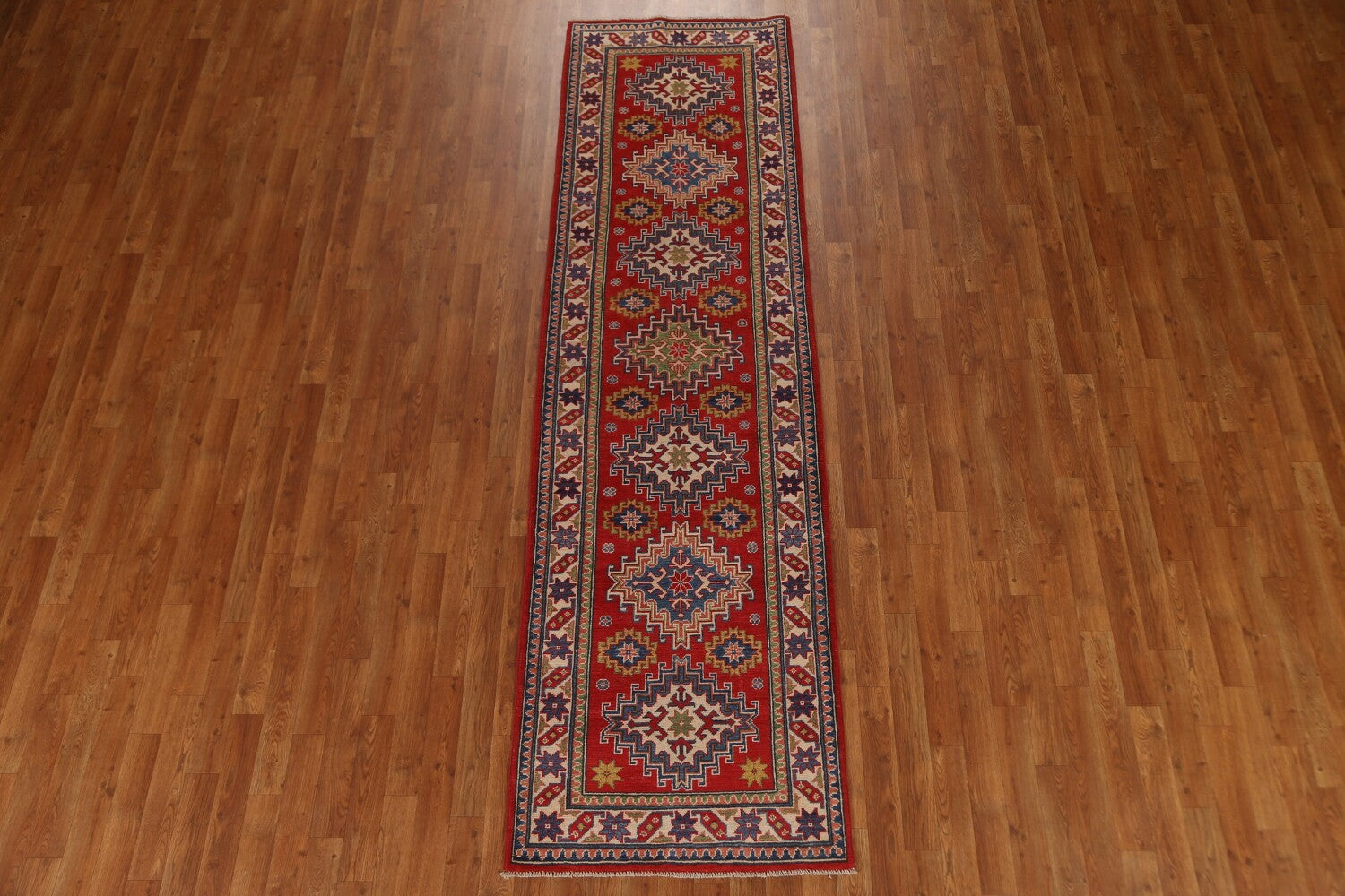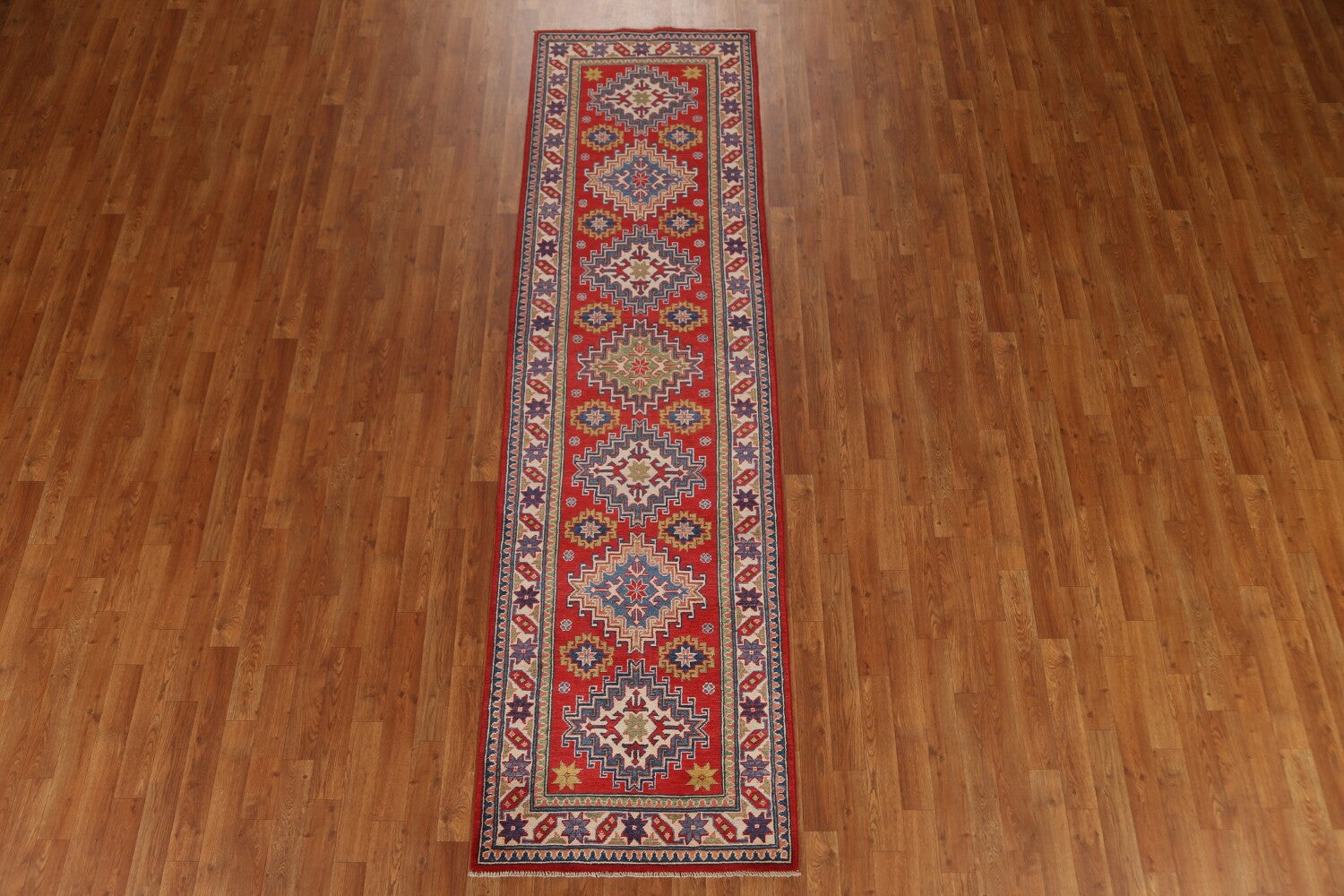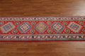 A Beautiful Genuine Pakistan Kazak rug is Hand Knotted by skillful weavers in Pakistan with 100% Wool Material. This rug is in New, First Quality condition. dimensions are 9' 8'' X 2' 8'' in foot and 295 X 81 in centimeter. the primary color is Red.