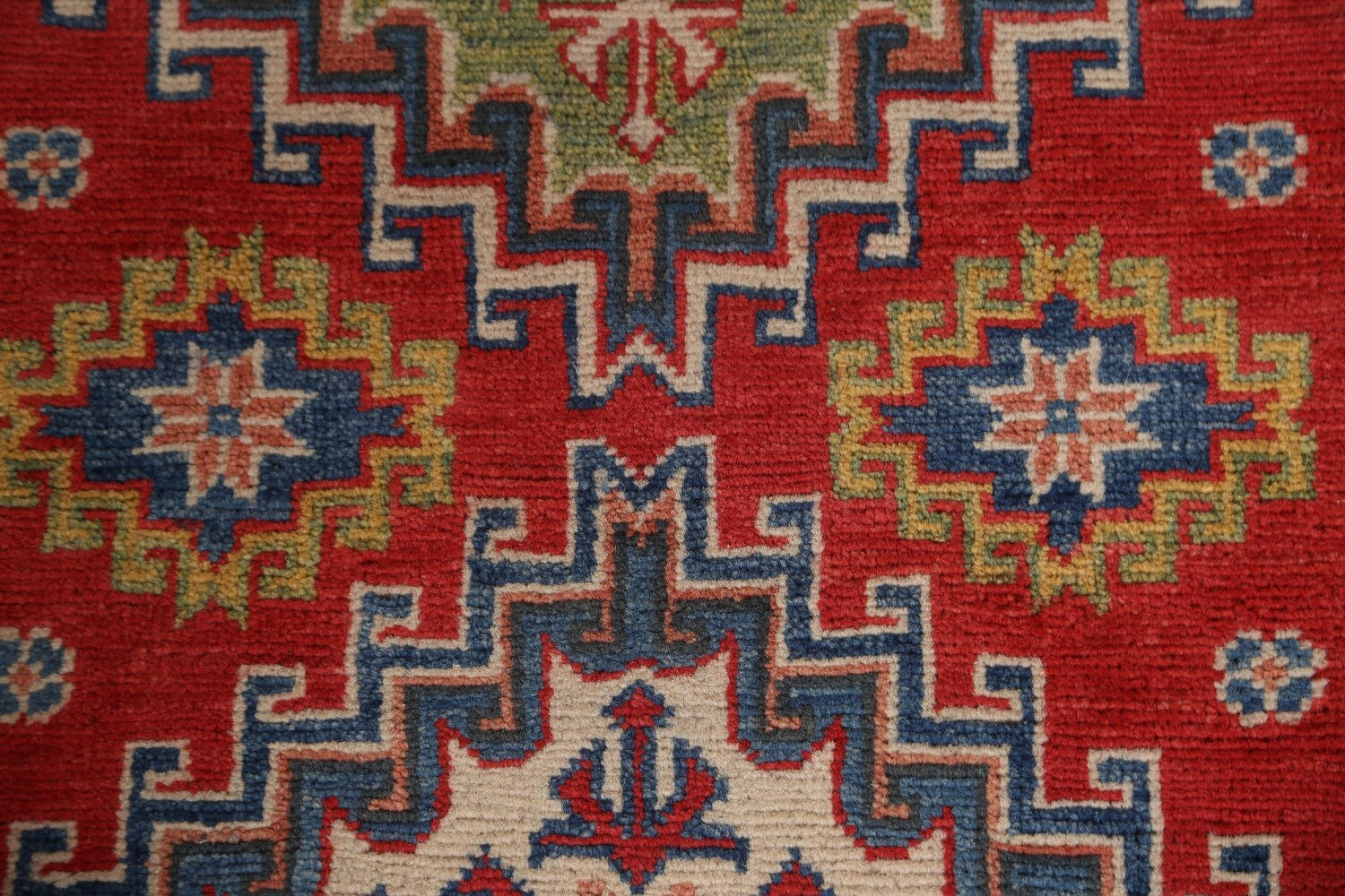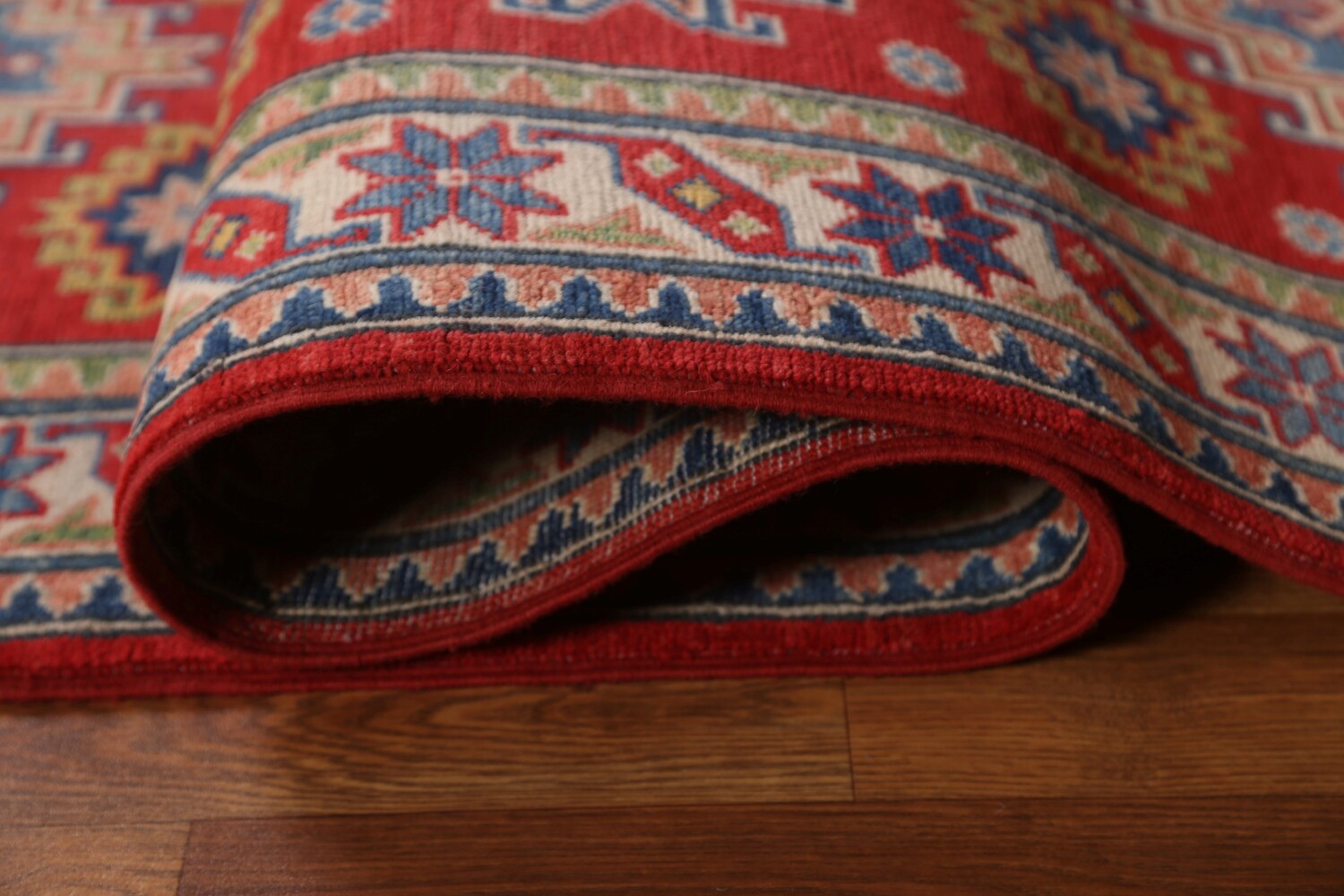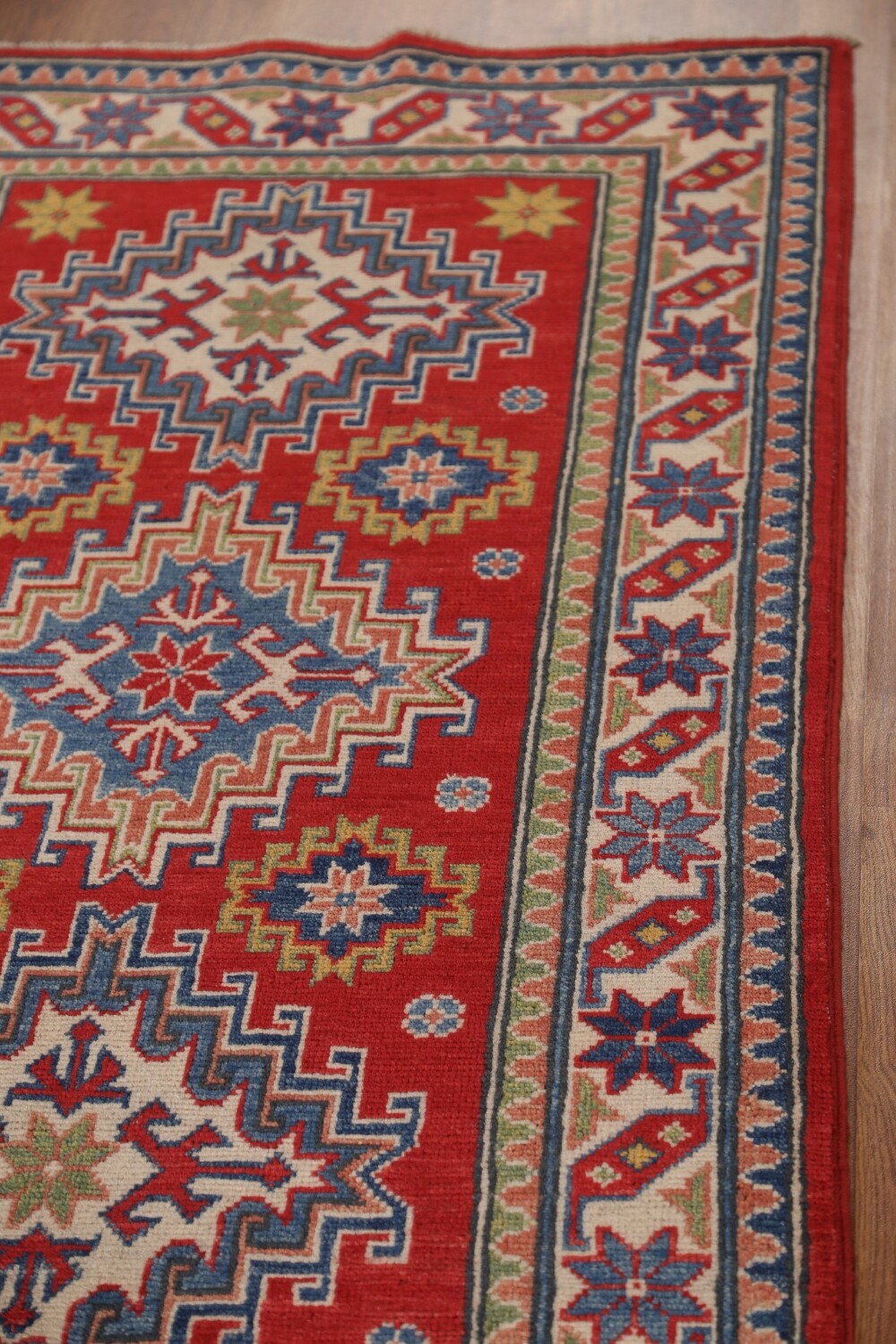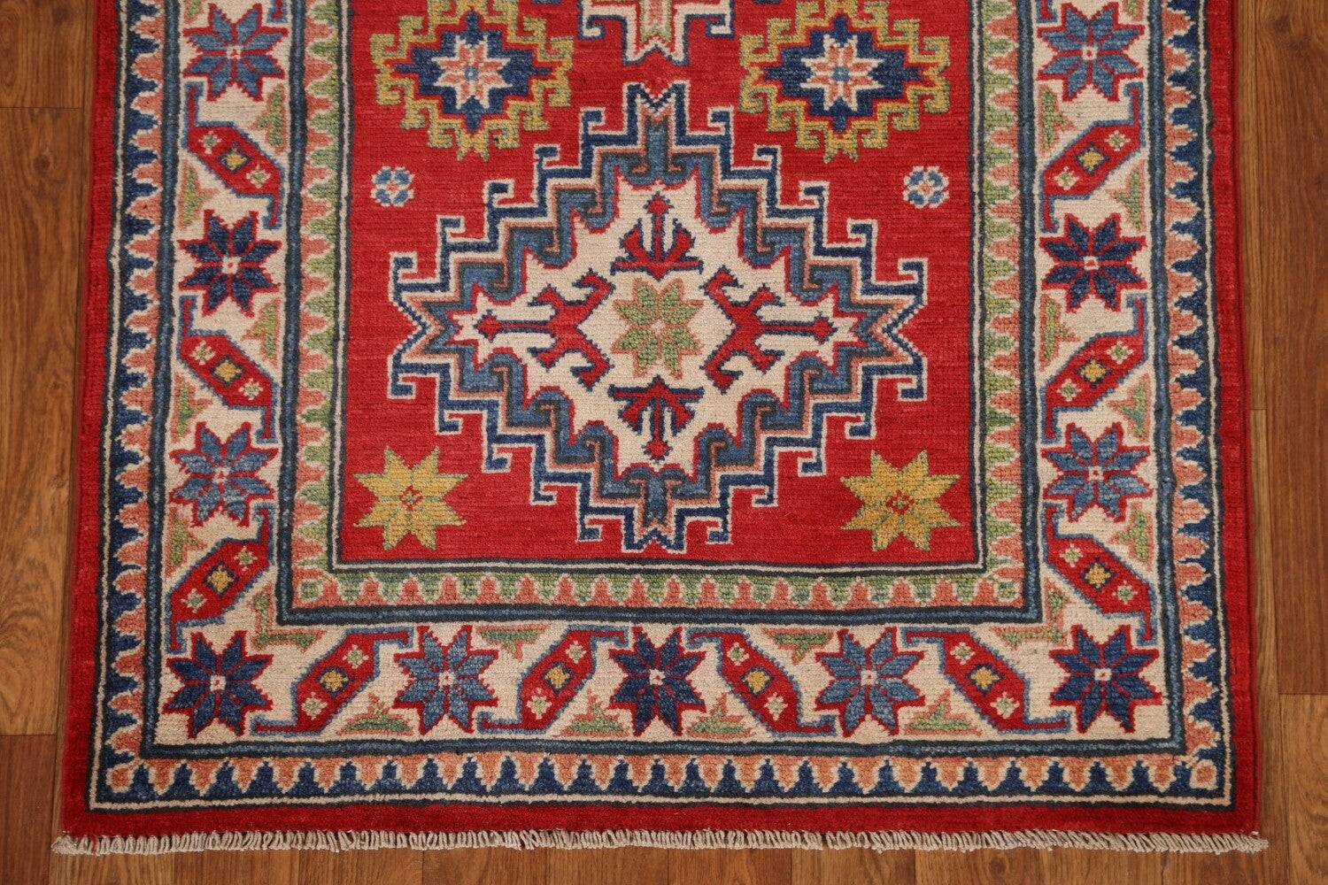 A Beautiful Genuine Pakistan Kazak rug is Hand Knotted by skillful weavers in Pakistan with 100% Wool Material. This rug is in New, First Quality condition. dimensions are 9' 8'' X 2' 8'' in foot and 295 X 81 in centimeter. the primary color is Red.