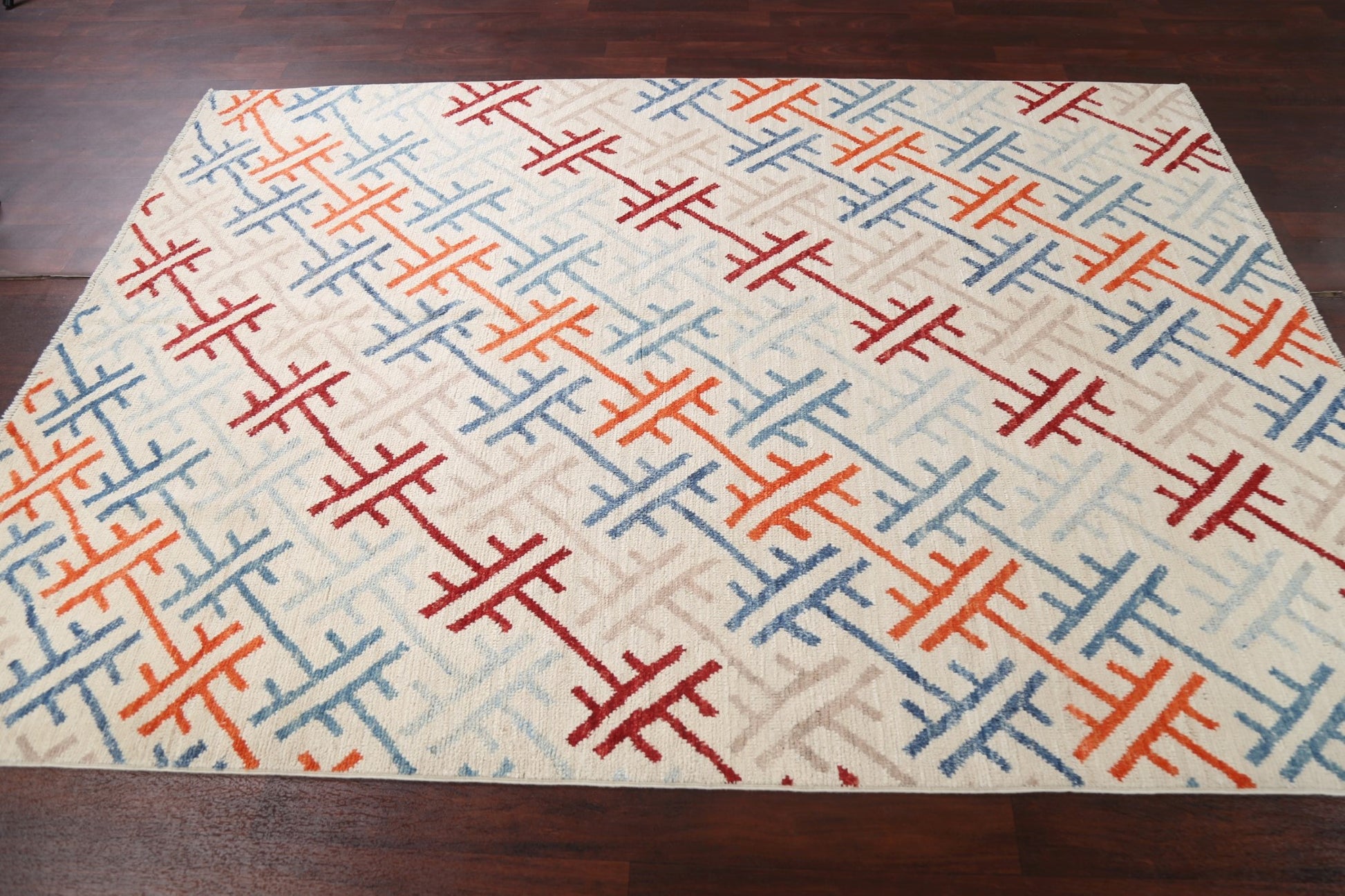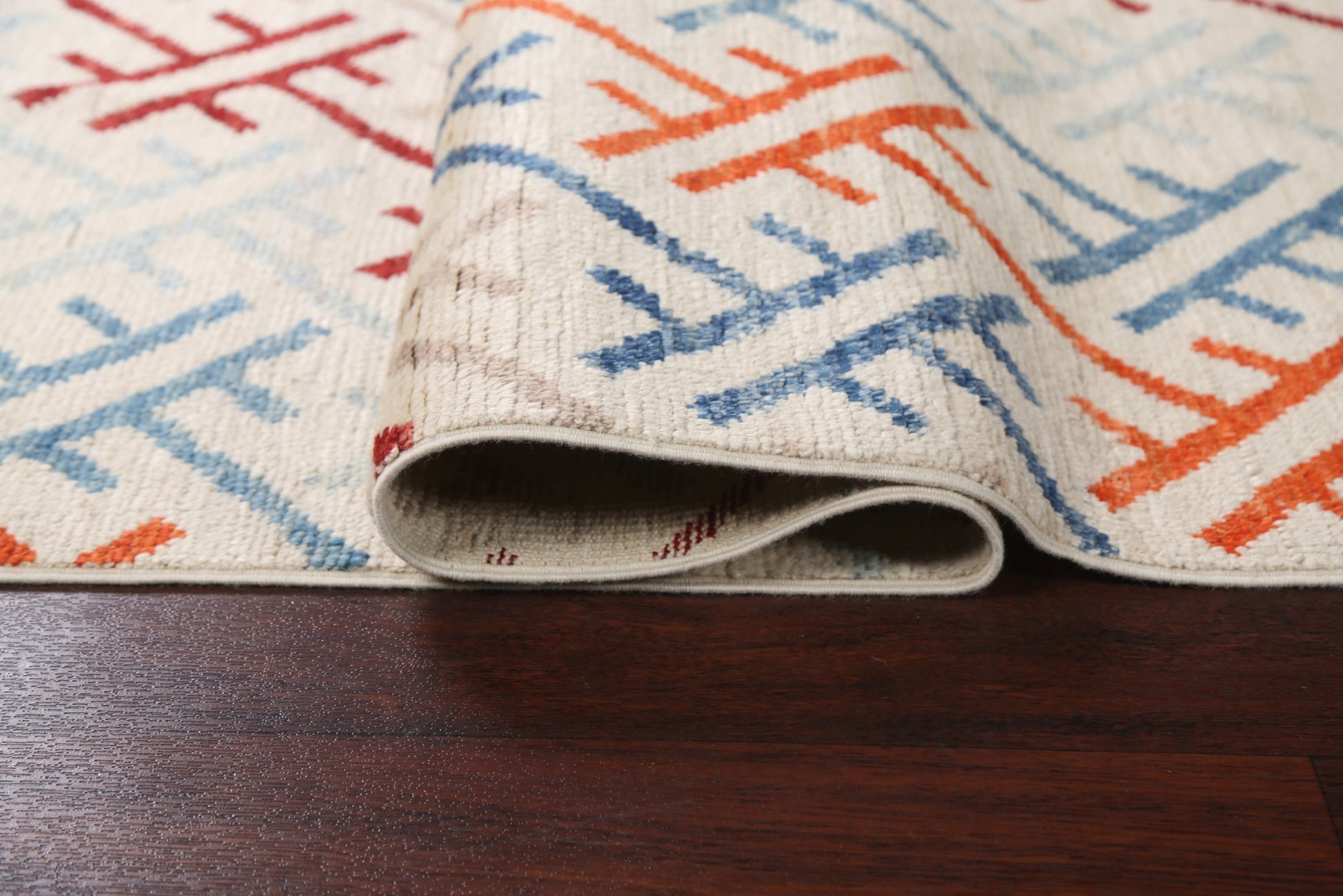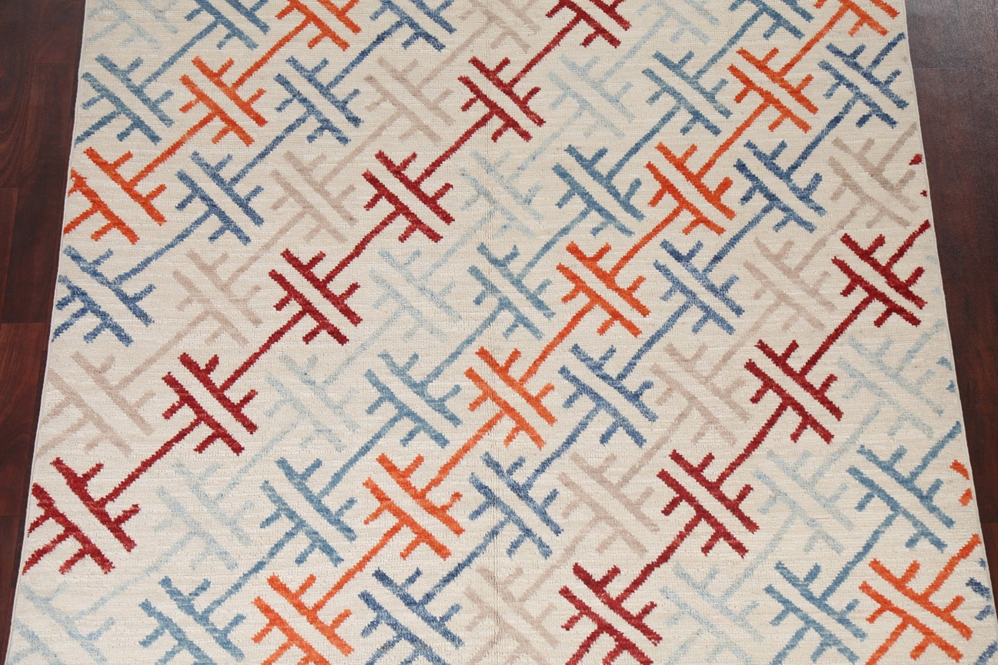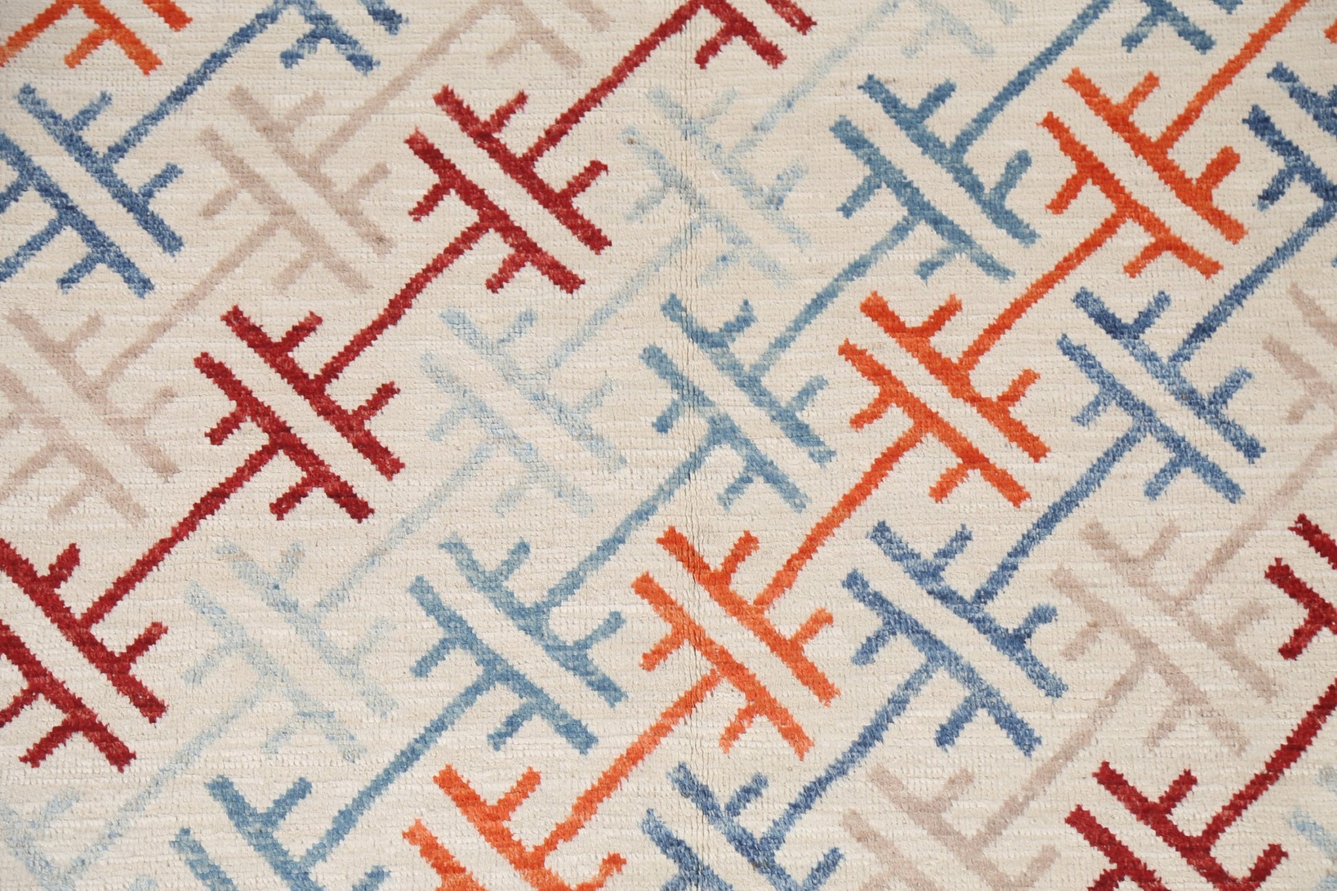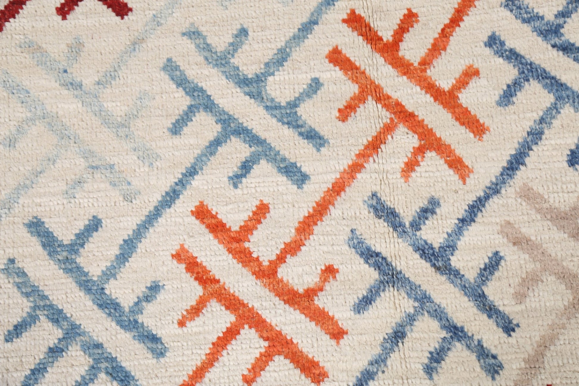 A Beautiful Genuine Pakistan Moroccan rug is Hand Knotted by skillful weavers in Pakistan with 100% Wool Material. This rug is in New, First Quality condition. dimensions are 7' 11'' X 5' 8'' in foot and 241 X 173 in centimeter. the primary color is Beige & Ivories.