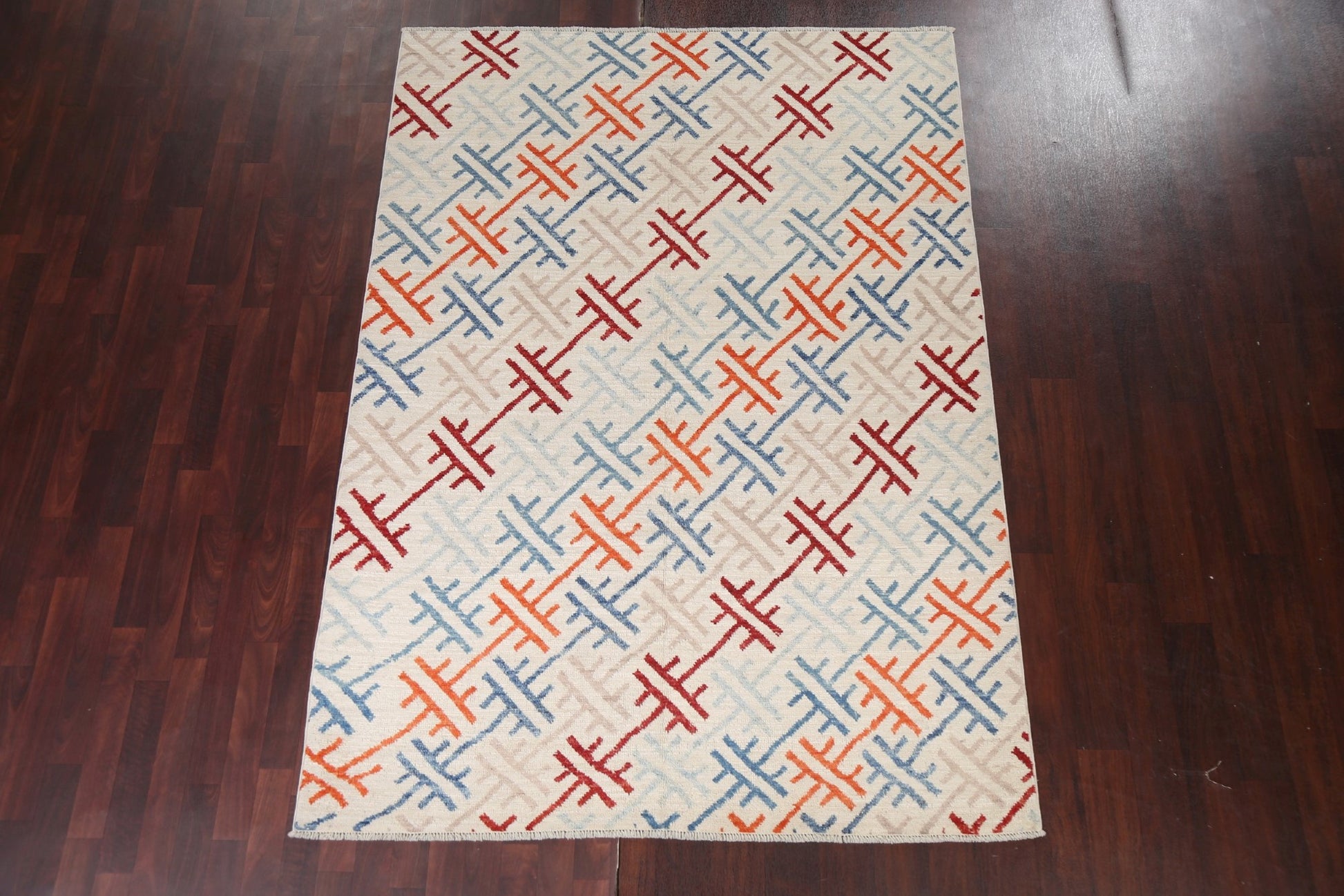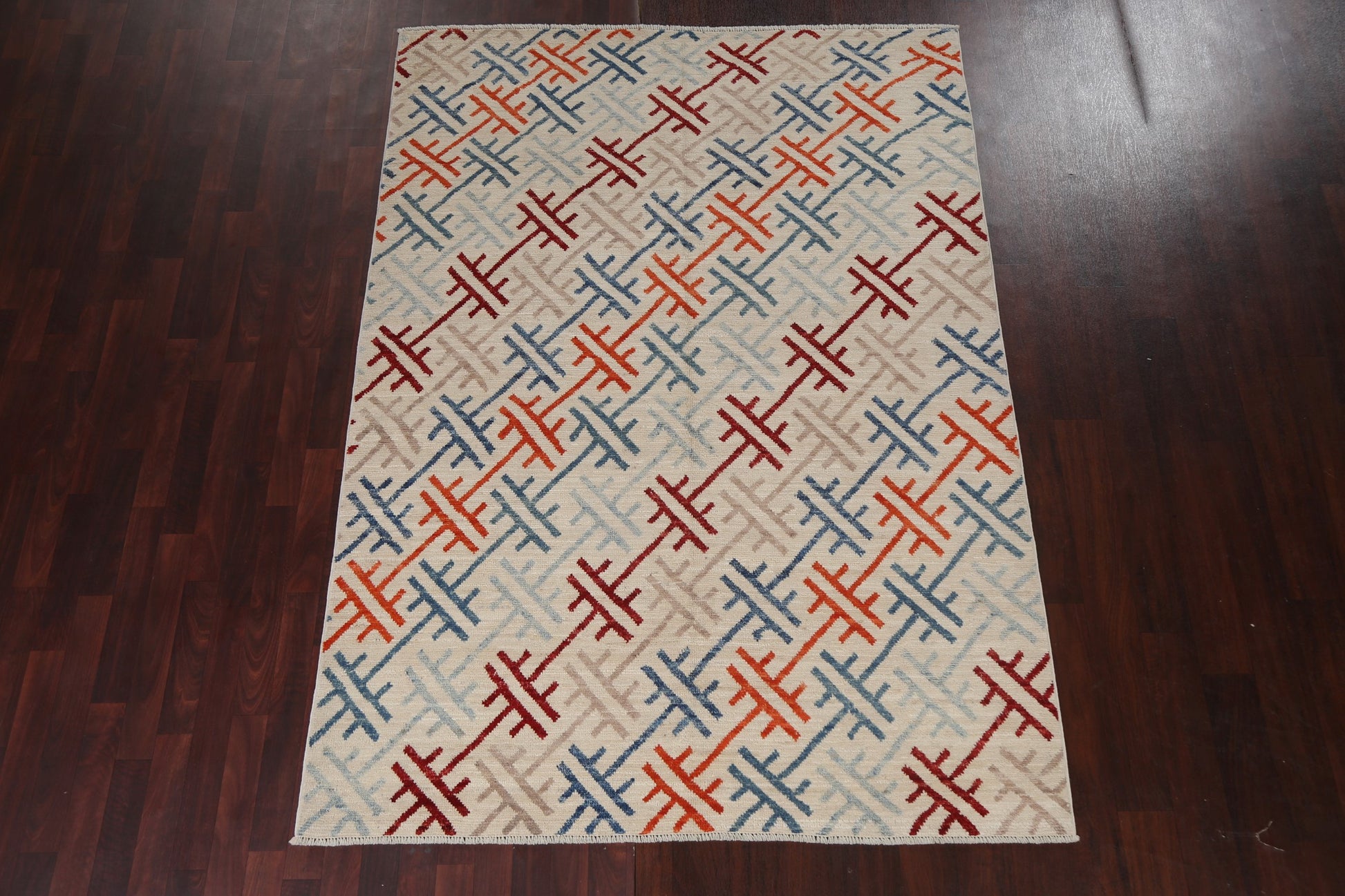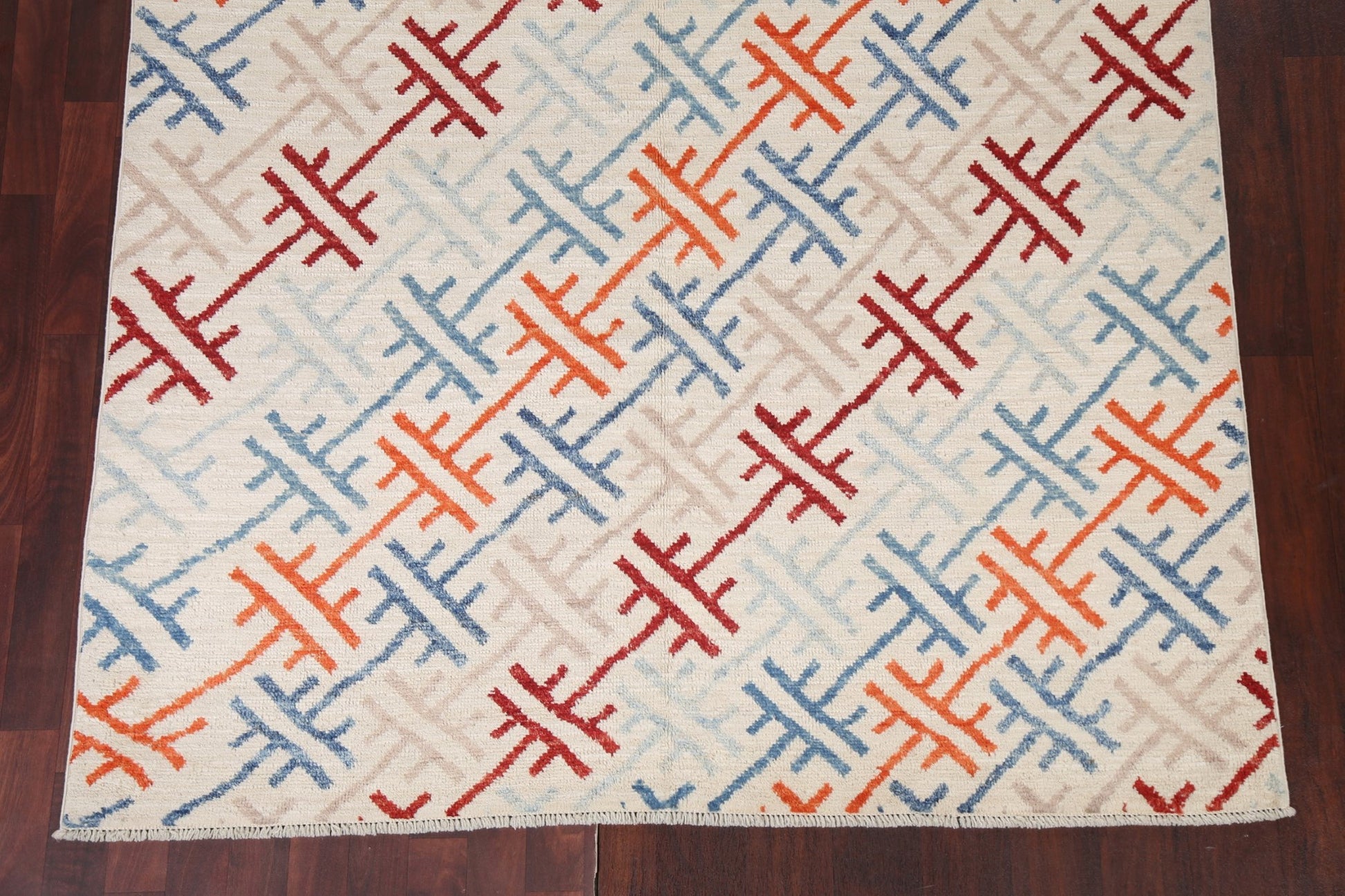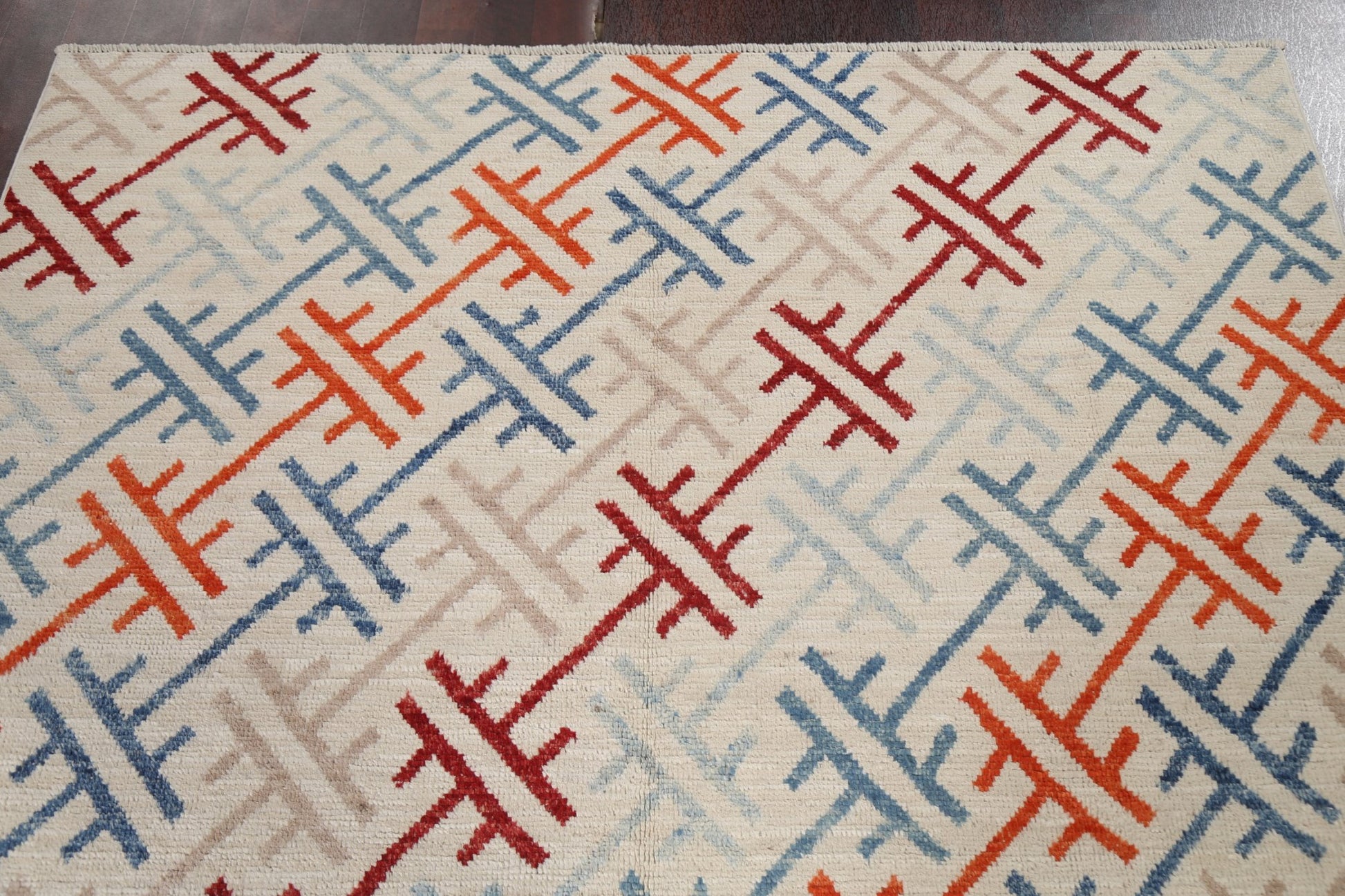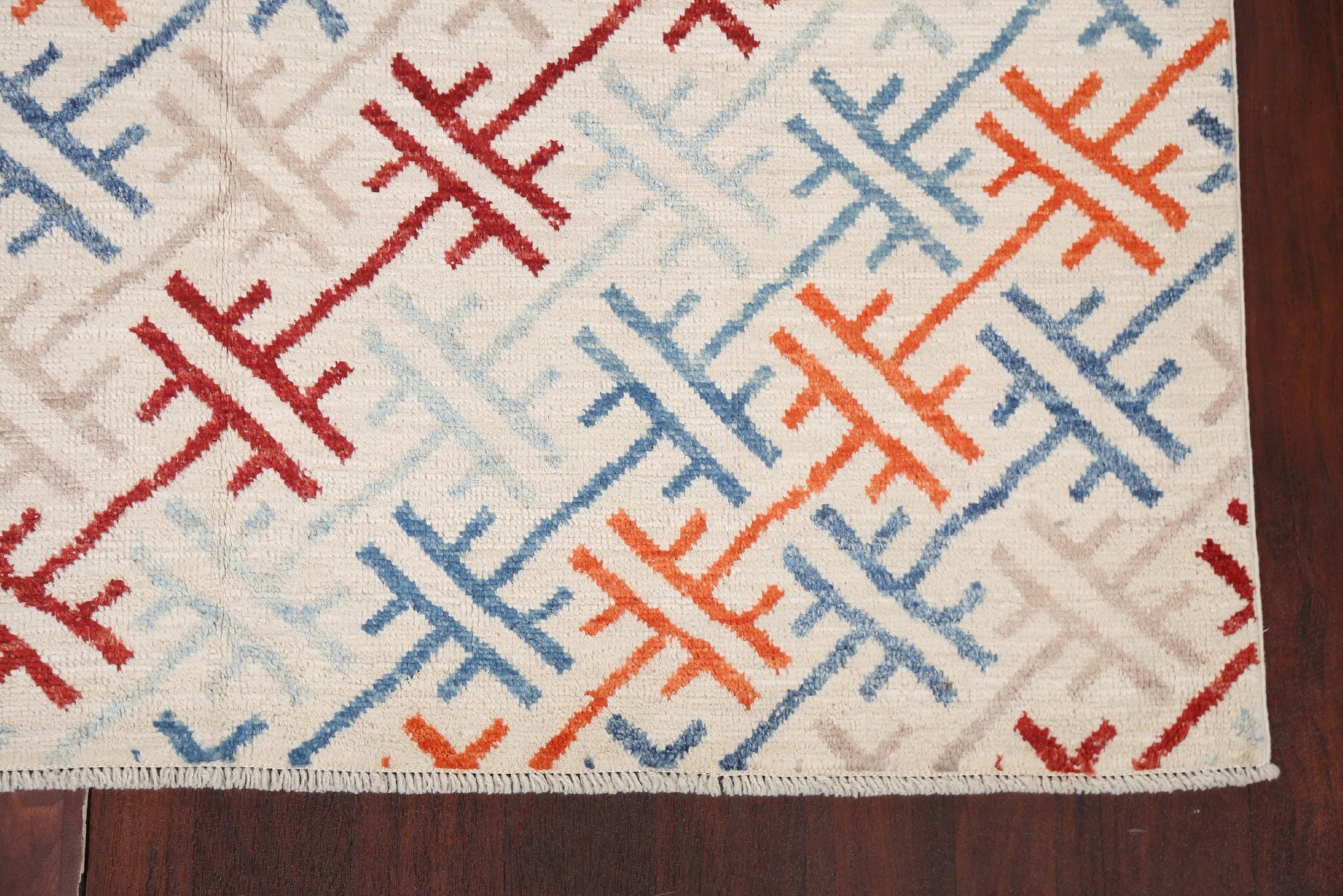 A Beautiful Genuine Pakistan Moroccan rug is Hand Knotted by skillful weavers in Pakistan with 100% Wool Material. This rug is in New, First Quality condition. dimensions are 7' 11'' X 5' 8'' in foot and 241 X 173 in centimeter. the primary color is Beige & Ivories.