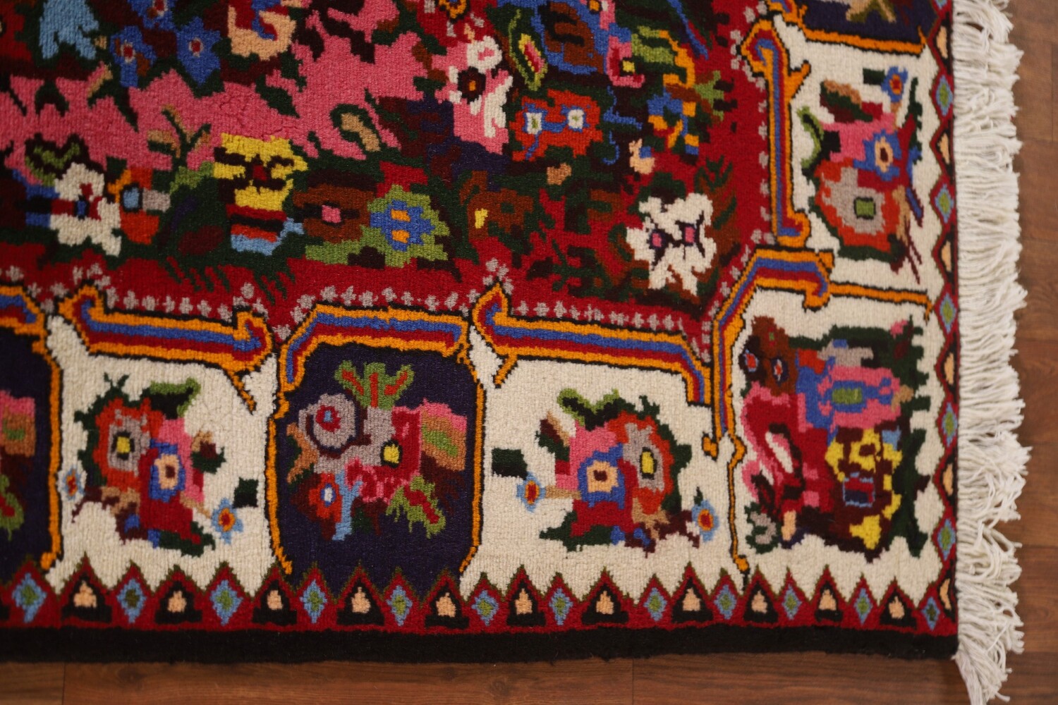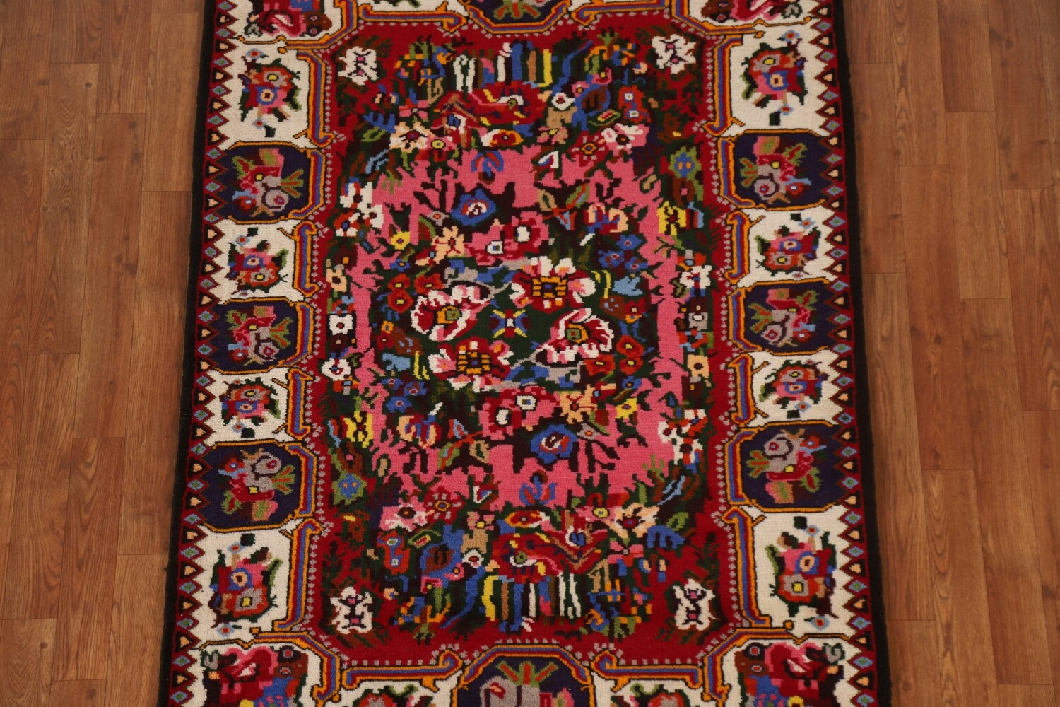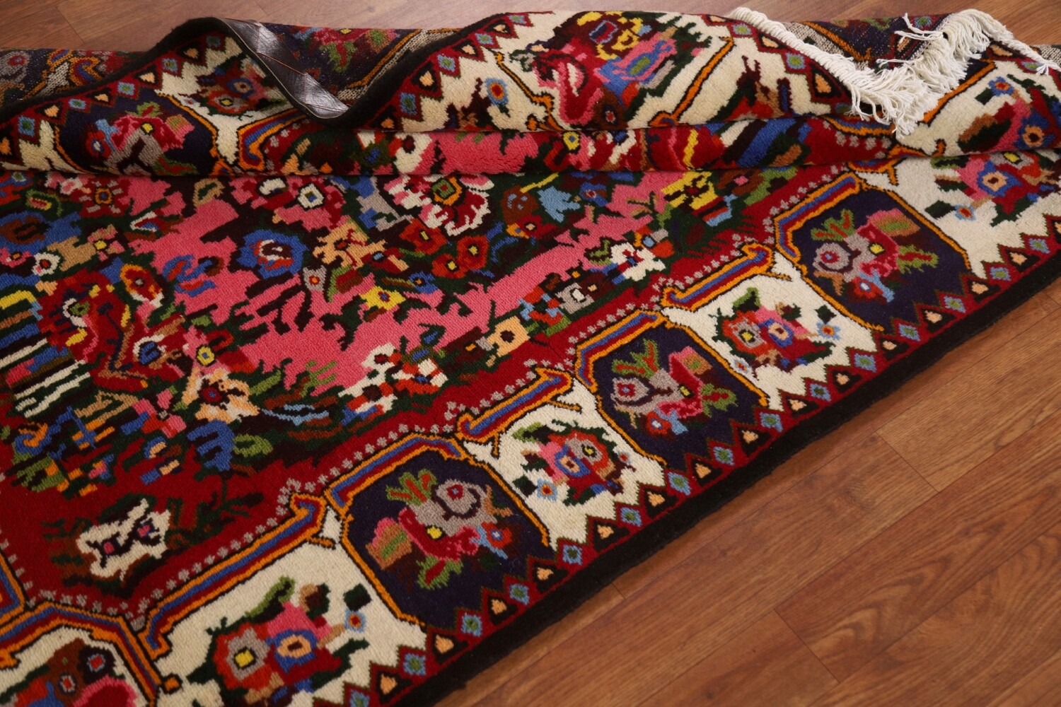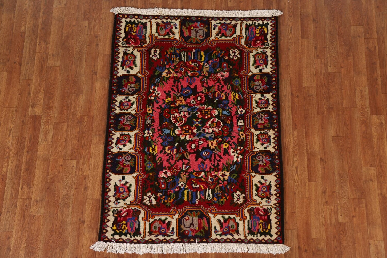 A Beautiful Genuine Persia ( Persia ) Bakhtiari rug is Hand Knotted by skillful weavers in Persia ( Persia ) with 100% Wool Material. This rug is in New, First Quality condition. dimensions are 5' 1'' X 3' 8'' in foot and 155 X 112 in centimeter. the primary color is Pink.