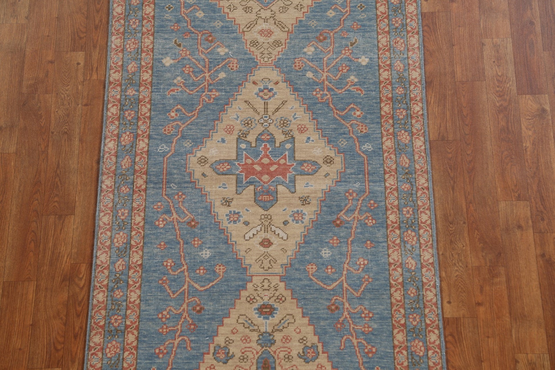 A Beautiful Genuine Turkey Heriz (serapi) rug is Hand Knotted by skillful weavers in Turkey with 100% Wool Material. This rug is in New, First Quality condition. dimensions are 11' 8'' X 2' 11'' in foot and 356 X 89 in centimeter. the primary color is Navy Blue & Blues.