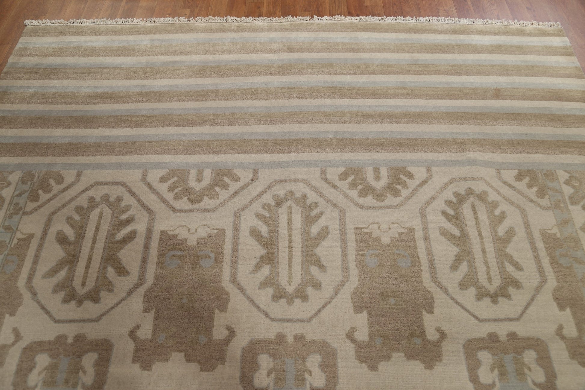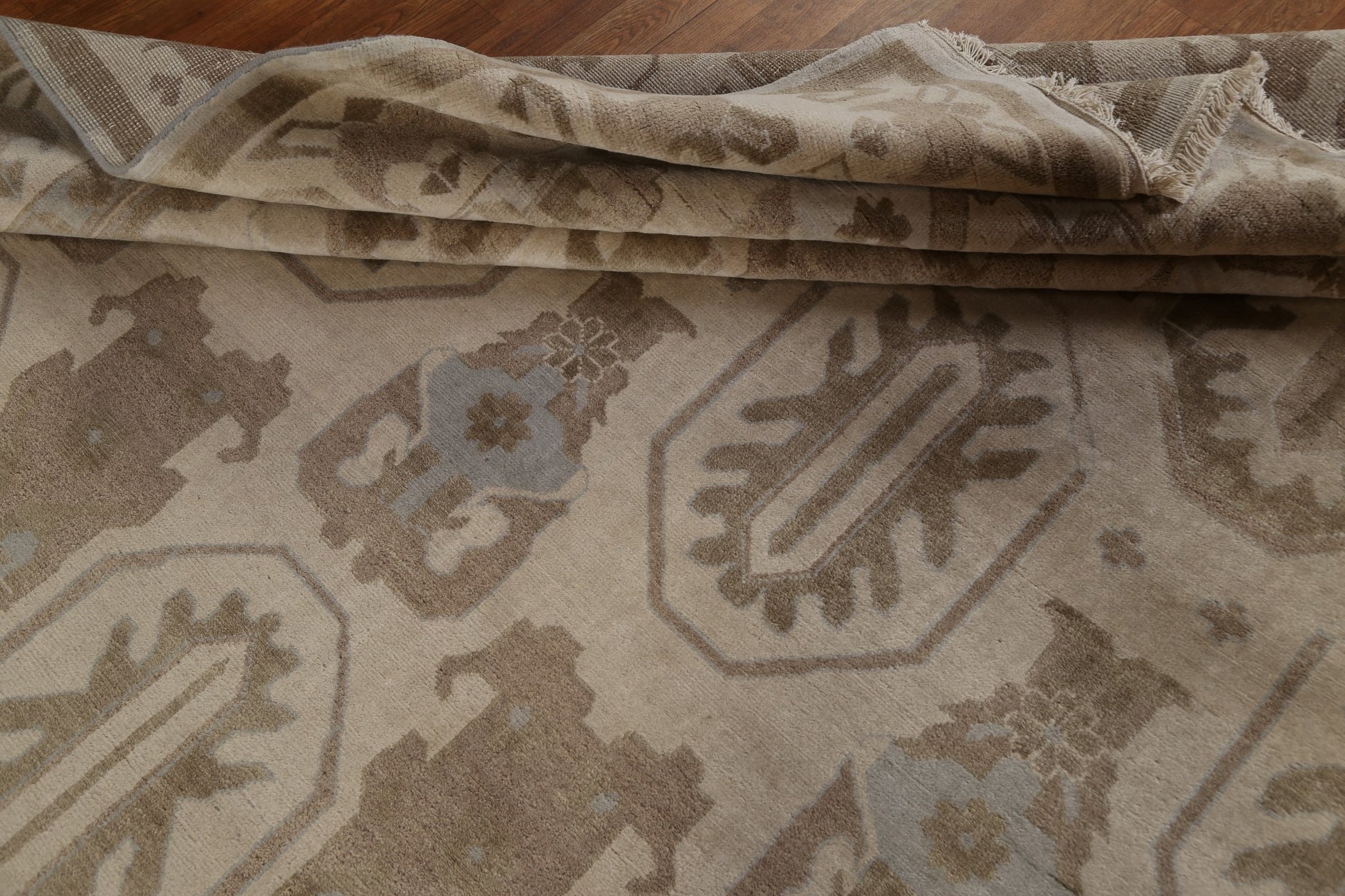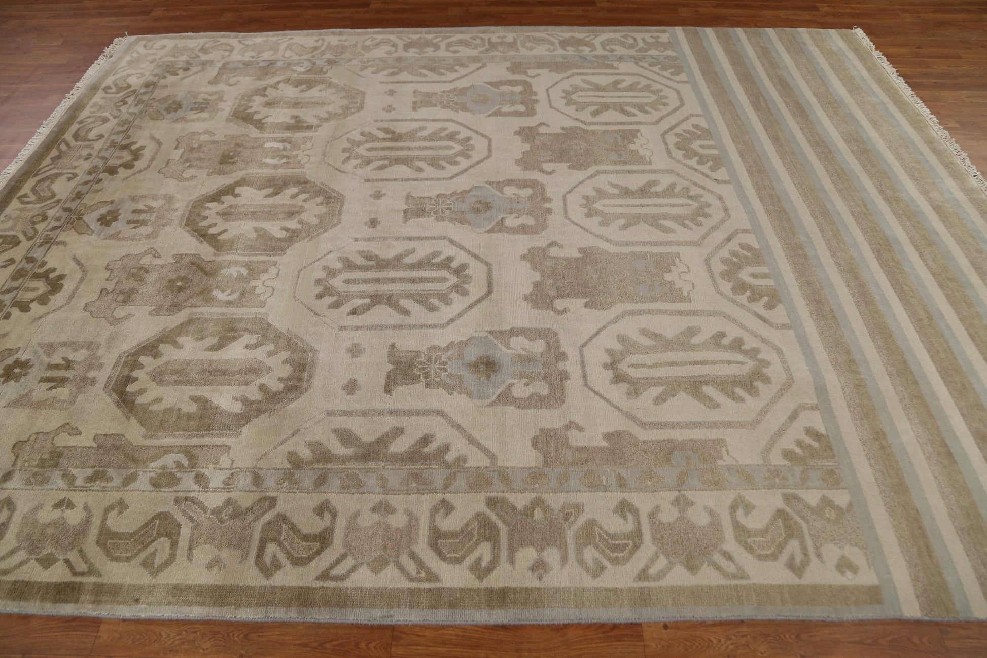 A Beautiful Genuine India Oushak rug is Hand Knotted by skillful weavers in India with 100% Wool Material. This rug is in New, First Quality condition. dimensions are 10' 3'' X 7' 9'' in foot and 312 X 236 in centimeter. the primary color is Beige & Ivories.