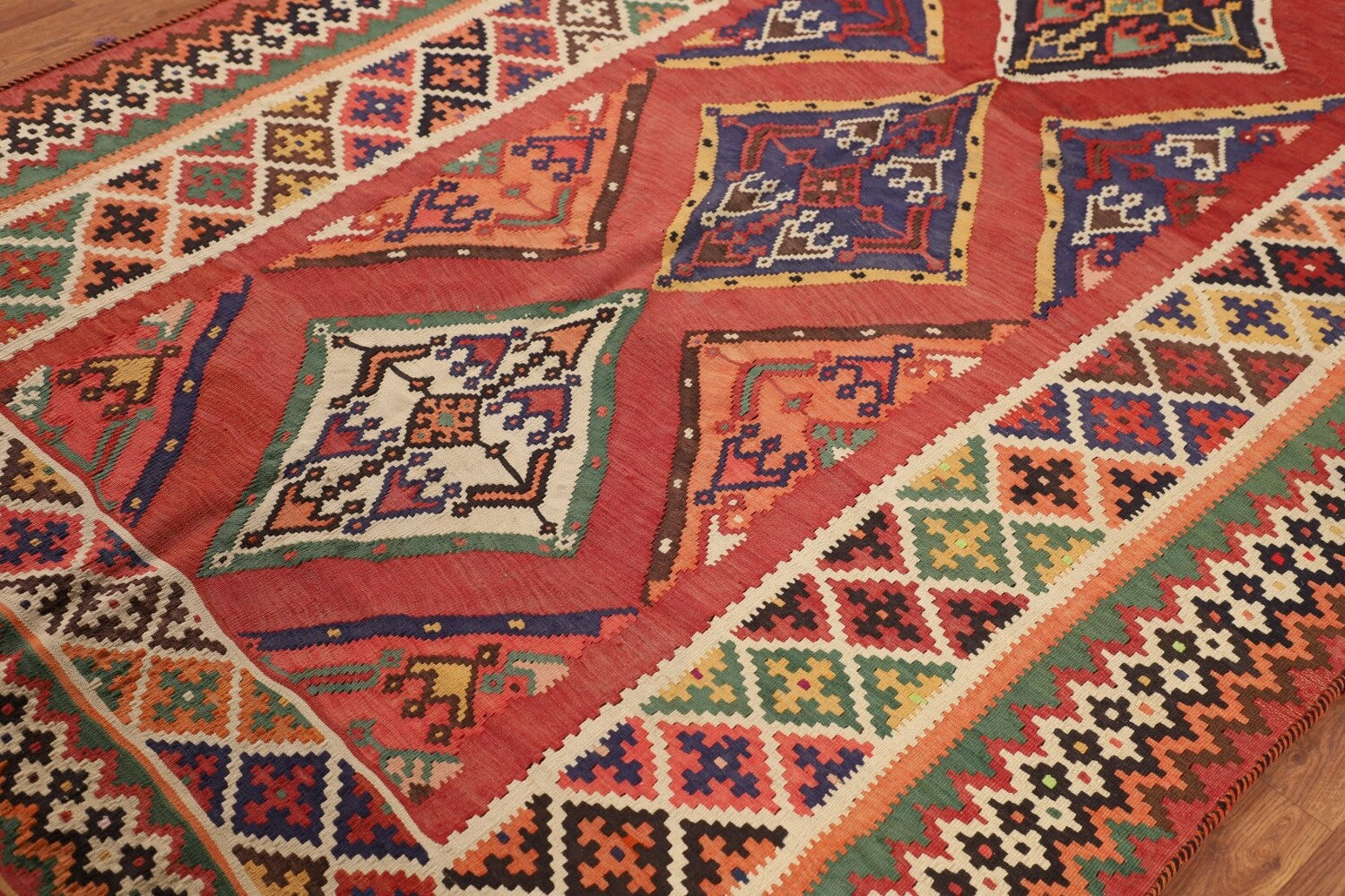 A Beautiful Genuine Persia ( Persia ) Kilim (Qashqai) rug is Hand Woven by skillful weavers in Persia ( Persia ) with 100% Wool Material. This rug is in Very Good (Abrash) condition. dimensions are 8' 5'' X 5' 5'' in foot and 257 X 165 in centimeter. the primary color is Oranges & Rust.