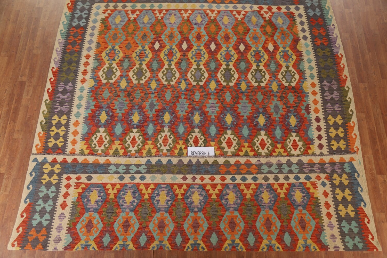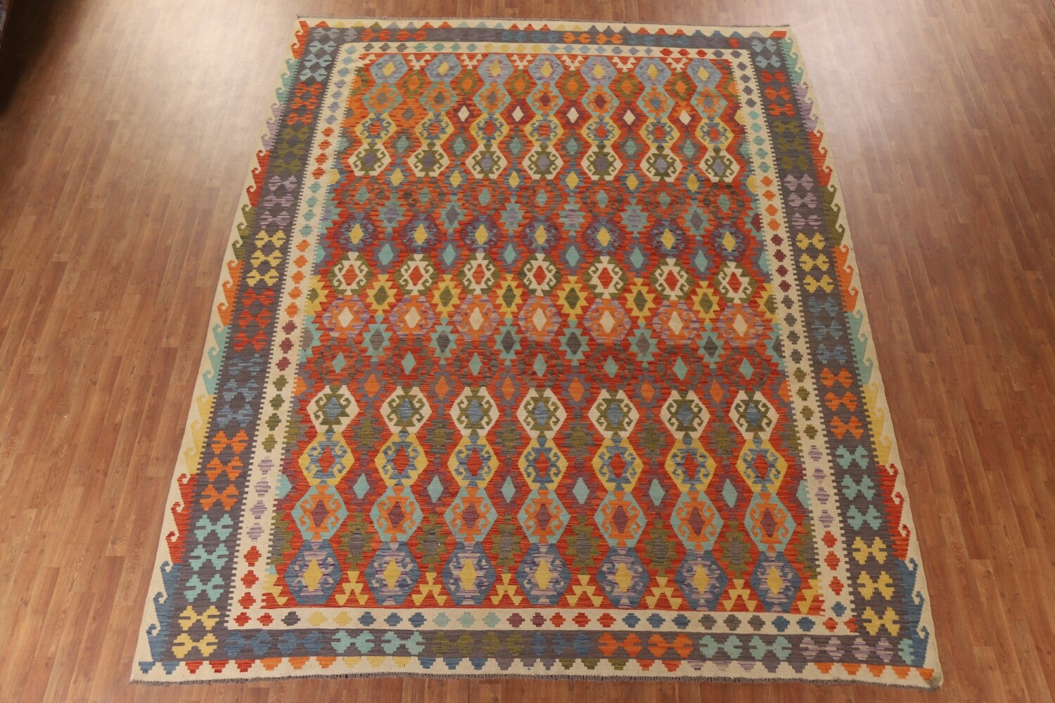 A Beautiful Genuine Pakistan Kilim rug is Hand Woven by skillful weavers in Pakistan with 100% Wool Material. This rug is in New, First Quality condition. dimensions are 12' 7'' X 10' 4'' in foot and 384 X 315 in centimeter. the primary color is Multi-Colored.