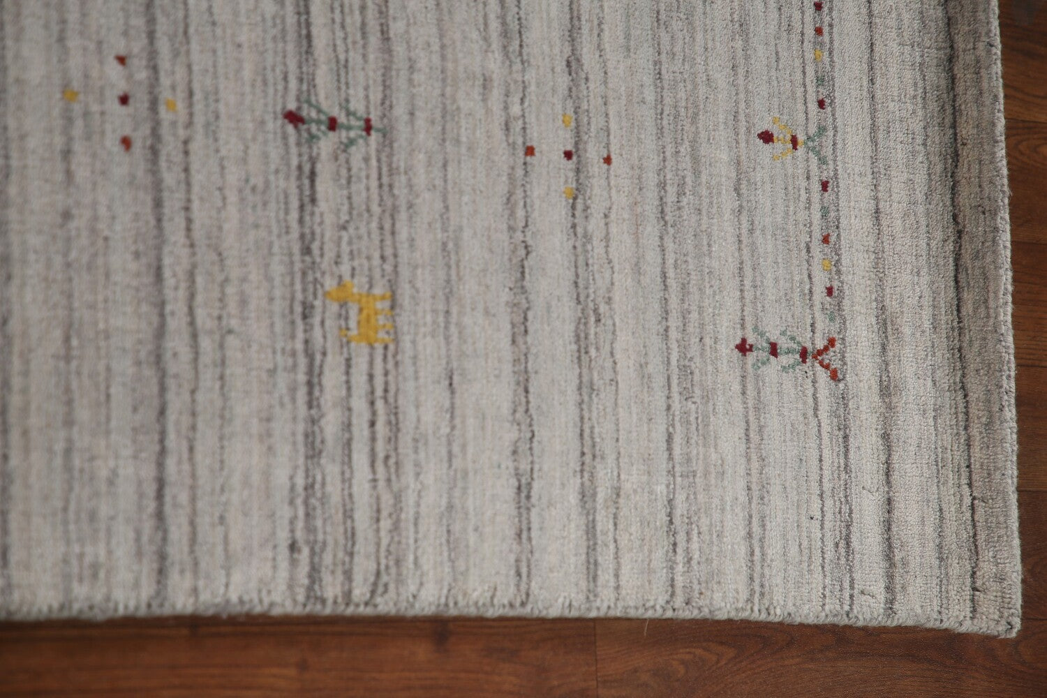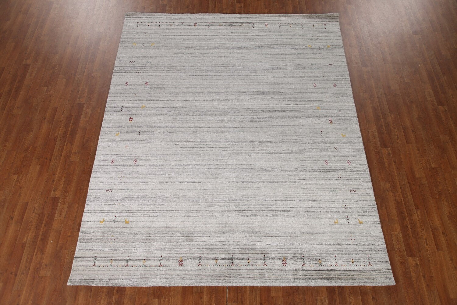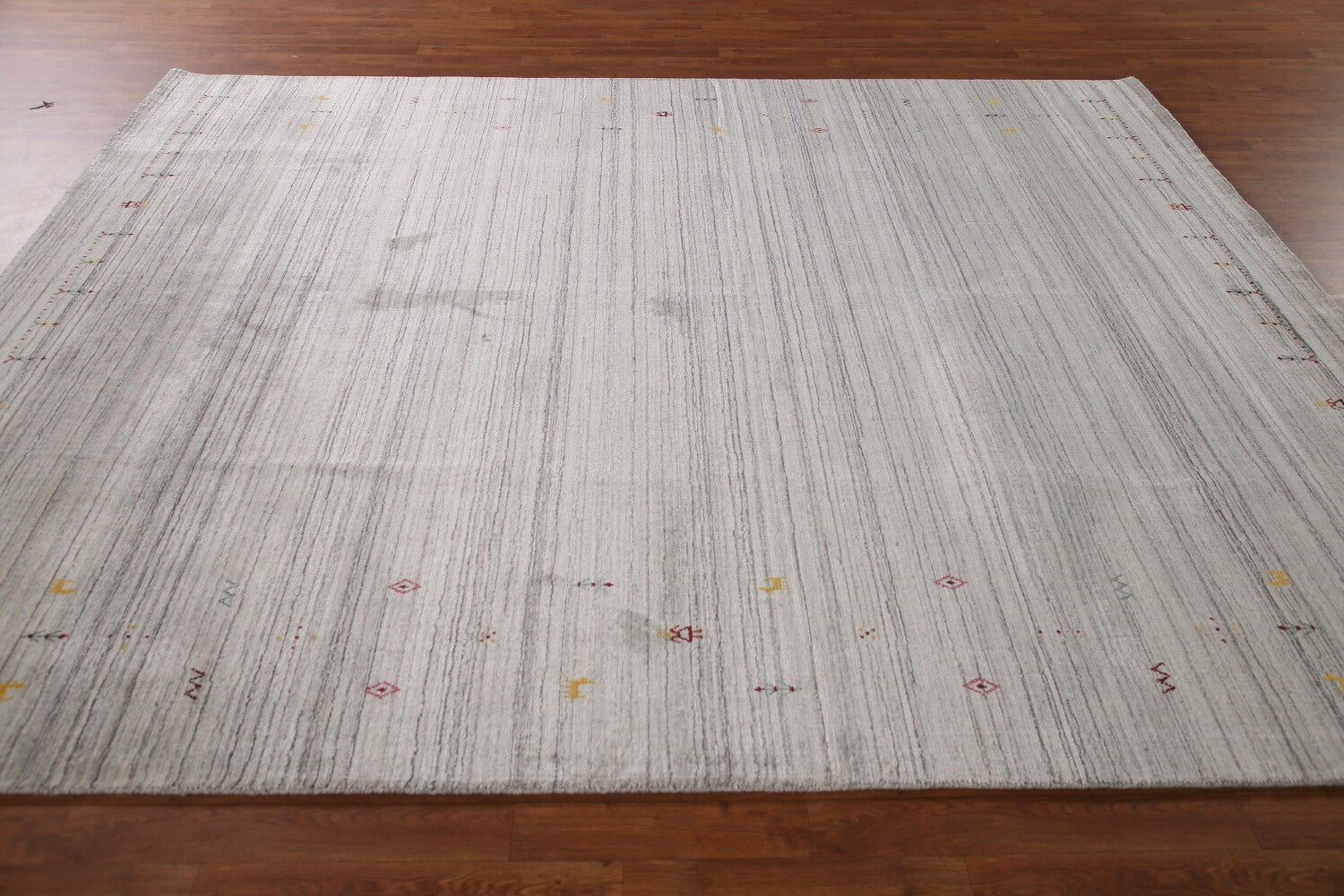 A Beautiful Genuine India Gabbeh rug is Hand Knotted by skillful weavers in India with 100% Wool Material. This rug is in New, First Quality condition. dimensions are 9' 11'' X 8' 0'' in foot and 302 X 244 in centimeter. the primary color is Greys & Charcoal.