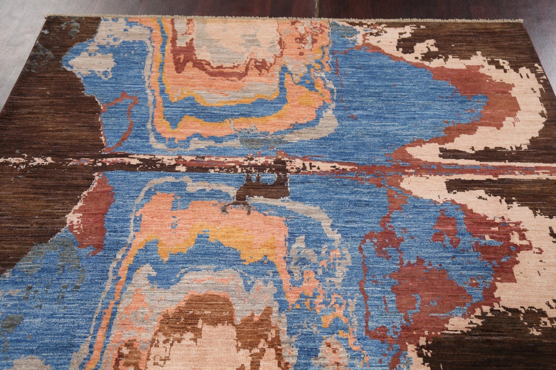 A Beautiful Genuine Pakistan Abstract rug is Hand Knotted by skillful weavers in Pakistan with 100% Wool Material. This rug is in New, First Quality condition. dimensions are 7' 11'' X 5' 10'' in foot and  241 X 178 in centimeter. the primary color is Navy Blue & Blues.