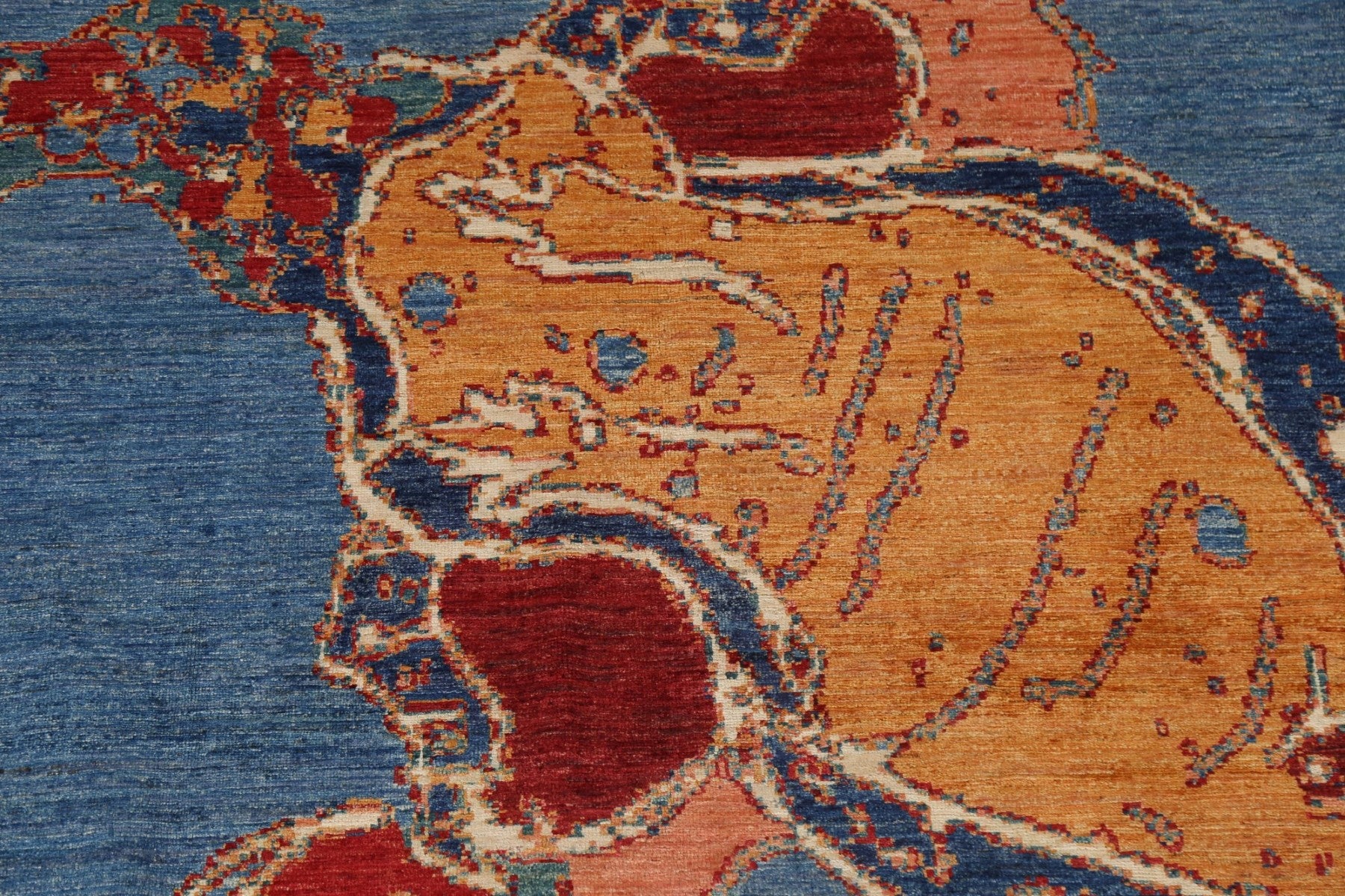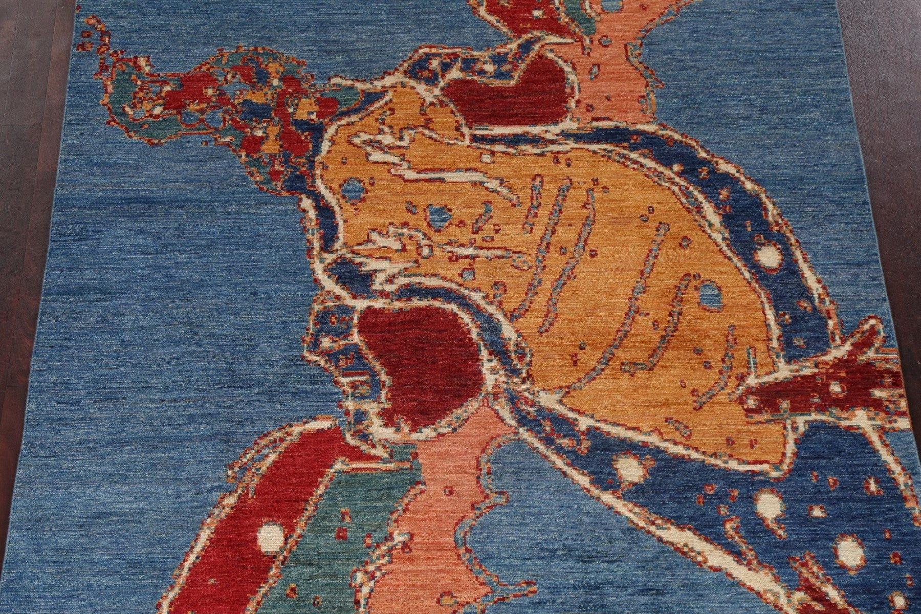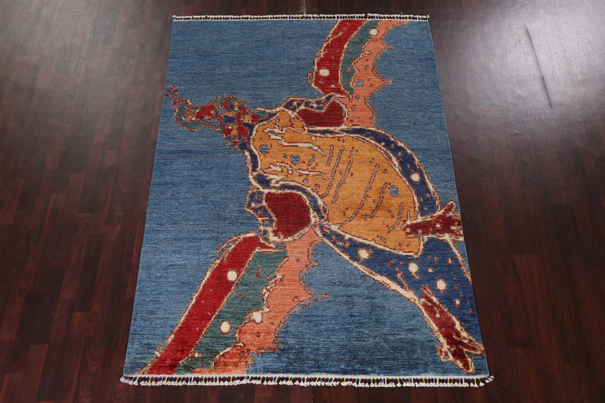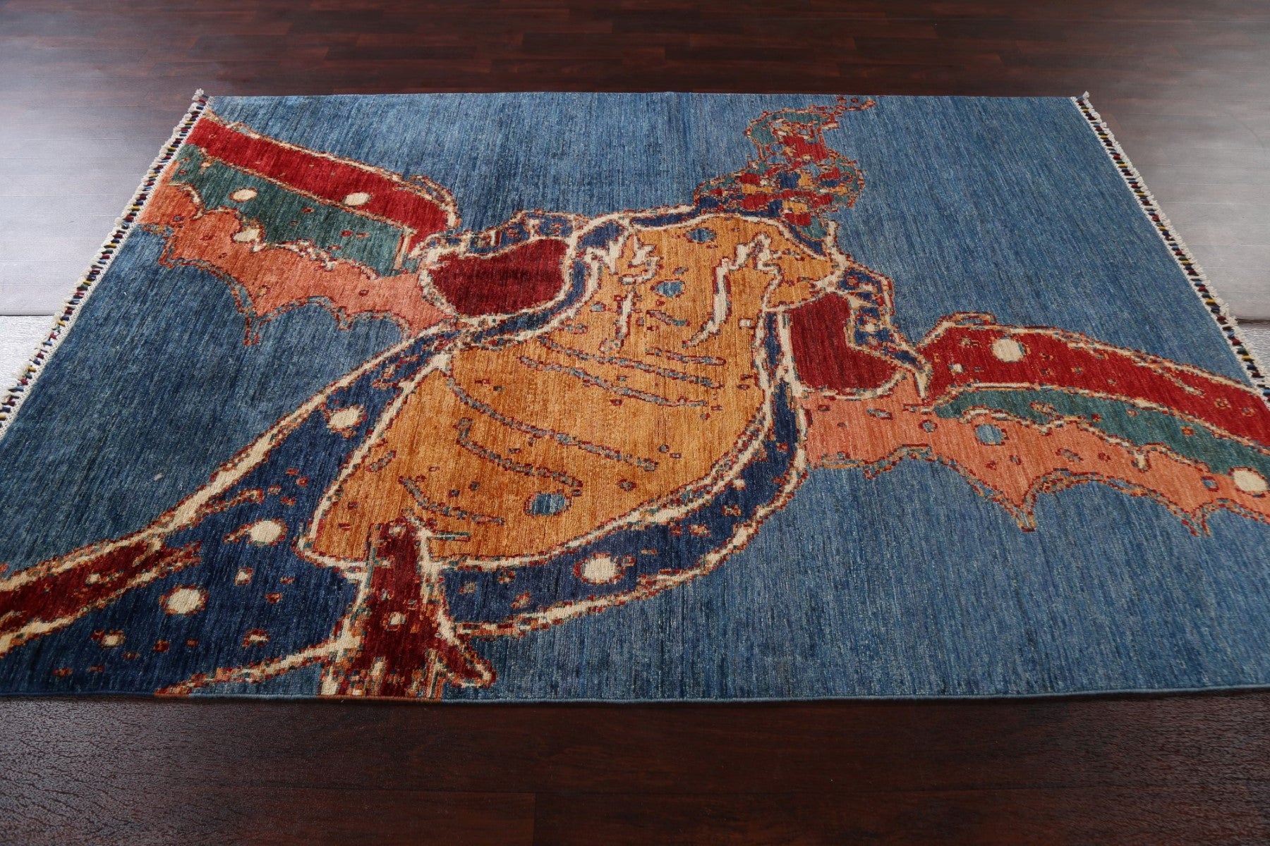 A Beautiful Genuine Pakistan Abstract rug is Hand Knotted by skillful weavers in Pakistan with 100% Wool Material. This rug is in New, First Quality condition. dimensions are 7' 10'' X 5' 7'' in foot and  239 X 170 in centimeter. the primary color is Navy Blue & Blues.