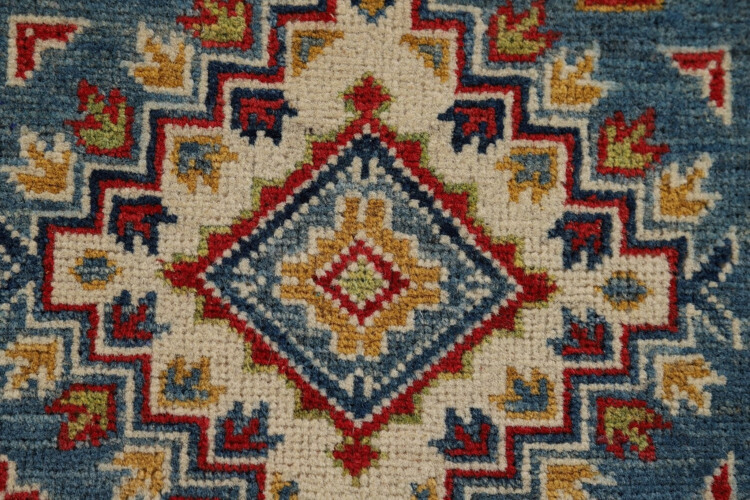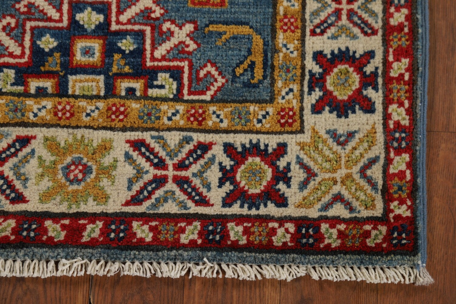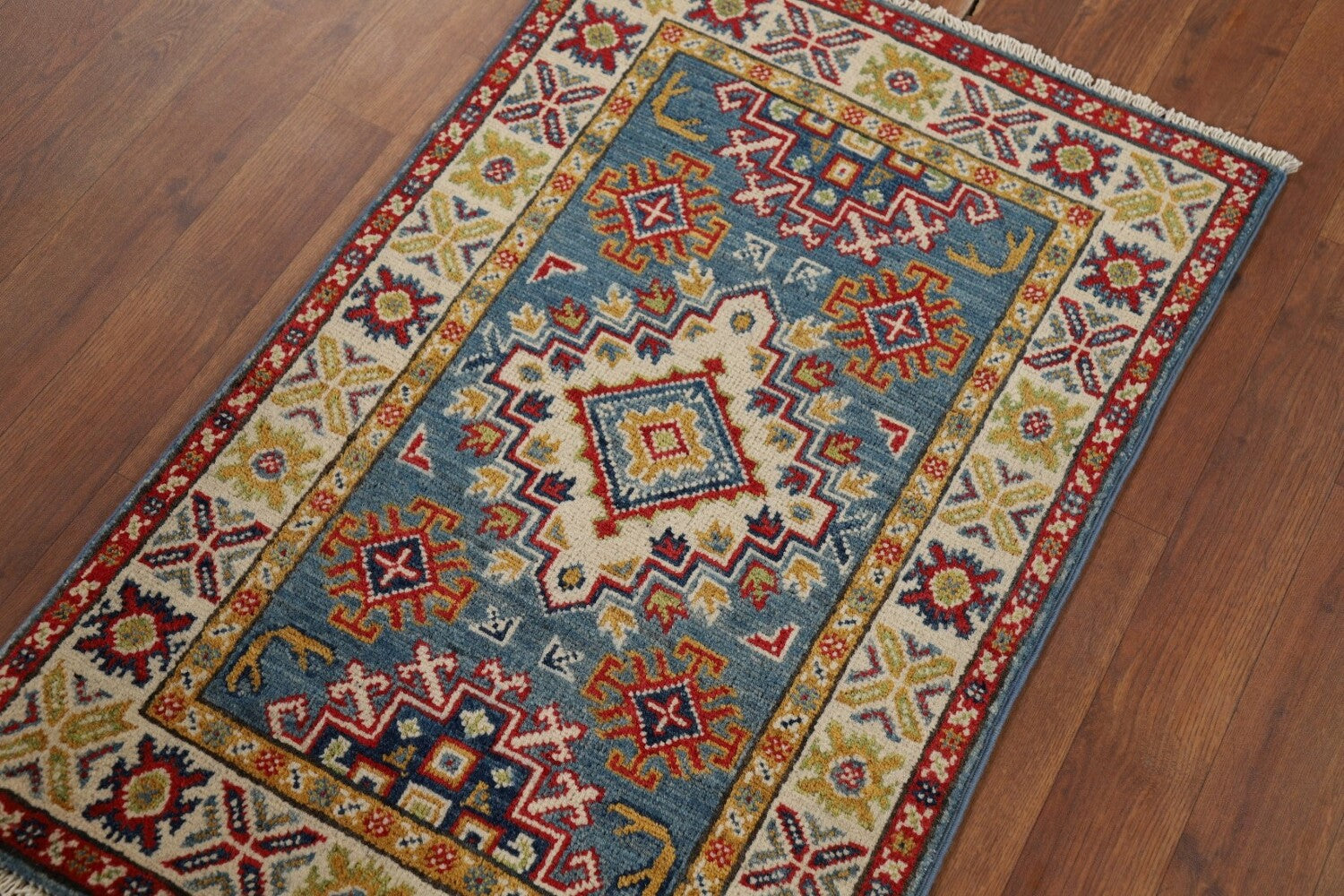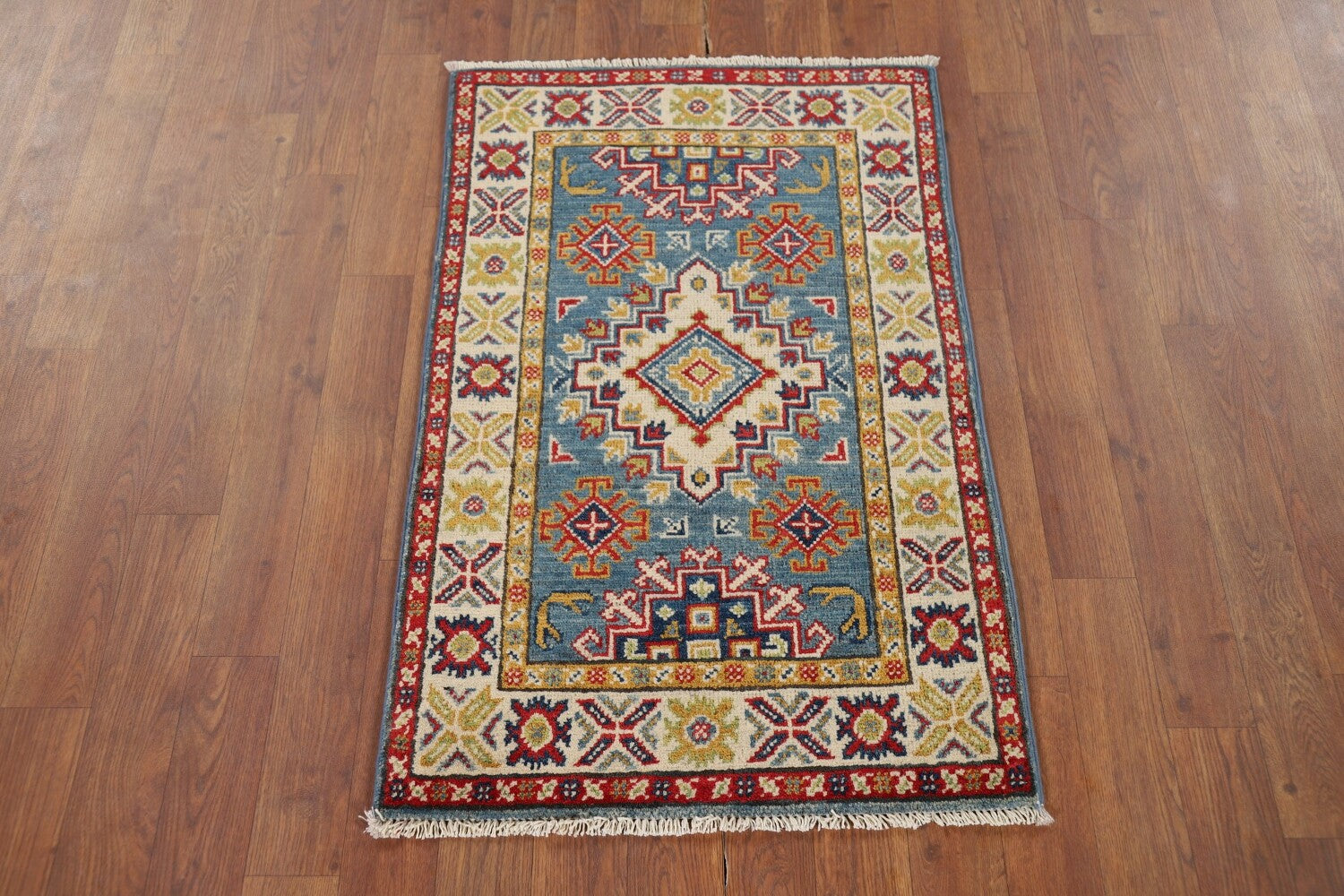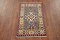 A Beautiful Genuine Pakistan Kazak rug is Hand Knotted by skillful weavers in Pakistan with 100% Wool Material. This rug is in New, First Quality condition. dimensions are 3' 0'' X 2' 0'' in foot and 91 X 61 in centimeter. the primary color is Navy Blue & Blues.