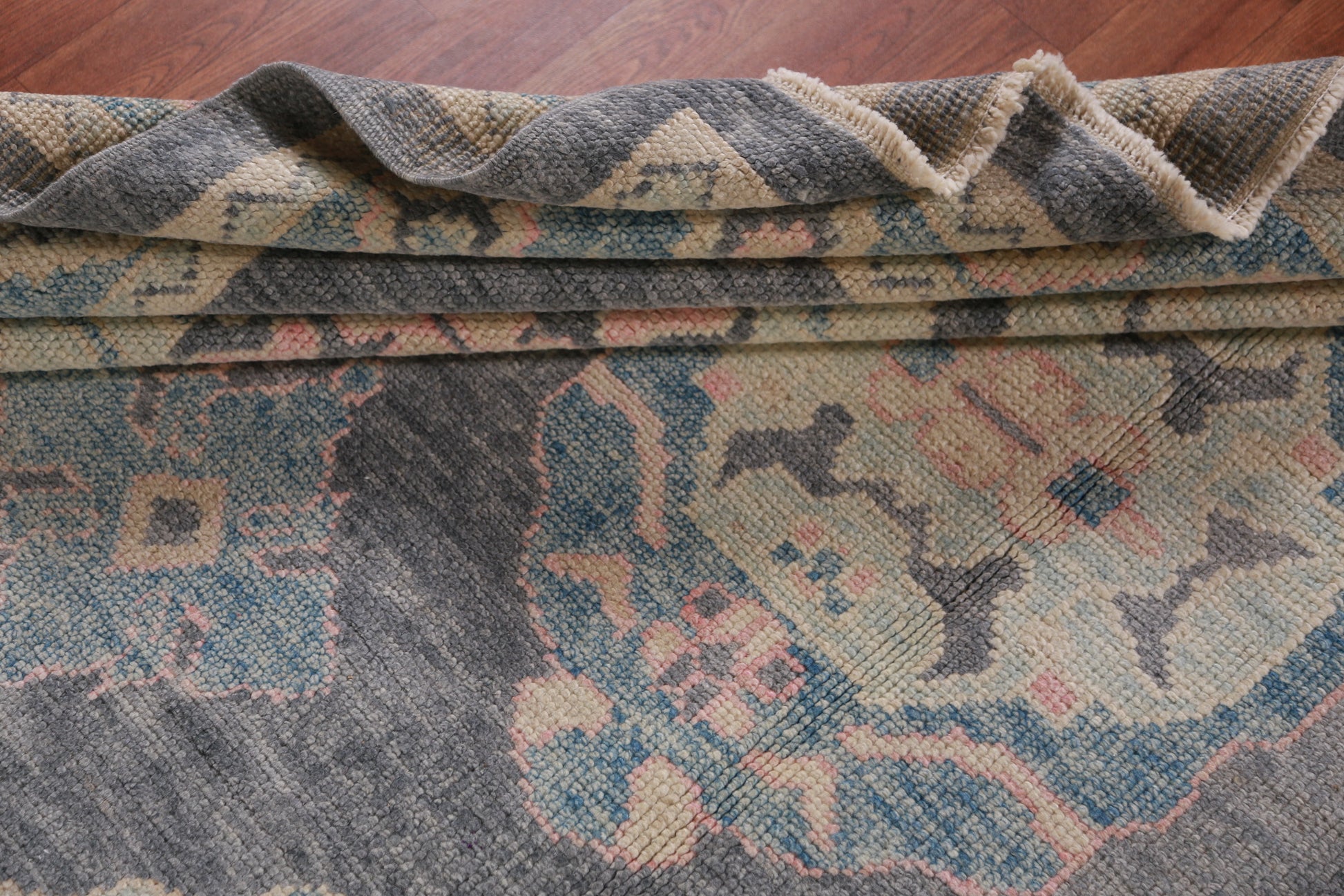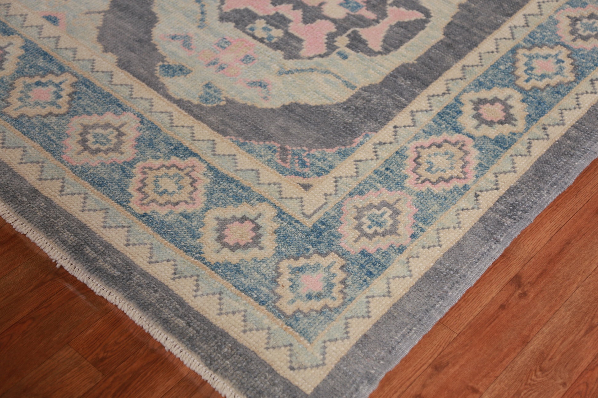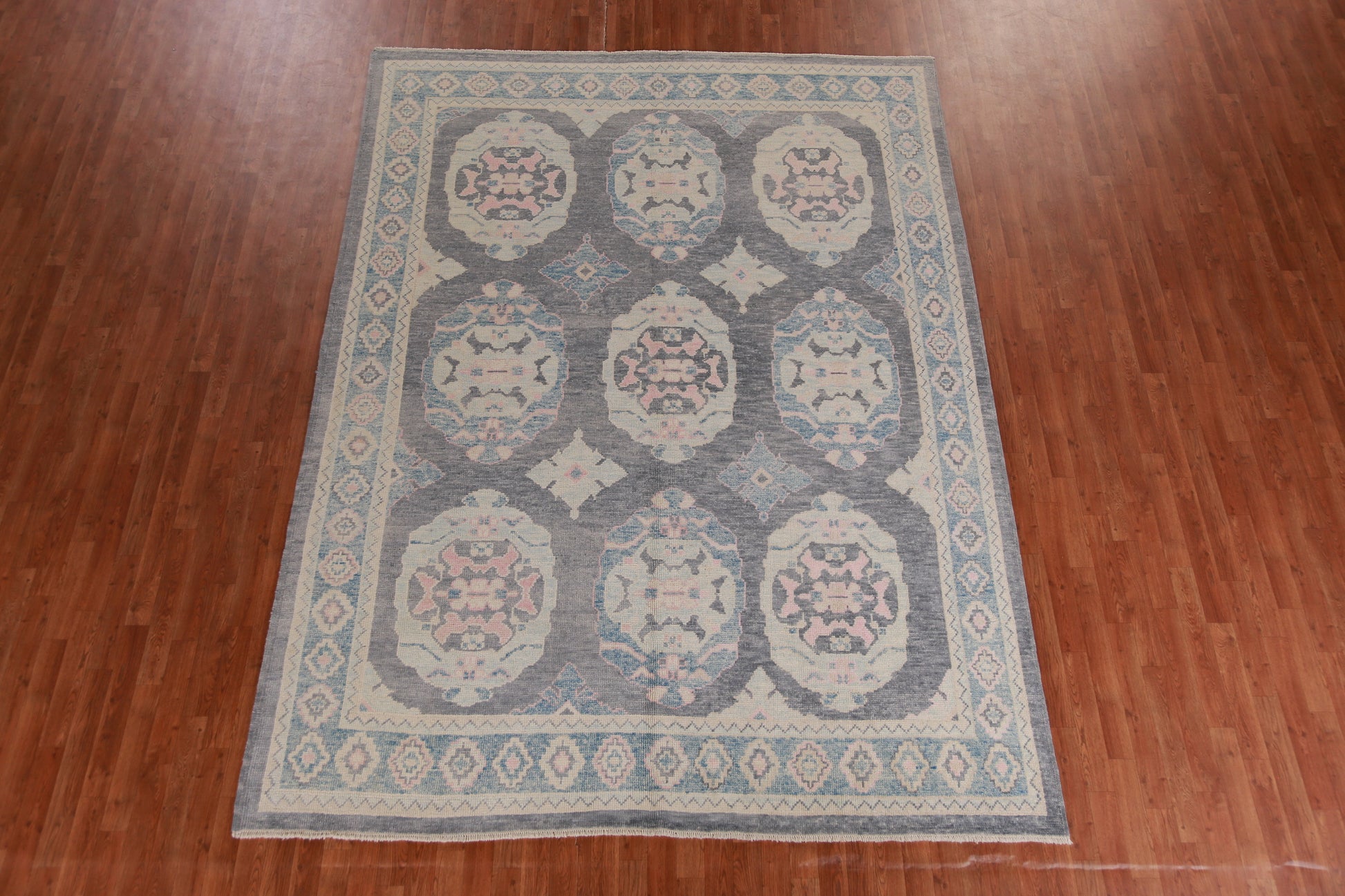A Beautiful Genuine Turkey Oushak rug is Hand Knotted by skillful weavers in Turkey with 100% Wool Material. This rug is in New, First Quality condition. dimensions are 11' 1'' X 8' 2'' in foot and 338 X 249 in centimeter. the primary color is Greys & Charcoal.